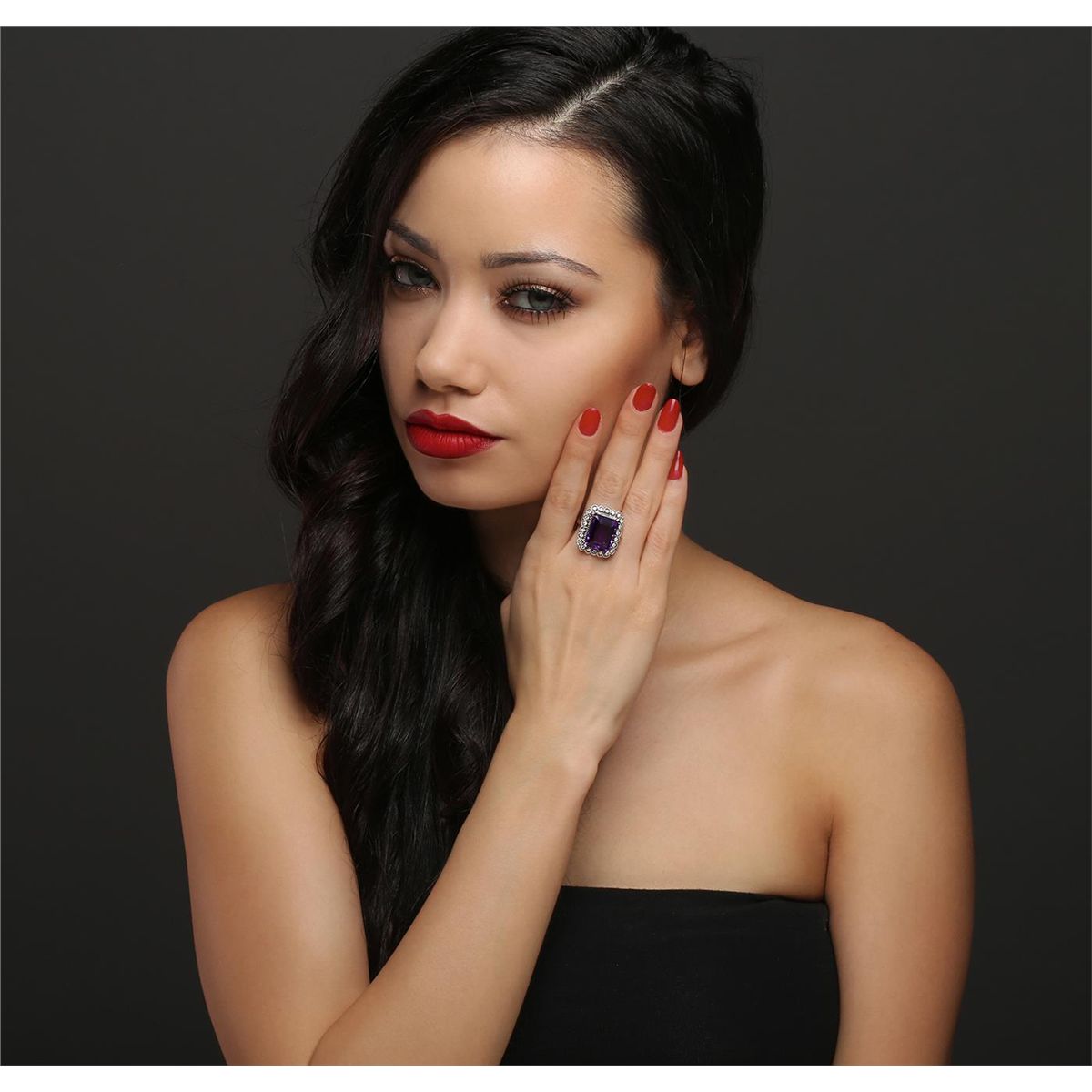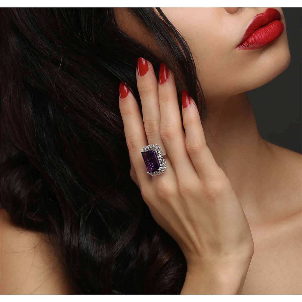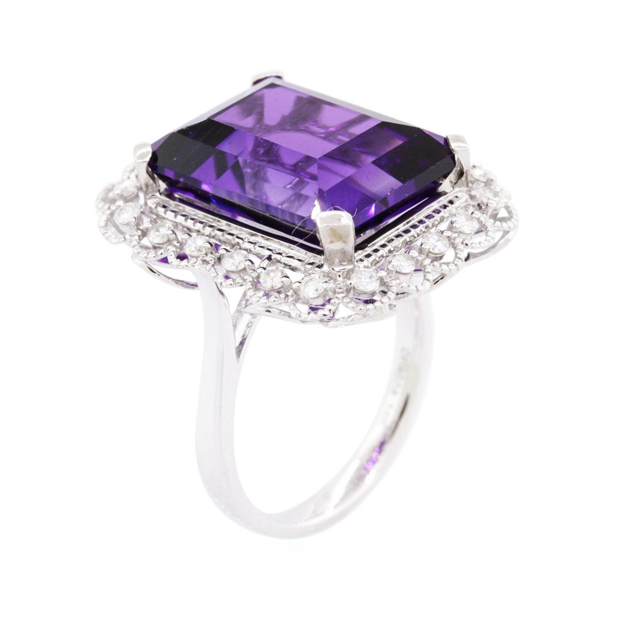 One electronically tested 14KT white gold ladies combination cast & assembled amethyst and diamond ring with a flat shank with a bright polish finish. Identified with markings of "14K". Condition is new. Containing: One prong set emerald standard step cut natural amethyst, measuring 16.09 x 12.18 x 7.92mm, approximate weight of 11.15ct., clarity is eye clean, type II, medium, moderately strong, purple color, (GIA P 5/4), cut is good. Twenty-Two prong set round brilliant cut diamonds, measuring 1.50 - 1.50 x 0.90mm (depth est.) approximate total weight of 22 Stones = 0.27ct. Clarity: I-1 to I-2. Color: I - J, Cut is Good. Colored gemstones are presumed to have been subjected to commonly used enhancement processes. All diamonds and colored gemstones are graded in the mounting, unless otherwise stated. Total Weight of Colored Stones 11.15ct. Total Weight of Diamonds 0.27ct. Total Weight of Ring 7.40 grams. GGL Appraised at $3,570.00.