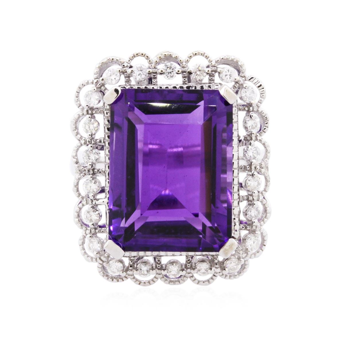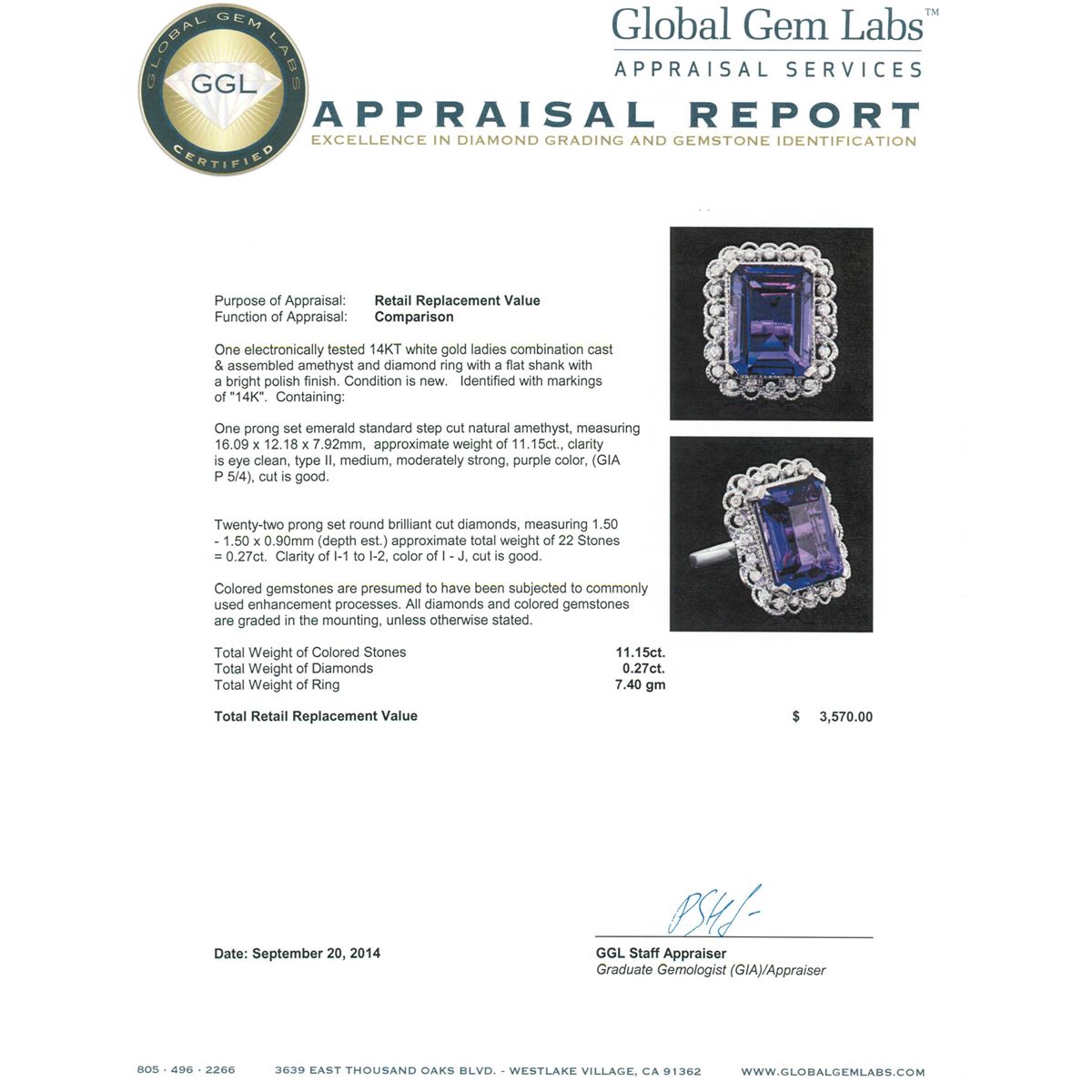 One electronically tested 14KT white gold ladies combination cast & assembled amethyst and diamond ring with a flat shank with a bright polish finish. Identified with markings of "14K". Condition is new. Containing: One prong set emerald standard step cut natural amethyst, measuring 16.09 x 12.18 x 7.92mm, approximate weight of 11.15ct., clarity is eye clean, type II, medium, moderately strong, purple color, (GIA P 5/4), cut is good. Twenty-Two prong set round brilliant cut diamonds, measuring 1.50 - 1.50 x 0.90mm (depth est.) approximate total weight of 22 Stones = 0.27ct. Clarity: I-1 to I-2. Color: I - J, Cut is Good. Colored gemstones are presumed to have been subjected to commonly used enhancement processes. All diamonds and colored gemstones are graded in the mounting, unless otherwise stated. Total Weight of Colored Stones 11.15ct. Total Weight of Diamonds 0.27ct. Total Weight of Ring 7.40 grams. GGL Appraised at $3,570.00.