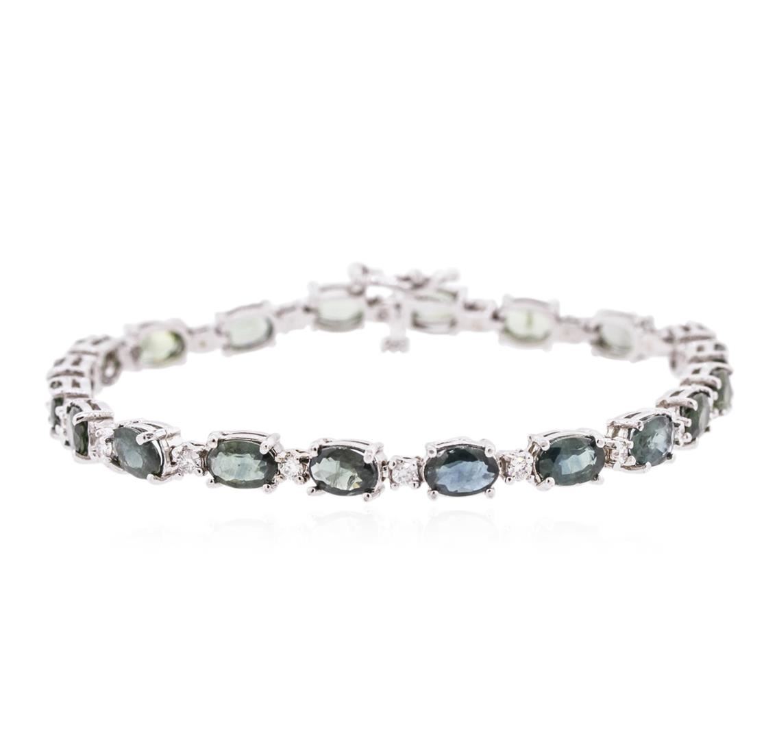 One electronically tested 14KT white gold ladies cast sapphire and diamond bracelet with a hidden box clasp with safety closer with a bright polish finish. Measurements: 7" in length Identified with markings of "14K". Condition is new. Containing: Twenty prong set oval modified brilliant cut natural green sapphires, measuring 7.10 x 3.80 x 2.47mm, approximate total weight of 11.20ct., clarity is moderately included, medium light, very slightly grayish, green color, (GIA G 4/3), cut is good. Twenty prong set round brilliant cut diamonds, measuring 2.00 - 2.00 x 1.20mm (depth est.) approximate total weight of 20 Stones = 0.58ct. Clarity: SI-1 to SI-2. Color: J - K, Cut is Good. Colored gemstones are presumed to have been subjected to commonly used enhancement processes. All diamonds and colored gemstones are graded in the mounting, unless otherwise stated. Total Weight of Colored Stones 11.20ct. Total Weight of Diamonds 0.58ct. Total Weight of Bracelet 12.00 grams. GGL Appraised at $4,940.00.