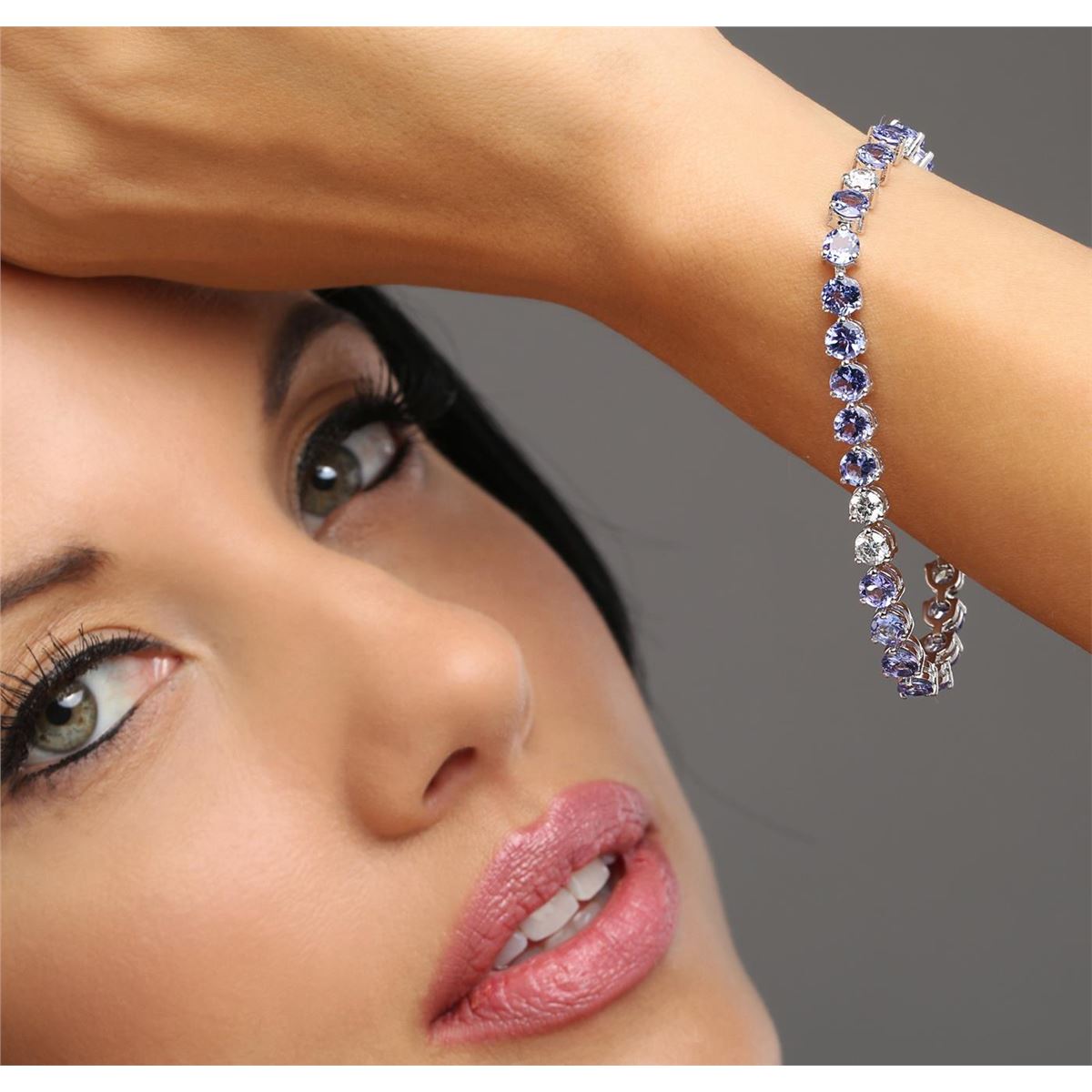 One electronically tested 14KT white gold ladies combination cast & assembled tanzanite and diamond bracelet with a hidden box clasp with a bright polish finish. Measurements: 7.25" in length. Identified with markings of "14K". Condition is new. Containing: Twenty-eight prong set round modified brilliant cut natural tanzanites, measuring 4.50 - 4.50 x 2.93 mm, approximate total weight of 11.20ct., clarity is eye clean, type I, medium light, moderately strong, violet color, (GIA V 4/4), cut is good. Four prong set round brilliant cut diamonds, measuring 4.50 - 4.50 x 2.70mm (depth est.) approximate total weight of 4 Stones = 1.33ct. Clarity: I-1. Color: I - J, Cut is Good. Colored gemstones are presumed to have been subjected to commonly used enhancement processes. All diamonds and colored gemstones are graded in the mounting, unless otherwise stated. Total Weight of Colored Stones 11.20ct. Total Weight of Diamonds 1.33ct. Total Weight of Bracelet 16.30 grams. GGL Appraised at $12,595.00.