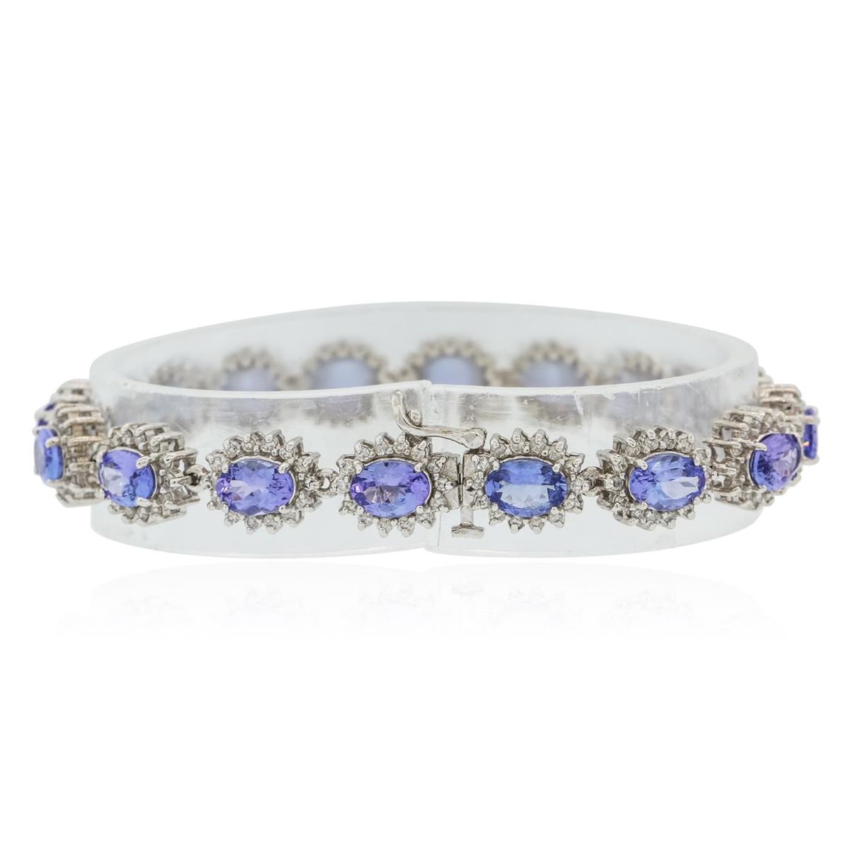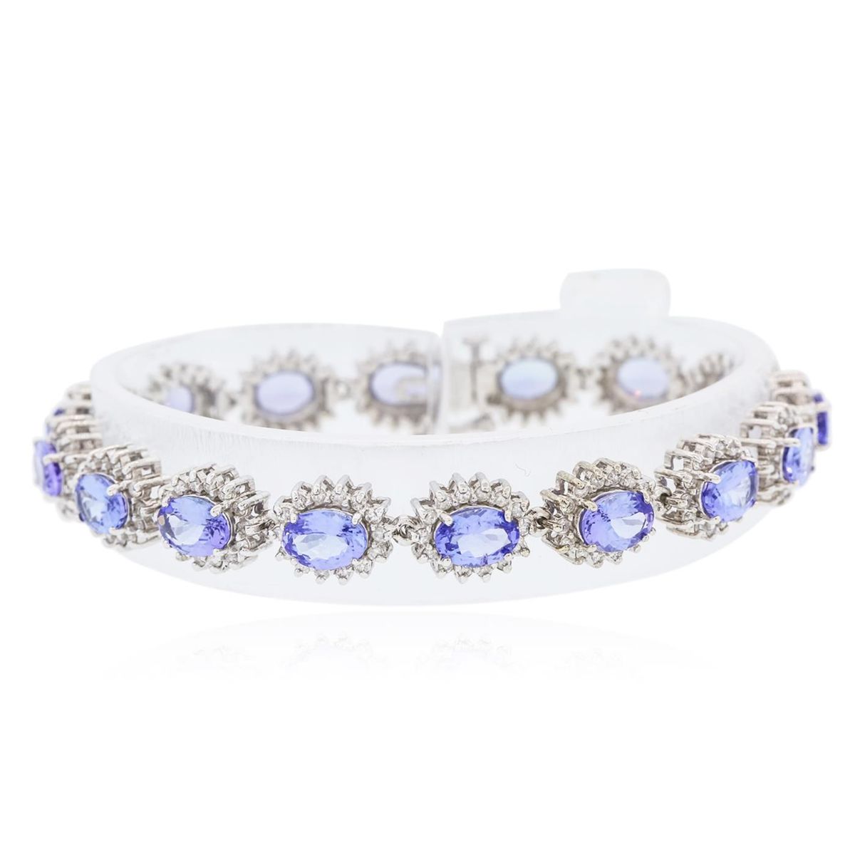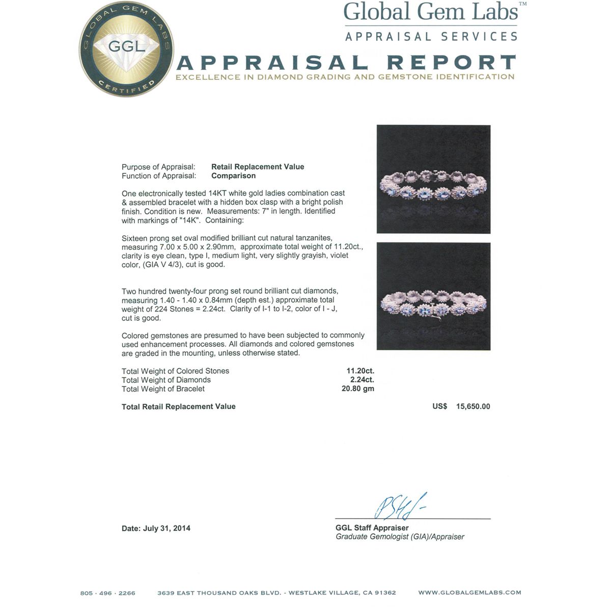 One electronically tested 14KT white gold ladies combination cast & assembled bracelet with a hidden box clasp with a bright polish finish. Condition is new. Measurements: 7" in length. Identified with markings of "14K". Containing: Sixteen prong set oval modified brilliant cut natural tanzanites, measuring 7.00 x 5.00 x 2.90mm, approximate. Total Weight of 11.20ct., clarity is eye clean, type I, medium light, very slightly grayish, violet color, (GIA V 4/3), cut is good. Two Hundred Twenty-Four prong set round brilliant cut diamonds, measuring 1.40 - 1.40 x 0.84mm (depth est.) approximate. Total Weight of 224 Stones = 2.24ct. Clarity: I-1 to I-2. Color: I - J, Cut is Good. Colored gemstones are presumed to have been subjected to commonly used enhancement processes. All diamonds and colored gemstones are graded in the mounting, unless otherwise stated. Total Weight of Colored Stones 11.20ct. Total Weight of Diamonds 2.24ct. Total Weight of Bracelet 20.80 grams. GGL Appraised at $15,650.00.