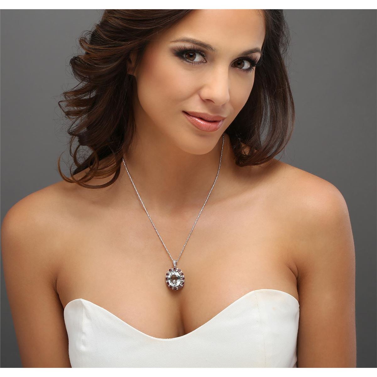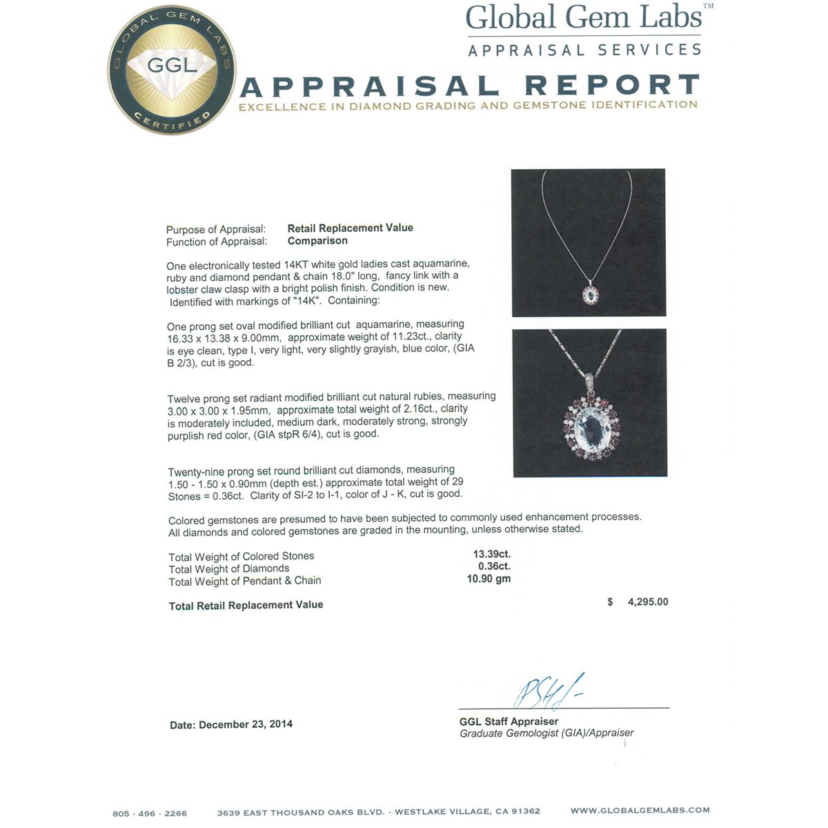 One electronically tested 14KT white gold ladies cast aquamarine, ruby and diamond pendant & chain 18.0" long, fancy link with a lobster claw clasp with a bright polish finish. Identified with markings of "14K". Condition is new. Containing: One prong set oval modified brilliant cut aquamarine, measuring 16.33 x 13.38 x 9.00mm, approximate weight of 11.23ct., clarity is eye clean, type I, very light, very slightly grayish, blue color, (GIA B 2/3), cut is good. Twelve prong set radiant modified brilliant cut natural rubies, measuring 3.00 x 3.00 x 1.95mm, approximate total weight of 2.16ct., clarity is moderately included, medium dark, moderately strong, strongly purplish red color, (GIA stpR 6/4), cut is good. Twenty-Nine prong set round brilliant cut diamonds, measuring 1.50 - 1.50 x 0.90mm (depth est.) approximate total weight of 29 Stones = 0.36ct. Clarity: SI-2 to I-1. Color: J - K, Cut is Good. Colored gemstones are presumed to have been subjected to commonly used enhancement processes. All diamonds and colored gemstones are graded in the mounting, unless otherwise stated. Total Weight of Colored Stones 13.39ct. Total Weight of Diamonds 0.36ct. Total Weight of Pendant & Chain 10.90 grams. GGL Appraised at $4,295.00.