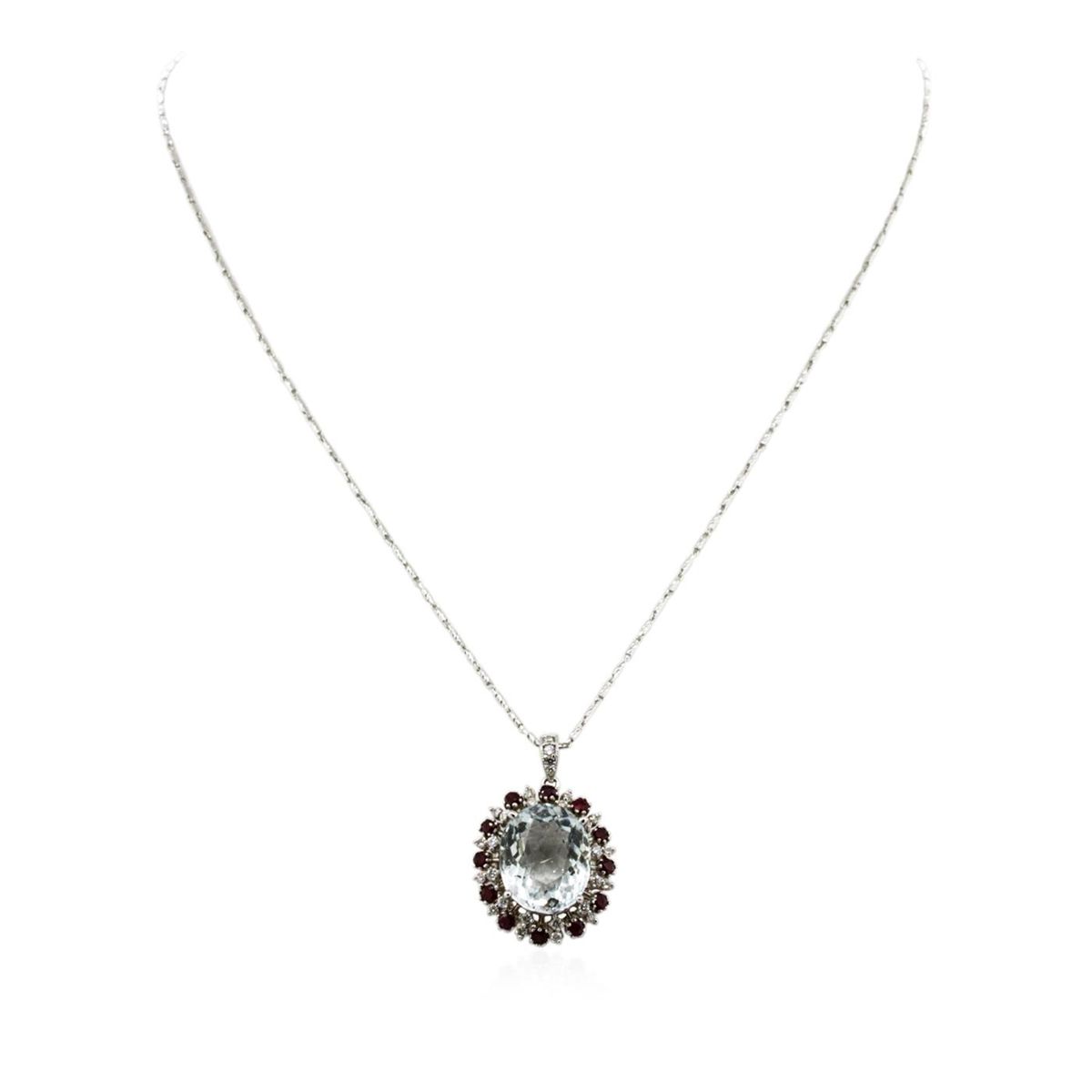 One electronically tested 14KT white gold ladies cast aquamarine, ruby and diamond pendant & chain 18.0" long, fancy link with a lobster claw clasp with a bright polish finish. Identified with markings of "14K". Condition is new. Containing: One prong set oval modified brilliant cut aquamarine, measuring 16.33 x 13.38 x 9.00mm, approximate weight of 11.23ct., clarity is eye clean, type I, very light, very slightly grayish, blue color, (GIA B 2/3), cut is good. Twelve prong set radiant modified brilliant cut natural rubies, measuring 3.00 x 3.00 x 1.95mm, approximate total weight of 2.16ct., clarity is moderately included, medium dark, moderately strong, strongly purplish red color, (GIA stpR 6/4), cut is good. Twenty-Nine prong set round brilliant cut diamonds, measuring 1.50 - 1.50 x 0.90mm (depth est.) approximate total weight of 29 Stones = 0.36ct. Clarity: SI-2 to I-1. Color: J - K, Cut is Good. Colored gemstones are presumed to have been subjected to commonly used enhancement processes. All diamonds and colored gemstones are graded in the mounting, unless otherwise stated. Total Weight of Colored Stones 13.39ct. Total Weight of Diamonds 0.36ct. Total Weight of Pendant & Chain 10.90 grams. GGL Appraised at $4,295.00.