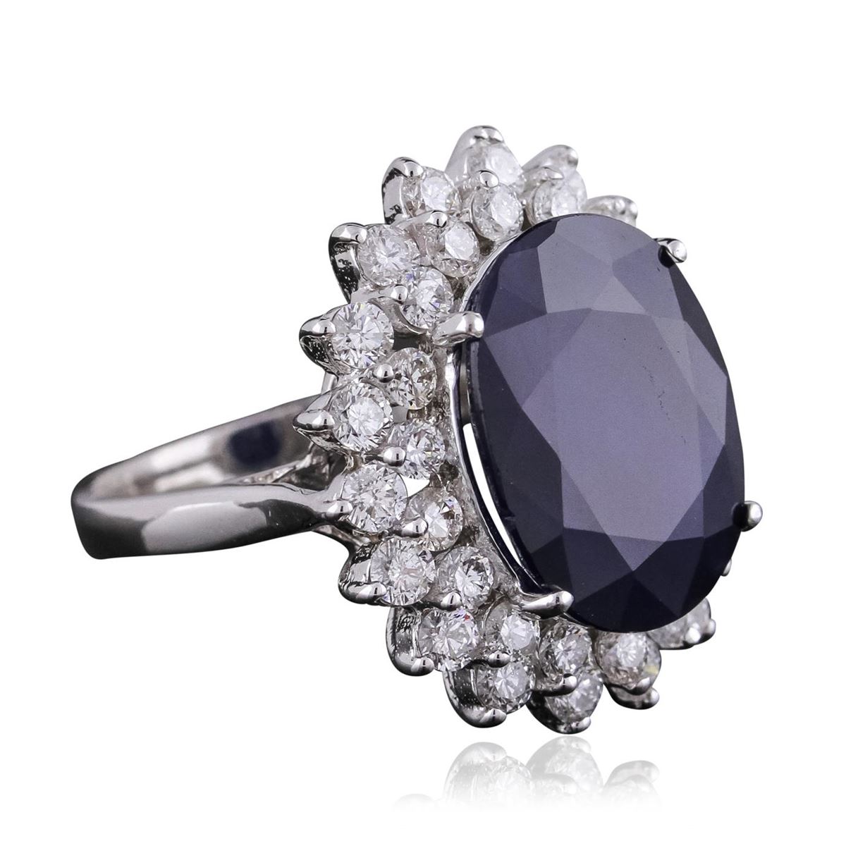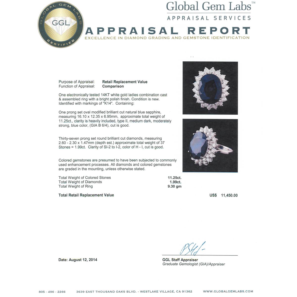 One electronically tested 14KT white gold ladies combination cast & assembled ring with a bright polish finish. Condition is new. Identified with markings of "K14". Containing: One prong set oval modified brilliant cut natural blue sapphire, measuring 16.10 x 12.35 x 6.95mm, approximate. Total Weight of 11.25ct., clarity is heavily included, type II, medium dark, moderately strong, blue color, (GIA B 6/4), cut is good. Thirty-Seven prong set round brilliant cut diamonds, measuring 2.60 - 2.30 x 1.47mm (depth est.) approximate. Total Weight of 37 Stones = 1.99ct. Clarity: SI-2 to I-2. Color: H - I, Cut is Good. Colored gemstones are presumed to have been subjected to commonly used enhancement processes. All diamonds and colored gemstones are graded in the mounting, unless otherwise stated. Total Weight of Colored Stones 11.25ct. Total Weight of Diamonds 1.99ct. Total Weight of Ring 9.30 grams. GGL Appraised at $11,450.00.