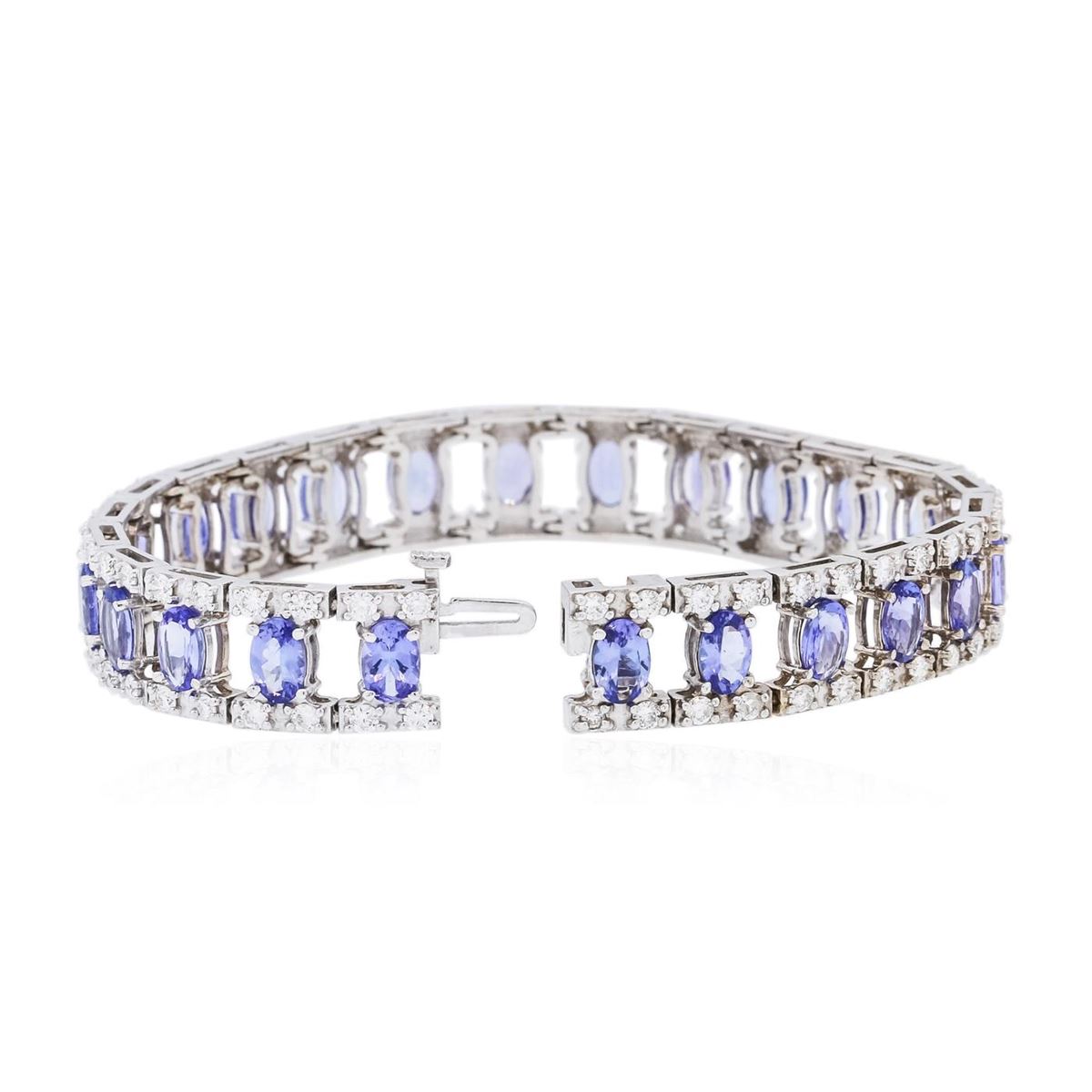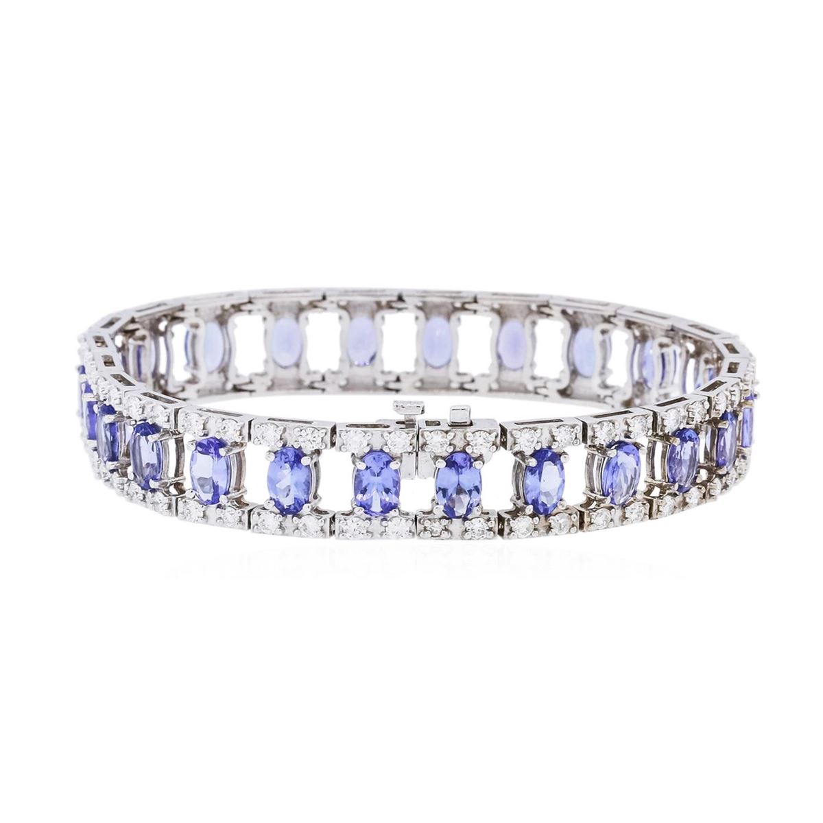 One electronically tested 14KT white gold ladies combination cast & assembled tanzanite and diamond bracelet with a hidden box clasp with a bright polish finish. Measurements: 7" in length. Identified with markings of "14K". Condition is new. Containing: Twenty-five prong set oval modified brilliant cut natural tanzanites, measuring 5.88 x 4.15 x 2.69mm, approximate total weight of 11.25ct., clarity is eye clean, type I, medium, moderately strong, violet color, (GIA V 5/4), cut is good. One Hundred prong set round brilliant cut diamonds, measuring 1.50 - 1.50 x 0.90mm (depth est.) approximate total weight of 100 Stones = 1.23ct. Clarity: SI-2 to I-2. Color: I - J, Cut is Good. Colored gemstones are presumed to have been subjected to commonly used enhancement processes. All diamonds and colored gemstones are graded in the mounting, unless otherwise stated. Total Weight of Colored Stones 11.25ct. Total Weight of Diamonds 1.23ct. Total Weight of Bracelet 22.60 grams. GGL Appraised at $19,135.00.