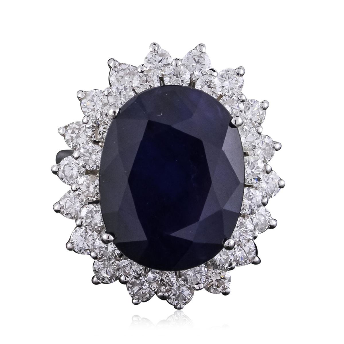 One electronically tested 14KT white gold ladies combination cast & assembled ring with a bright polish finish. Condition is new. Identified with markings of "K14". Containing: One prong set oval modified brilliant cut natural blue sapphire, measuring 16.10 x 12.35 x 6.95mm, approximate. Total Weight of 11.25ct., clarity is heavily included, type II, medium dark, moderately strong, blue color, (GIA B 6/4), cut is good. Thirty-Seven prong set round brilliant cut diamonds, measuring 2.60 - 2.30 x 1.47mm (depth est.) approximate. Total Weight of 37 Stones = 1.99ct. Clarity: SI-2 to I-2. Color: H - I, Cut is Good. Colored gemstones are presumed to have been subjected to commonly used enhancement processes. All diamonds and colored gemstones are graded in the mounting, unless otherwise stated. Total Weight of Colored Stones 11.25ct. Total Weight of Diamonds 1.99ct. Total Weight of Ring 9.30 grams. GGL Appraised at $11,450.00.