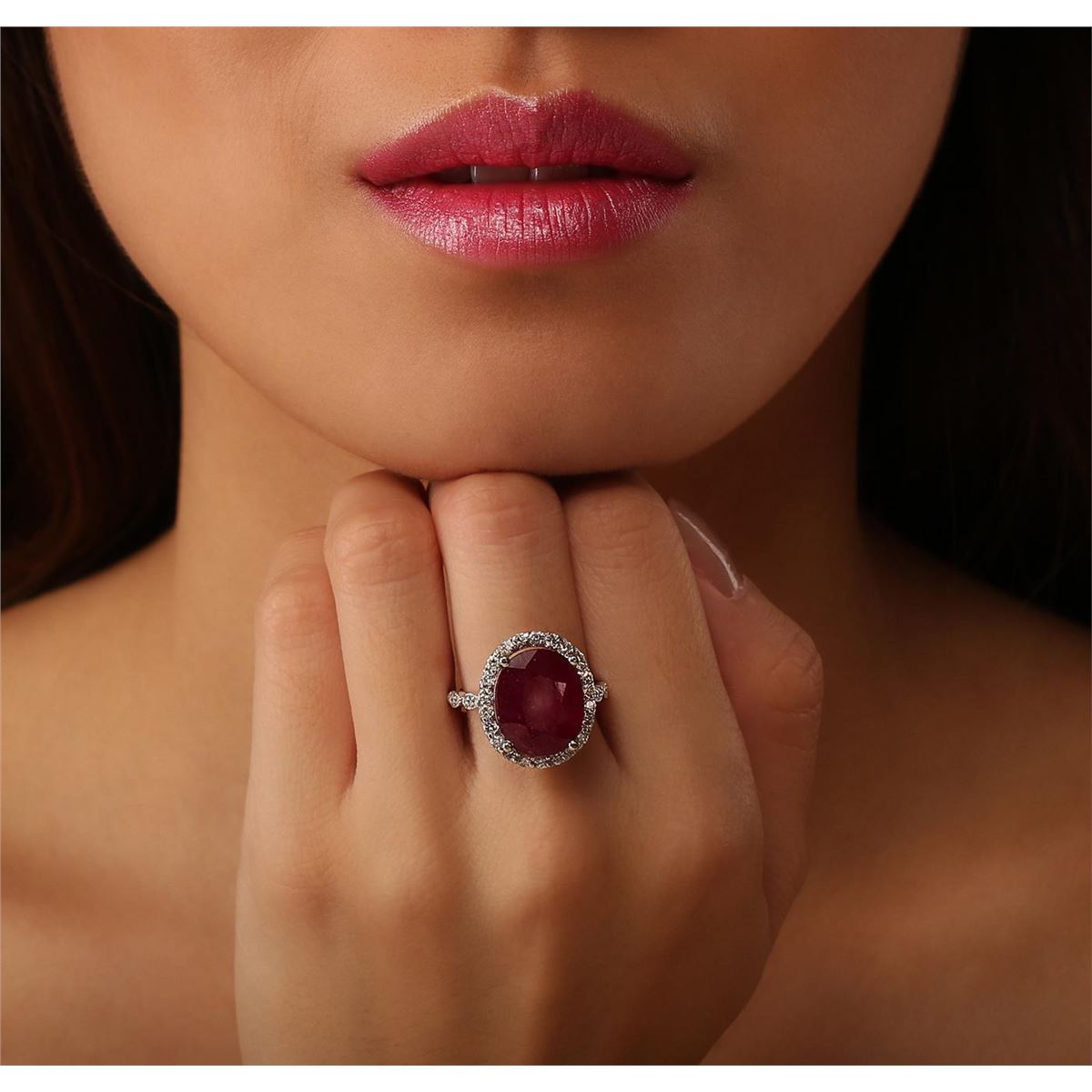 One electronically tested 14KT white gold ladies cast ruby and diamond ring. Condition is new, good workmanship. The featured ruby is set within a diamond bezel supported by diamond accented shoulders, completed by a one and one-half millimeter wide band. Bright polish finish with milgrain detailing. Trademark is PMI. Identified with markings of "14K". Containing: One prong set oval mixed cut natural ruby, measuring 14.50 x 12.00 x 7.30mm, 10%. bulge factor, approximate weight of 11.28ct., clarity is heavily included, type II, dark, very slightly brownish, slightly purplish red color, (GIA slpR 7/3), cut is good. Transmitting light somewhat diffusely, transparent to translucent. Naturally occurring internal & external characteristics are present. Indications of laboratory high temperature heat treatment, with glass & flux additives. Graded in the setting. Ruby has a low tolerance to rhodium plating, repolishing the surface, & ultrasonic cleaning. Thirty-Four prong set round brilliant cut diamonds, measuring 1.80 - 1.20 x 0.90mm (depth est.) approximate. Total Weight of 34 Stones = 0.51ct. Graded in the setting. Clarity: SI-2 to I-1. Color: H - J. Total Weight of Colored Stones 11.28ct. Total Weight of Diamonds 0.51ct. Total Weight of Ring 7.10 grams. AIG Appraised at $4,790.00.