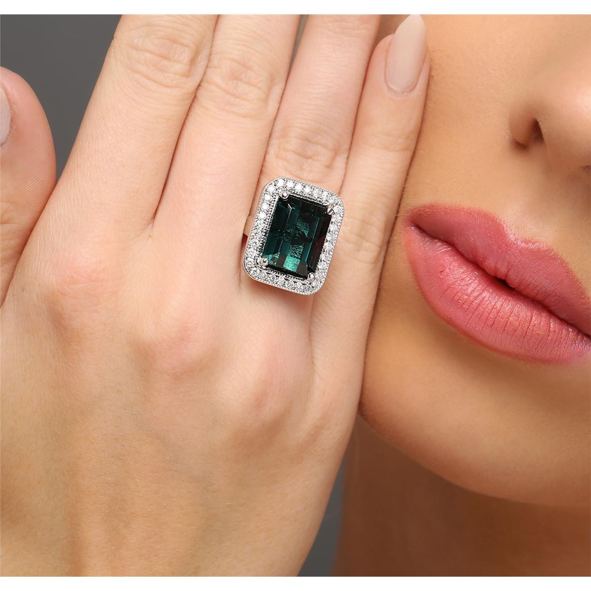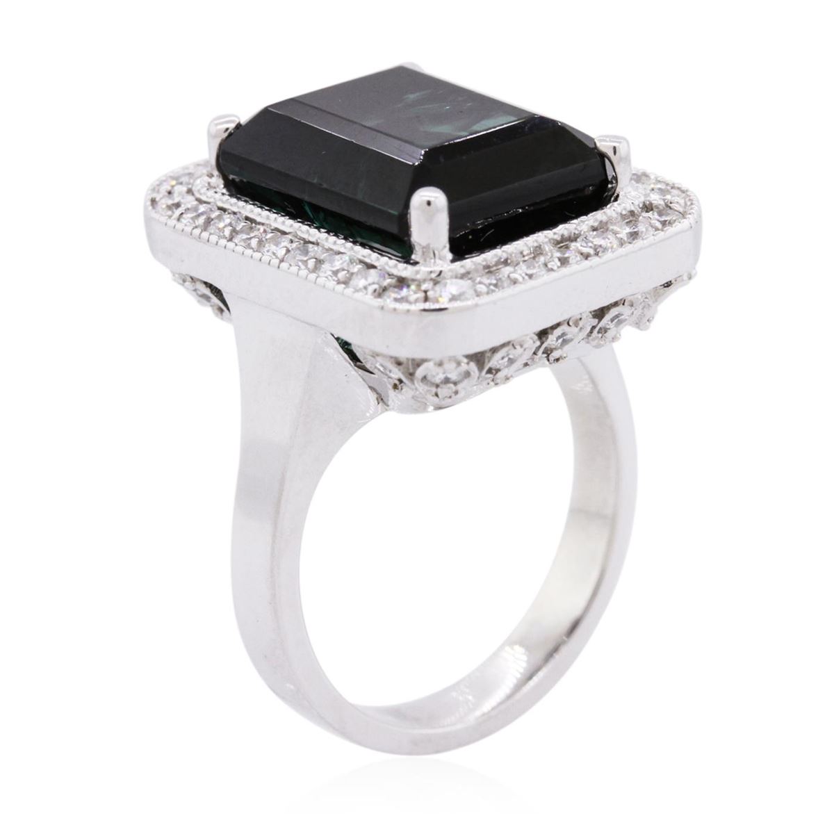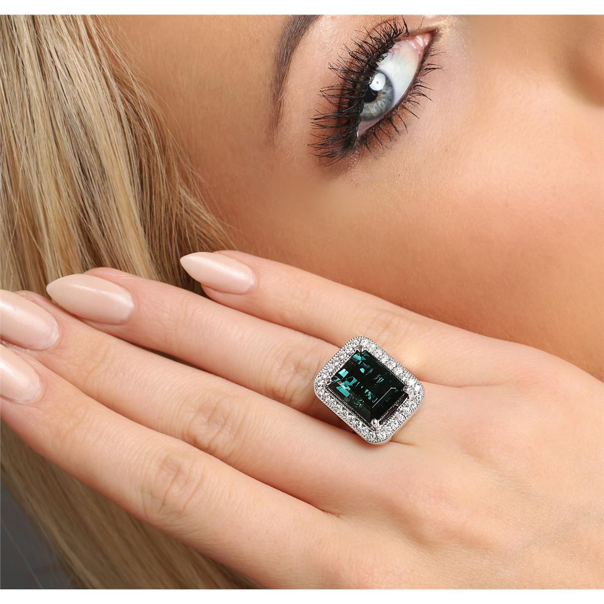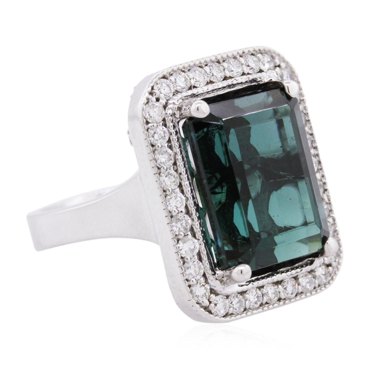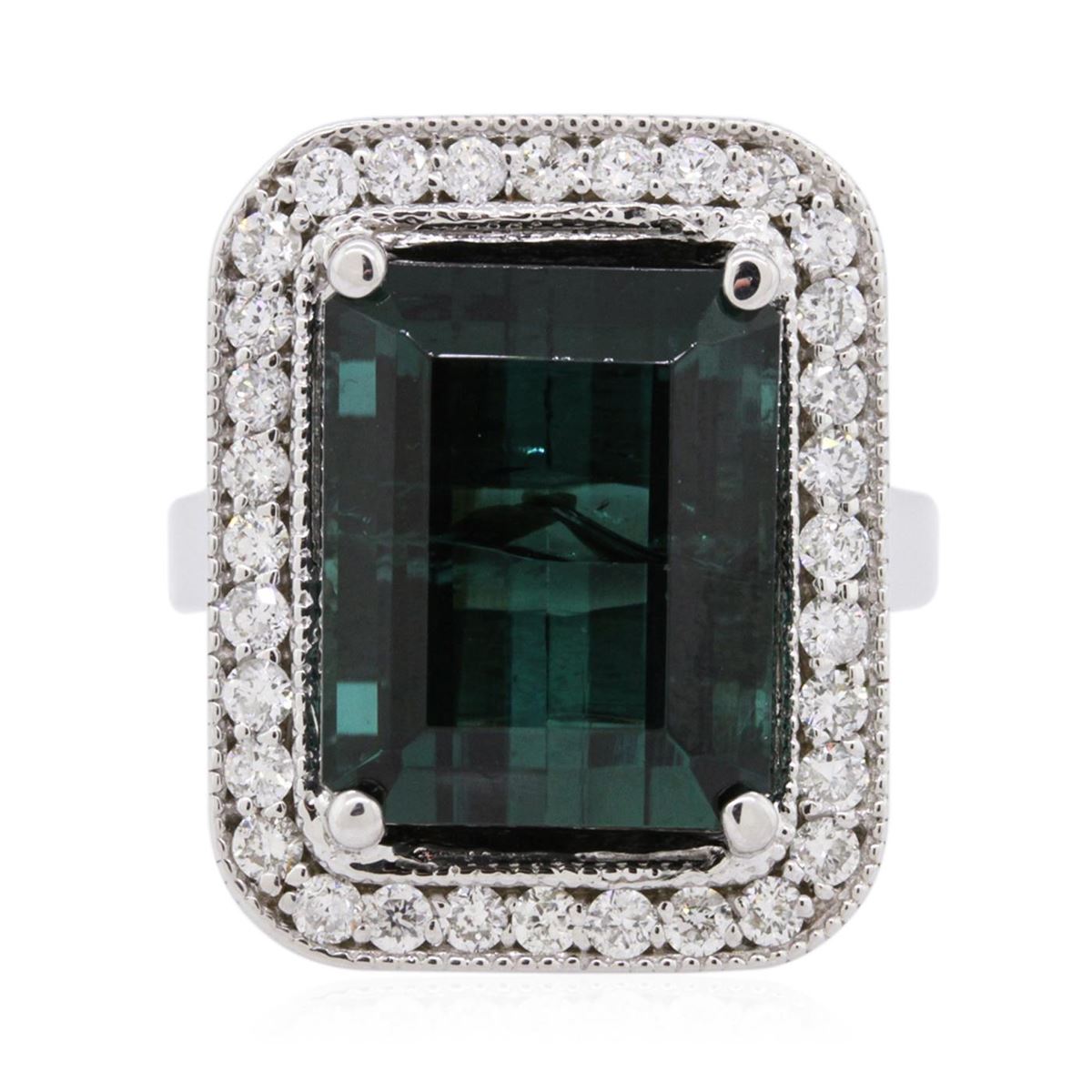 One electronically tested 14KT white gold ladies combination cast & assembled tourmaline and diamond ring with a flat shank with a bright polish finish. Identified with markings of "14K". Condition is new. Containing: One prong set emerald standard step cut natural blue/green tourmaline, measuring 13.95 x 11.30 x 8.68mm, approximate weight of 11.30ct., clarity is eye clean, type I, medium, moderately strong, greenish blue color, (GIA gB 5/4), cut is good. Forty-Six prong set round brilliant cut diamonds, measuring 1.50 - 1.50 x 0.90mm (depth est.) approximate total weight of 46 Stones = 0.57ct. Clarity: SI-1 to SI-2. Color: H - I, Cut is Good. All diamonds and colored gemstones are graded in the mounting, unless otherwise stated. Colored gemstones are presumed to have been subjected to commonly used enhancement processes. Total Weight of Colored Stones 11.30ct. Total Weight of Diamonds 0.57ct. Total Weight of Ring 14.40 grams. GGL Appraised at $13,440.00.