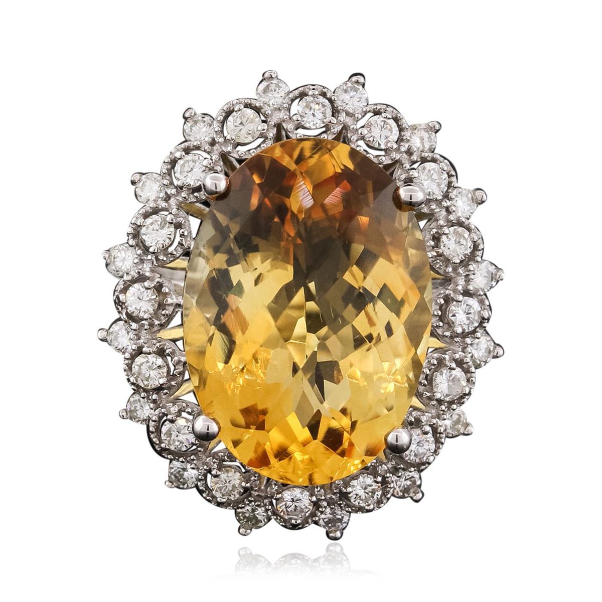 One electronically tested 14KT white gold ladies combination cast & assembled ring with a cathedral shank with a bright polish finish. Identified with markings of "14K". Condition is new. Containing: One prong set oval modified brilliant cut natural citrine quartz, measuring 18.02 x 12.85 x 8.92mm, approximate weight of 11.31ct., clarity is eye clean, type I, medium light, brownish, orangy yellow color, (GIA oY 4/3), cut is very good. Thirty-Two prong set round brilliant cut diamonds, measuring 1.50 - 1.50 x 0.90mm (depth est.) approximate total weight of 32 Stones = 0.39ct. Clarity: SI-2 to I-1. Color: I - J, Cut is Good. Colored gemstones are presumed to have been subjected to commonly used enhancement processes. All diamonds and colored gemstones are graded in the mounting, unless otherwise stated. Total Weight of Colored Stones 11.31ct. Total Weight of Diamonds 0.39ct. Total Weight of Ring 7.50 grams. GGL Appraised at $3,935.00.