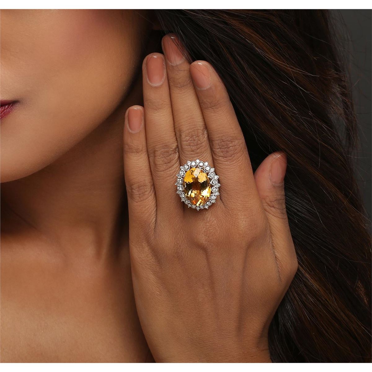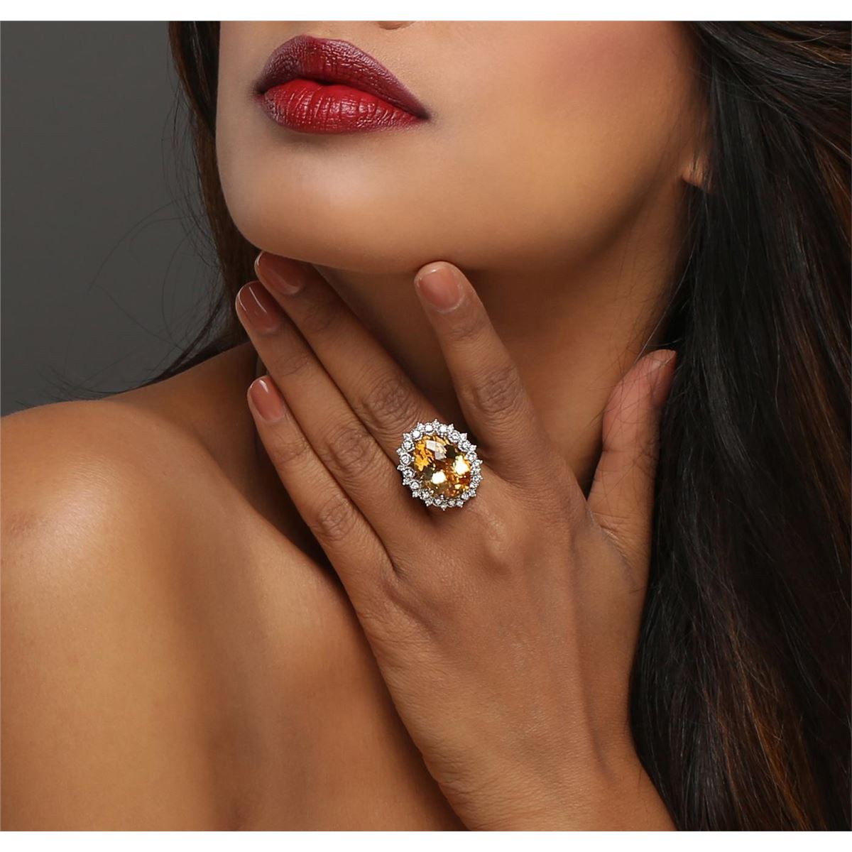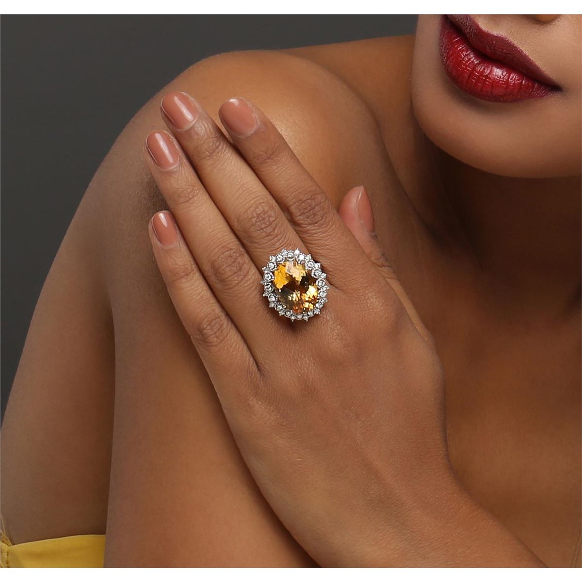One electronically tested 14KT white gold ladies combination cast & assembled ring with a cathedral shank with a bright polish finish. Identified with markings of "14K". Condition is new. Containing: One prong set oval modified brilliant cut natural citrine quartz, measuring 18.02 x 12.85 x 8.92mm, approximate weight of 11.31ct., clarity is eye clean, type I, medium light, brownish, orangy yellow color, (GIA oY 4/3), cut is very good. Thirty-Two prong set round brilliant cut diamonds, measuring 1.50 - 1.50 x 0.90mm (depth est.) approximate total weight of 32 Stones = 0.39ct. Clarity: SI-2 to I-1. Color: I - J, Cut is Good. Colored gemstones are presumed to have been subjected to commonly used enhancement processes. All diamonds and colored gemstones are graded in the mounting, unless otherwise stated. Total Weight of Colored Stones 11.31ct. Total Weight of Diamonds 0.39ct. Total Weight of Ring 7.50 grams. GGL Appraised at $3,935.00.
