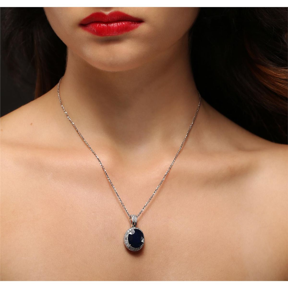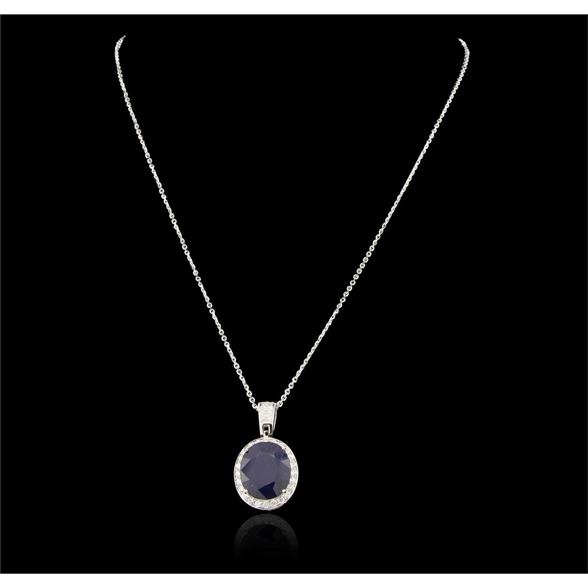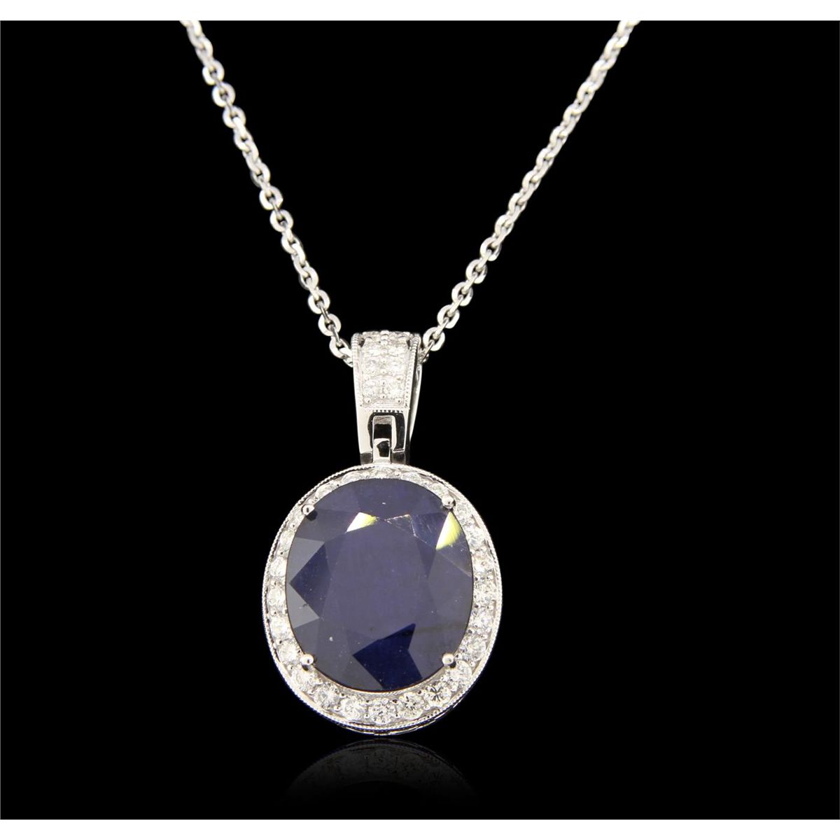 One electronically tested 14KT white gold Ladies combination cast & die struck pendant & chain 18.0" long, medium open cable link with a lobster claw clasp with a bright polish finish. Identified with markings of "14K". Condition is excellent. Containing: One prong set oval modified brilliant cut natural blue sapphire, measuring 15.00 x 13.00 x 8.45mm, approximate weight of 11.35ct., clarity is heavily included, type II, dark, moderately strong, blue color, (GIA B 7/4), cut is good. Colored gemstones are presumed to have been subjected to commonly used and possible undetectable color/clarity enhancement processes. Thirty-Two prong set round brilliant cut diamonds, measuring 1.60 - 1.30 x 0.78mm (depth est.) approximate total weight of 32 Stones = 0.73ct. Clarity of SI-1 to SI-2, Color of F - H, Cut is Good. Total Weight of Colored Stone 11.35ct. Total Weight of Diamonds 0.73ct. Total Weight of Pendant & Chain 8.90gm. GGL Appraised at $5,785.00.