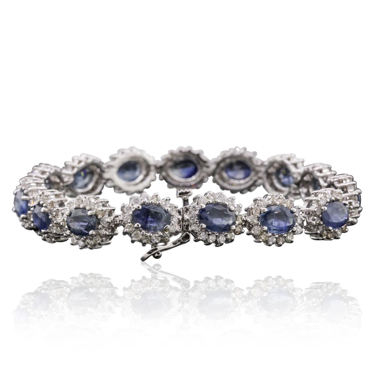One electronically tested 14KT white gold Ladies combination cast & assembled bracelet with a hidden box clasp with a bright polish finish. Measurements: 6.75" in length. Identified with markings of "14K". Condition is new. Containing: Fifteen prong set oval modified brilliant cut natural blue sapphires, measuring 6.98 x 5.05 x 2.62mm, approximate. Total Weight of 11.40ct., clarity is moderately included, type II, medium, blue color, (GIA B 5/0), cut is good. Colored gemstones are presumed to have been subjected to commonly used color/clarity enhancement processes. Two Hundred Ten prong set round brilliant cut diamonds, measuring 1.50 - 1.50 x 0.90mm (depth est.) approximate. Total Weight of 210 Stones = 2.58ct. Clarity: I-1 to I-2. Color: J - K, Cut is Good. Total Weight of Colored Stones 11.40ct. Total Weight of Diamonds 2.58ct. Total Weight of Bracelet 22.80 grams. GGL Appraised at $13,525.00.