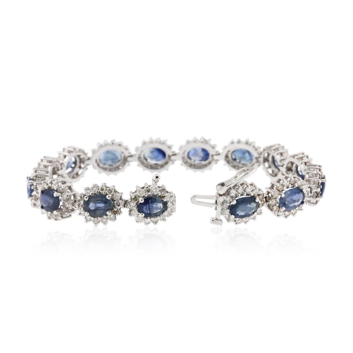 One electronically tested 14KT white gold Ladies combination cast & assembled bracelet with a hidden box clasp with a bright polish finish. Measurements: 6.75" in length. Identified with markings of "14K". Condition is new. Containing: Fifteen prong set oval modified brilliant cut natural blue sapphires, measuring 6.98 x 5.05 x 2.62mm, approximate. Total Weight of 11.40ct., clarity is moderately included, type II, medium, blue color, (GIA B 5/0), cut is good. Colored gemstones are presumed to have been subjected to commonly used color/clarity enhancement processes. Two Hundred Ten prong set round brilliant cut diamonds, measuring 1.50 - 1.50 x 0.90mm (depth est.) approximate. Total Weight of 210 Stones = 2.58ct. Clarity: I-1 to I-2. Color: J - K, Cut is Good. Total Weight of Colored Stones 11.40ct. Total Weight of Diamonds 2.58ct. Total Weight of Bracelet 22.80 grams. GGL Appraised at $13,525.00.