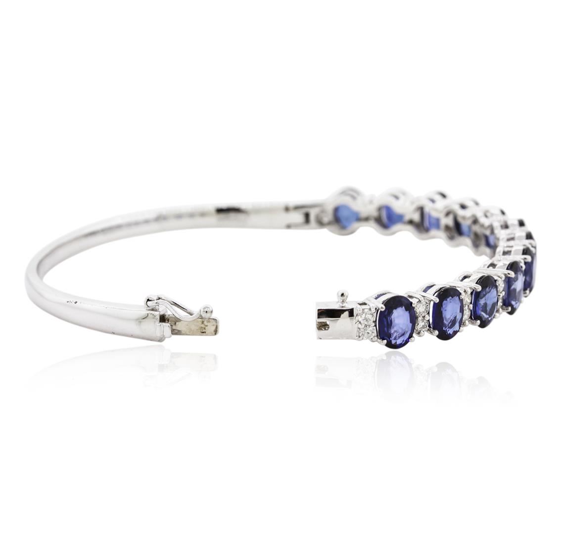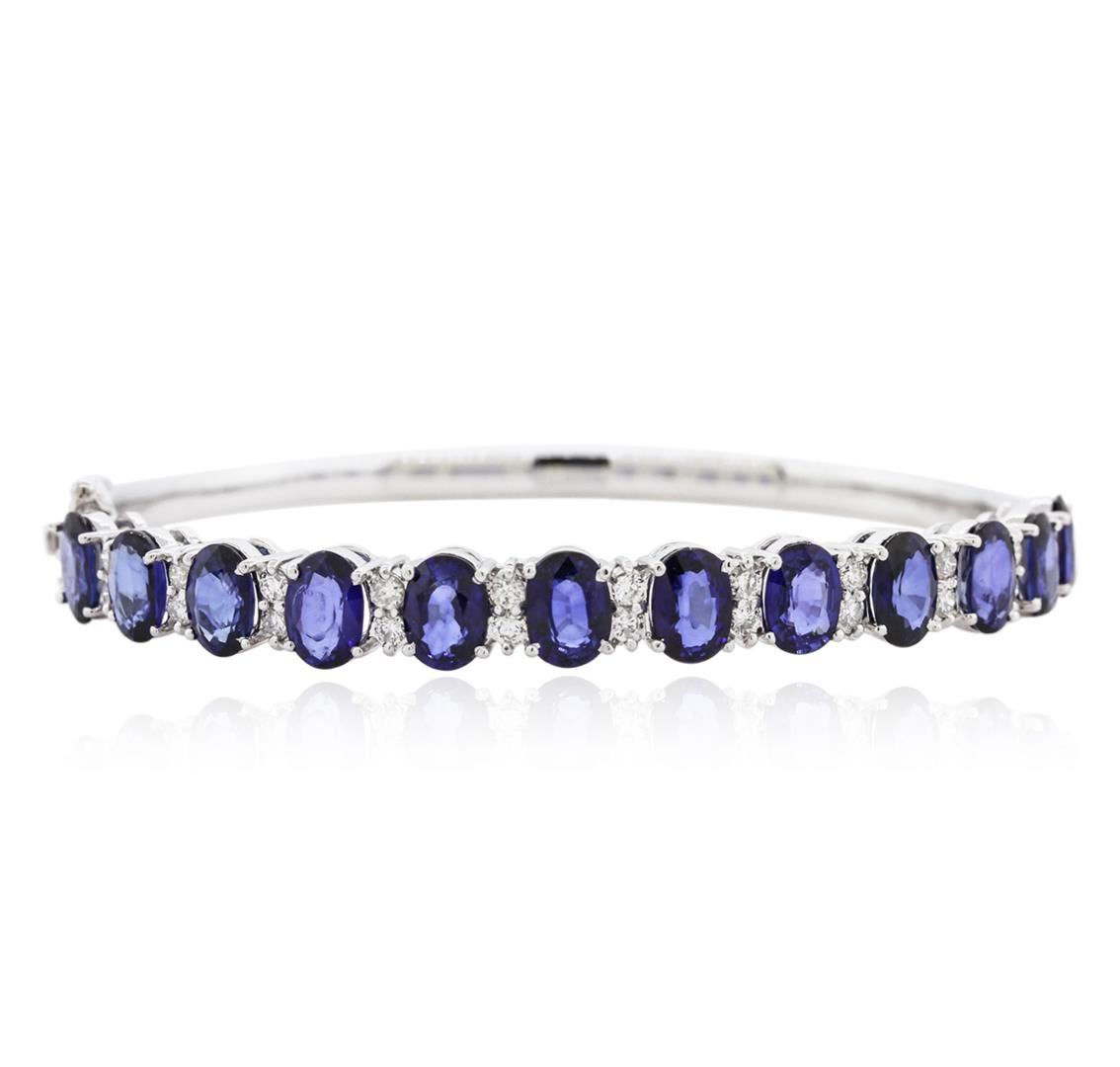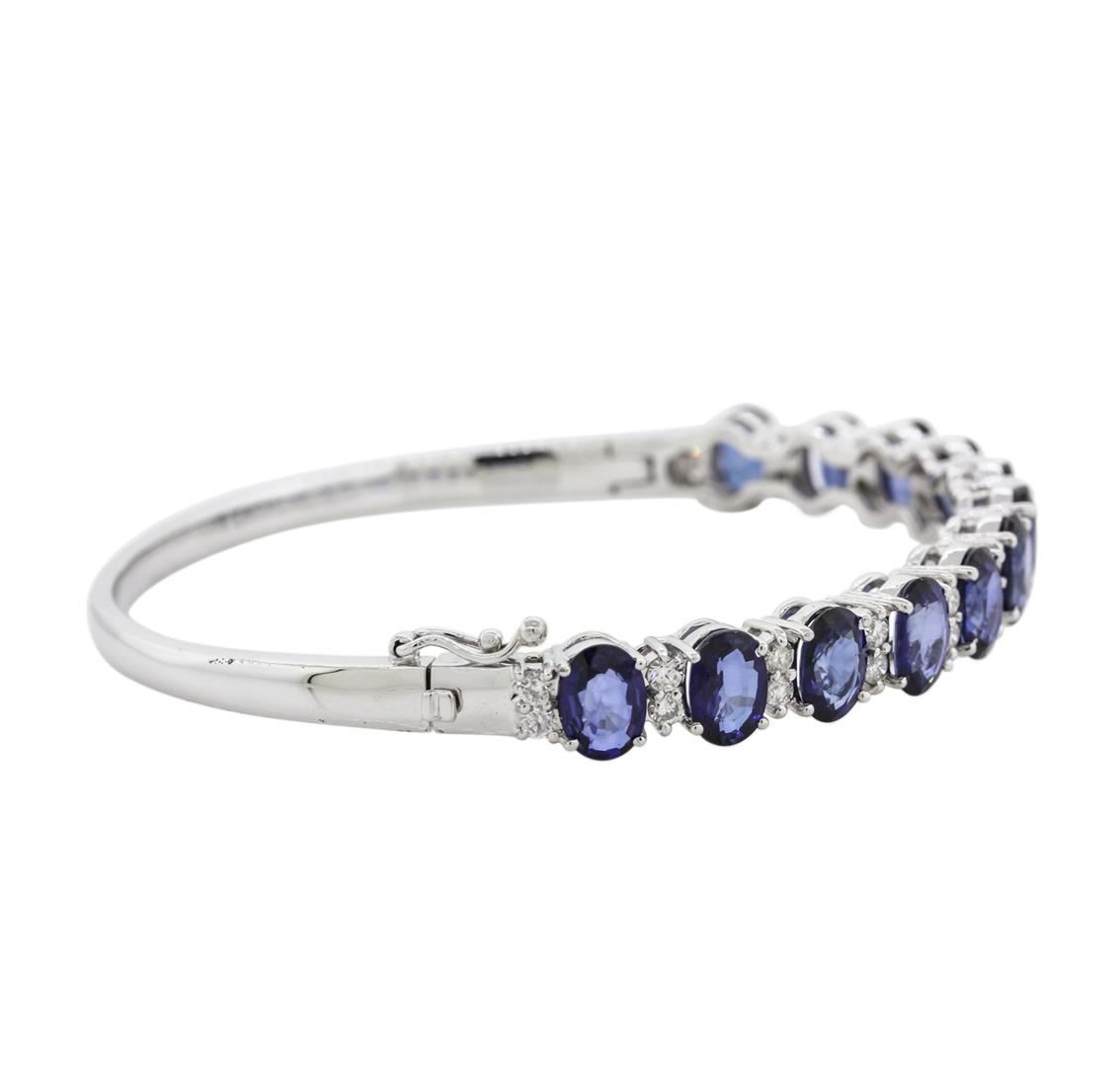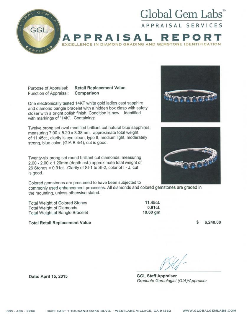 One electronically tested 14KT white gold ladies cast sapphire and diamond bangle bracelet with a hidden box clasp with safety closer with a bright polish finish. Identified with markings of "14K". Condition is new. Containing: Twelve prong set oval modified brilliant cut natural blue sapphires, measuring 7.00. x 5.20 x 3.38mm, approximate total weight of 11.45ct., clarity is eye clean, type II, medium light, moderately strong, blue color, (GIA B 4/4), cut is good. Twenty-Six prong set round brilliant cut diamonds, measuring 2.00. - 2.00. x 1.20mm (depth est.) approximate total weight of 26 Stones = 0.91ct. Clarity: SI-1 to SI-2. Color: I - J, Cut is Good. Colored gemstones are presumed to have been subjected to commonly used enhancement processes. All diamonds and colored gemstones are graded in the mounting, unless otherwise stated. Total Weight of Colored Stones 11.45ct. Total Weight of Diamonds 0.91ct. Total Weight of Bangle Bracelet 19.60 grams. GGL Appraised at $6,240.00.