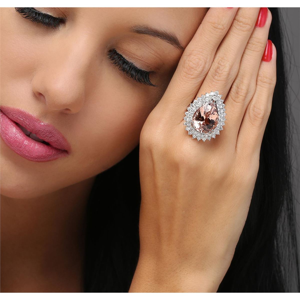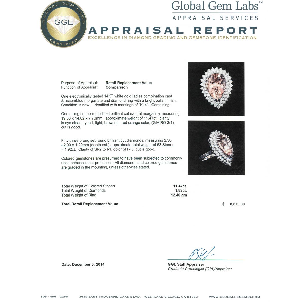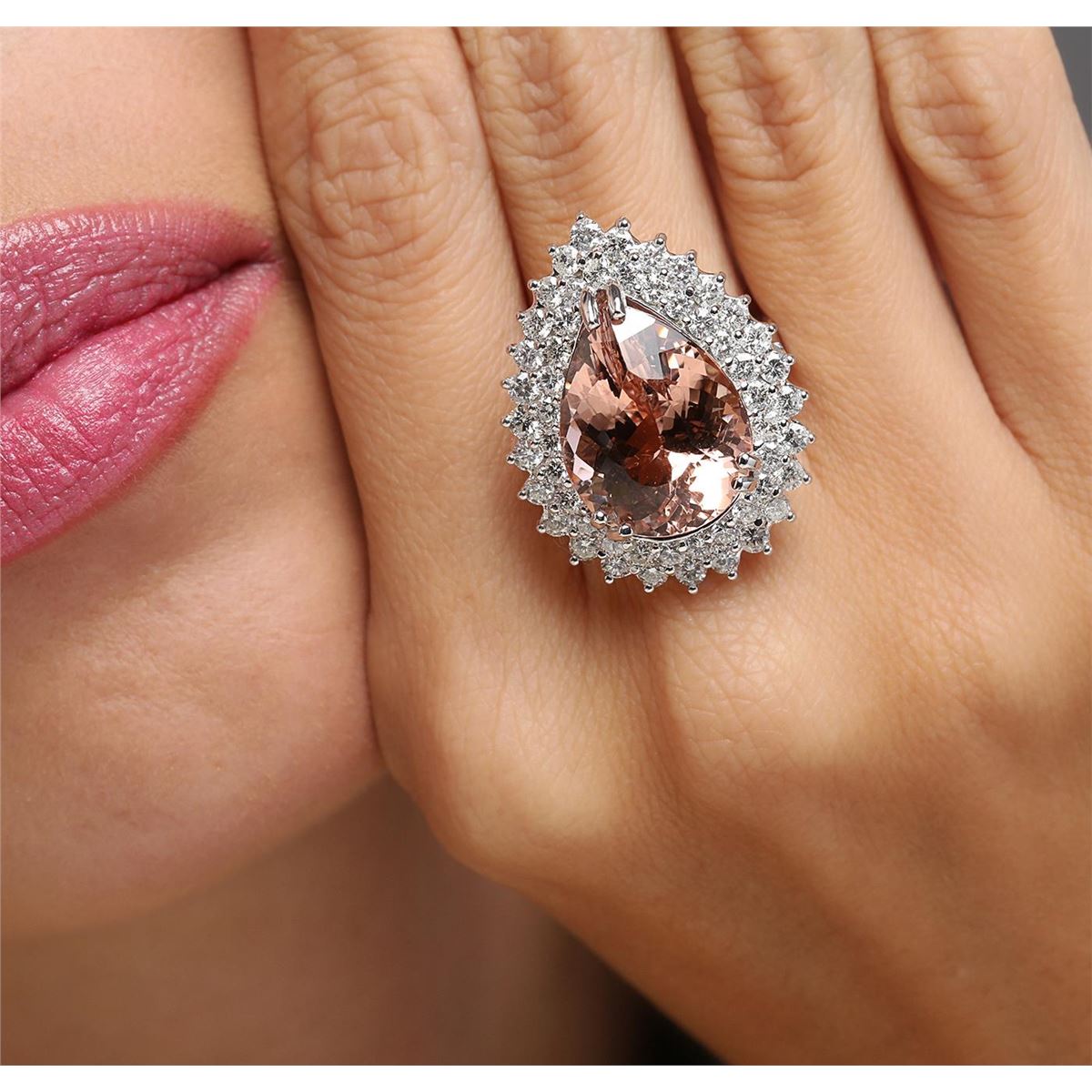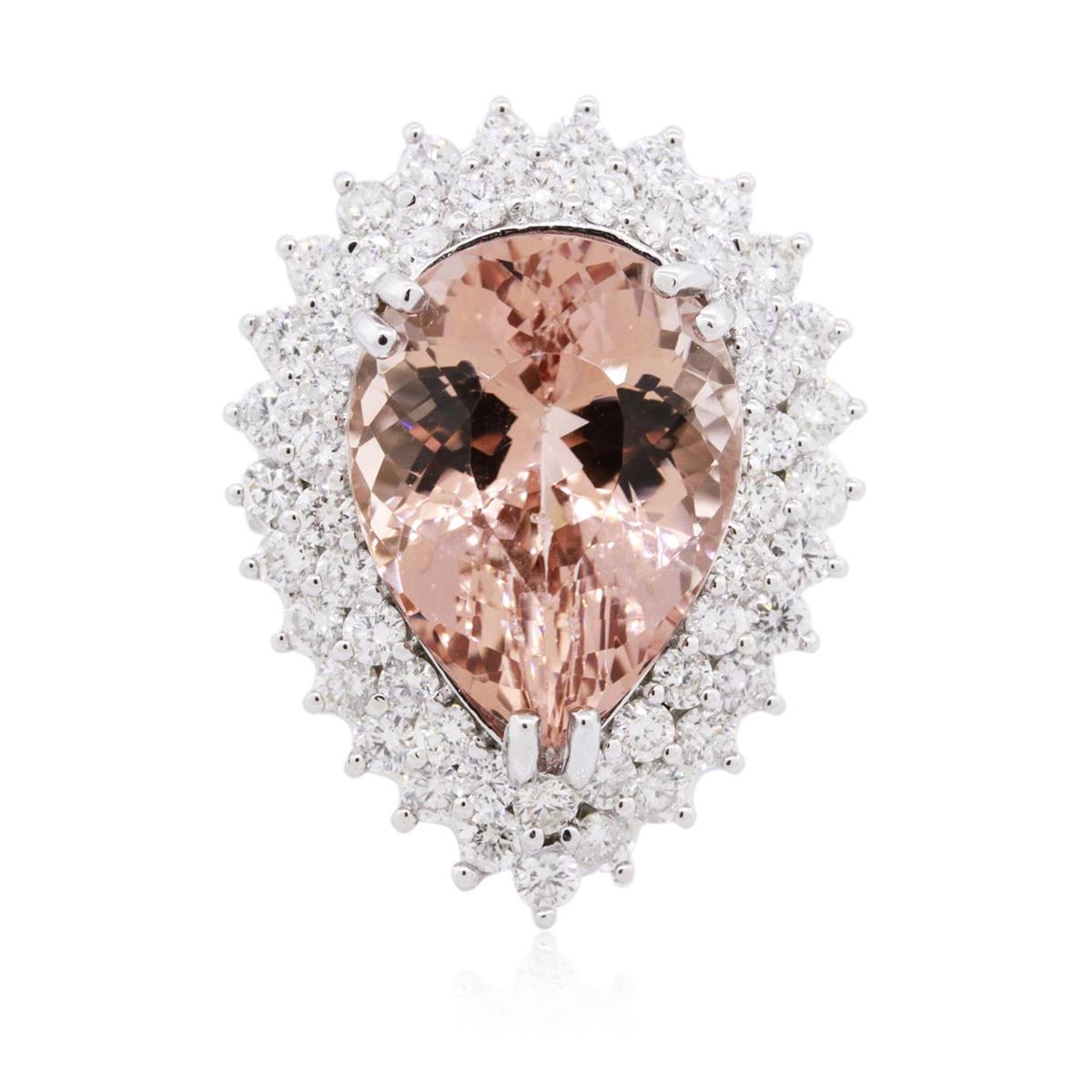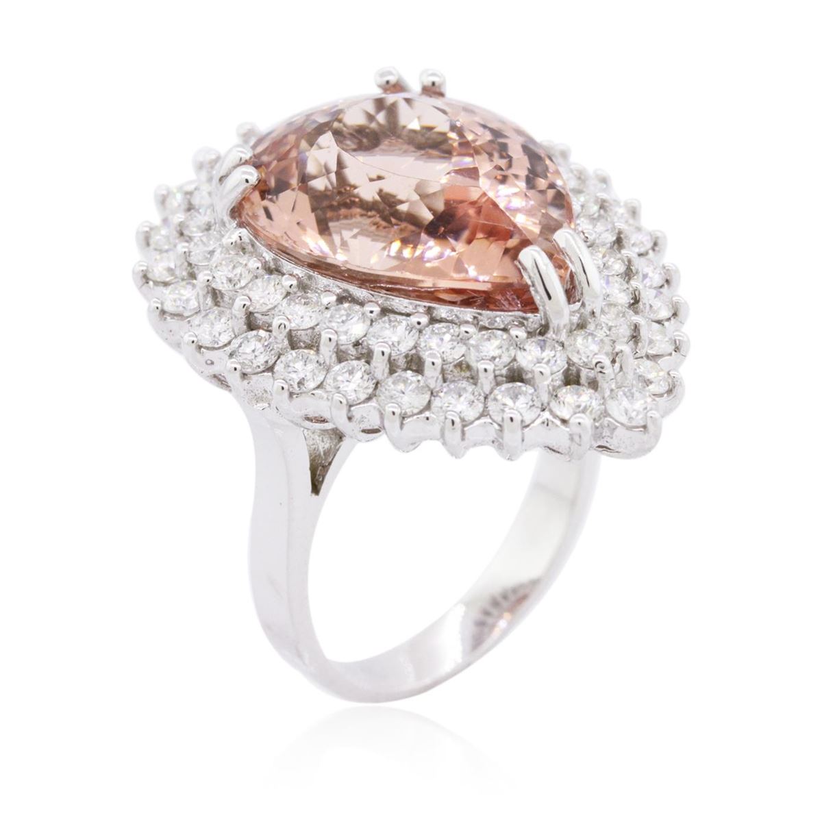 One electronically tested 14KT white gold ladies combination cast & assembled morganatic and diamond ring with a bright polish finish. Identified with markings of "K14". Condition is new. Containing: One prong set pear modified brilliant cut natural morganite, measuring 19.53 x 14.02 x 7.70mm, approximate weight of 11.47ct., clarity is eye clean, type I, light, brownish, red orange color, (GIA RO 3/1), cut is good. Fifty-Three prong set round brilliant cut diamonds, measuring 2.30 - 2.00 x 1.29mm (depth est.) approximate total weight of 53 Stones = 1.92ct. Clarity: SI-2 to I-1. Color: I - J, Cut is Good. Colored gemstones are presumed to have been subjected to commonly used enhancement processes. All diamonds and colored gemstones are graded in the mounting, unless otherwise stated. Total Weight of Colored Stones 11.47ct. Total Weight of Diamonds 1.92ct. Total Weight of Ring 12.40 grams. GGL Appraised at $8,870.00.