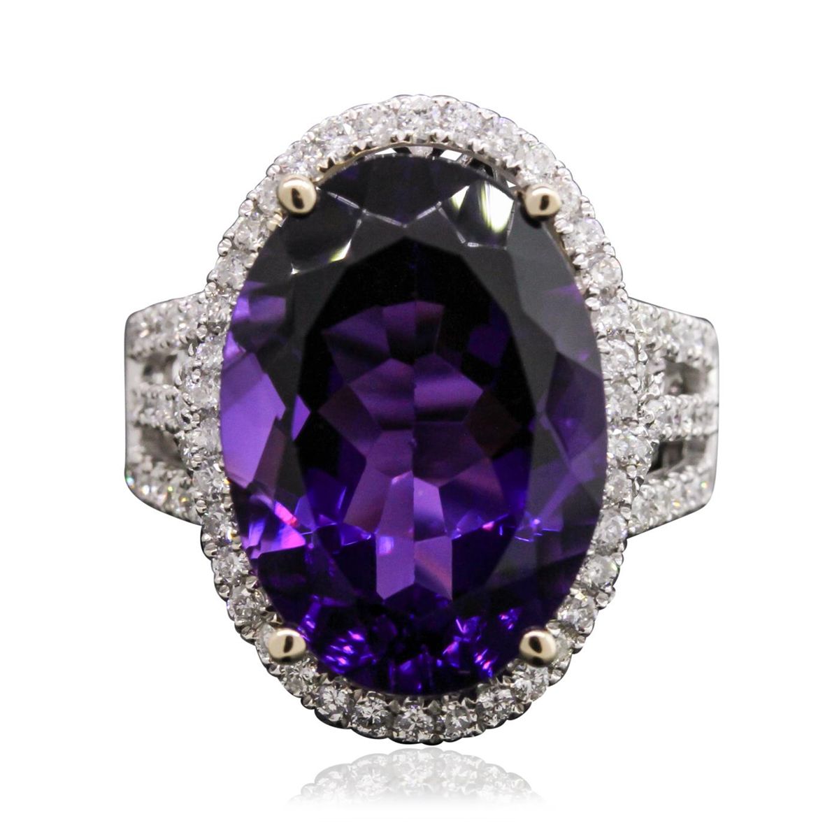One electronically tested 14KT white gold ladies cast amethyst and diamond ring with a bright polish finish. Condition is new, good workmanship. The featured amethyst is set within a diamond bezel supported by diamond set split shoulders, completed by a three and one-half millimeter wide band. Identified with markings of "14K". Containing: One prong set oval mixed cut natural amethyst, measuring 18.00 x 12.90 x 8.50mm, 6%. bulge factor, approximate weight of 11.51ct., clarity is eye clean, type II, dark, moderately strong, reddish purple color, (GIA rP 7/4), cut is good. Transmitting light with no distortion, transparent. Colored Stone Grading Report attached. Graded in the setting. Eighty-Eight prong set round brilliant cut diamonds, measuring 1.60 - 1.40 x 0.90mm (depth est.) approximate. Total Weight of 88 Stones = 1.21ct. Graded in the setting. Clarity: SI-1 to I-1. Color: G - I. Total Weight of Colored Stones 11.51ct. Total Weight of Diamonds 1.21ct. Total Weight of Ring 9.32grams. AIG Appraised at $5,710.00.