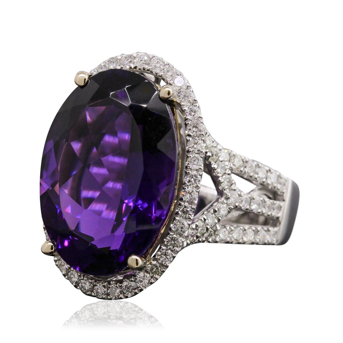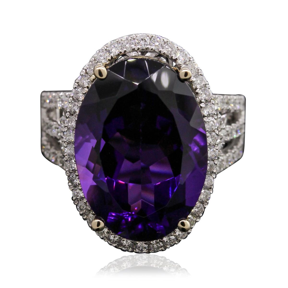 One electronically tested 14KT white gold ladies cast amethyst and diamond ring with a bright polish finish. Condition is new, good workmanship. The featured amethyst is set within a diamond bezel supported by diamond set split shoulders, completed by a three and one-half millimeter wide band. Identified with markings of "14K". Containing: One prong set oval mixed cut natural amethyst, measuring 18.00 x 12.90 x 8.50mm, 6%. bulge factor, approximate weight of 11.51ct., clarity is eye clean, type II, dark, moderately strong, reddish purple color, (GIA rP 7/4), cut is good. Transmitting light with no distortion, transparent. Colored Stone Grading Report attached. Graded in the setting. Eighty-Eight prong set round brilliant cut diamonds, measuring 1.60 - 1.40 x 0.90mm (depth est.) approximate. Total Weight of 88 Stones = 1.21ct. Graded in the setting. Clarity: SI-1 to I-1. Color: G - I. Total Weight of Colored Stones 11.51ct. Total Weight of Diamonds 1.21ct. Total Weight of Ring 9.32grams. AIG Appraised at $5,710.00.