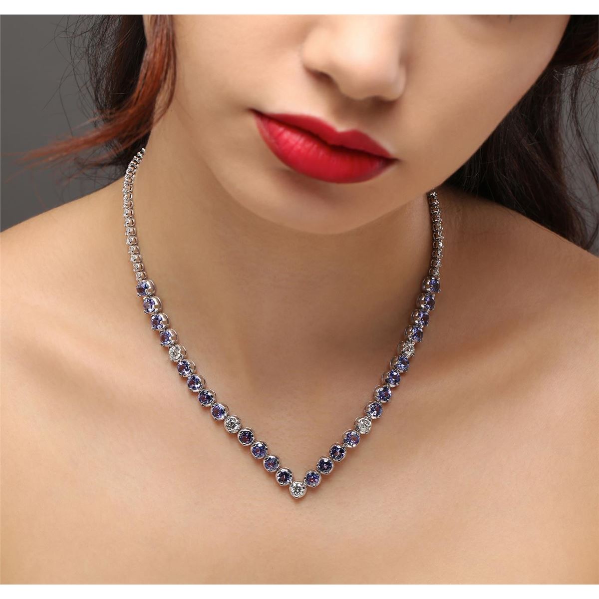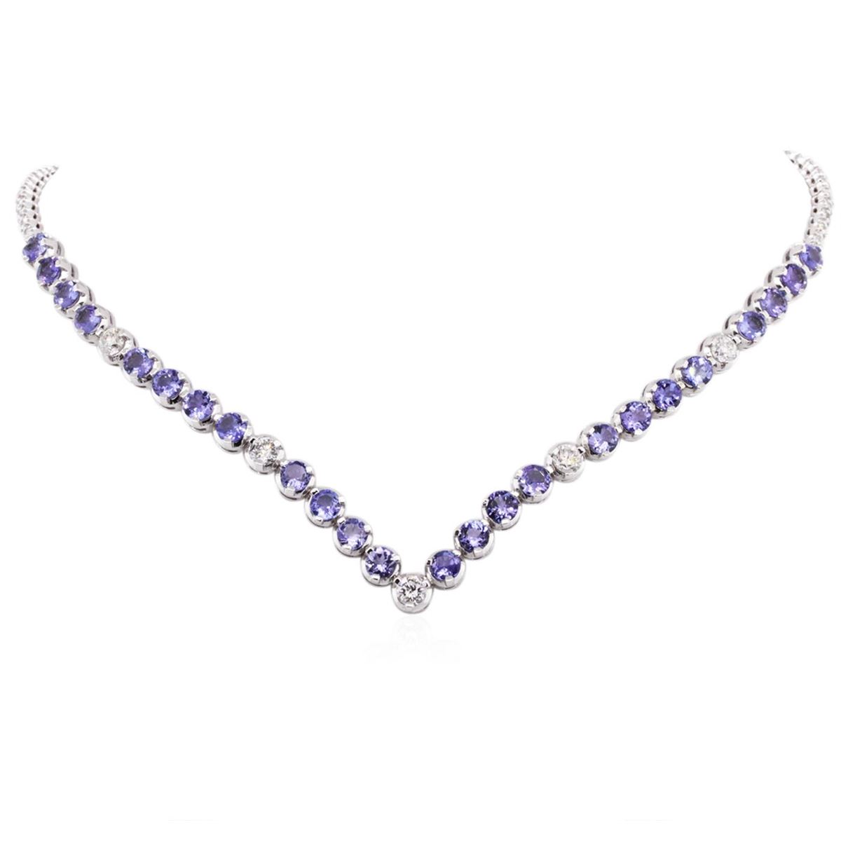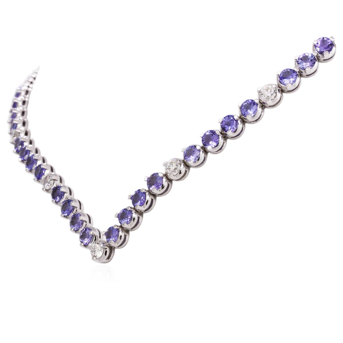 One electronically tested 14KT white gold ladies combination cast & assembled tanzanite and diamond necklace with a hidden box clasp with safety closer with a bright polish finish. Identified with markings of "14K". Condition is new. Containing: Twenty-four prong set round modified brilliant cut natural tanzanites, measuring 5.17 - 4.80 x 2.66 mm, approximate total weight of 11.52ct., clarity is eye clean, type I, medium light, very slightly grayish, violet color, (GIA V 4/3), cut is good. Five prong set round brilliant cut diamonds, measuring 4.79 - 4.30 x 2.95mm (depth est.) approximate total weight of 5 Stones = 1.86ct. Clarity: SI-2 to I-1. Color: I - J, Cut is Good. All diamonds and colored gemstones are graded in the mounting, unless otherwise stated. Colored gemstones are presumed to have been subjected to commonly used enhancement processes. Sixty-Six prong set round brilliant cut diamonds, measuring 2.00 - 2.00 x 1.20mm (depth est.) approximate total weight of 66 Stones = 1.93ct. Clarity: SI-2. Color: I - J, Cut is Good. All diamonds and colored gemstones are graded in the mounting, unless otherwise stated. Colored gemstones are presumed to have been subjected to commonly used enhancement processes. Total Weight of Colored Stones 11.52ct. Total Weight of Diamonds 3.79ct. Total Weight of Necklace 37.50 grams. GGL Appraised at $18,980.00.