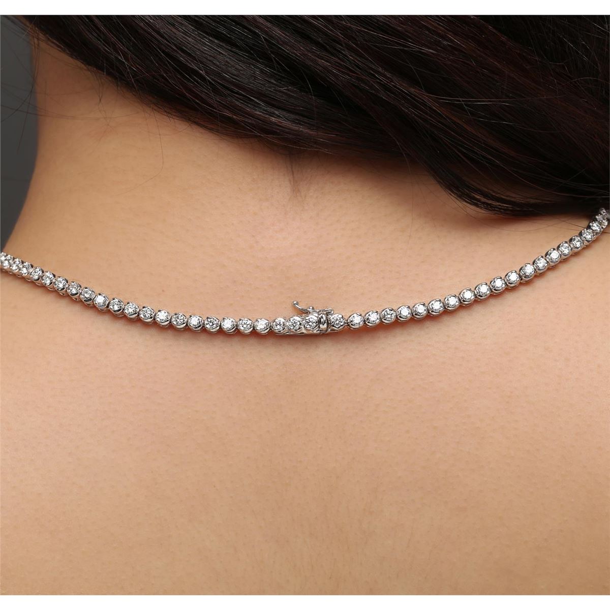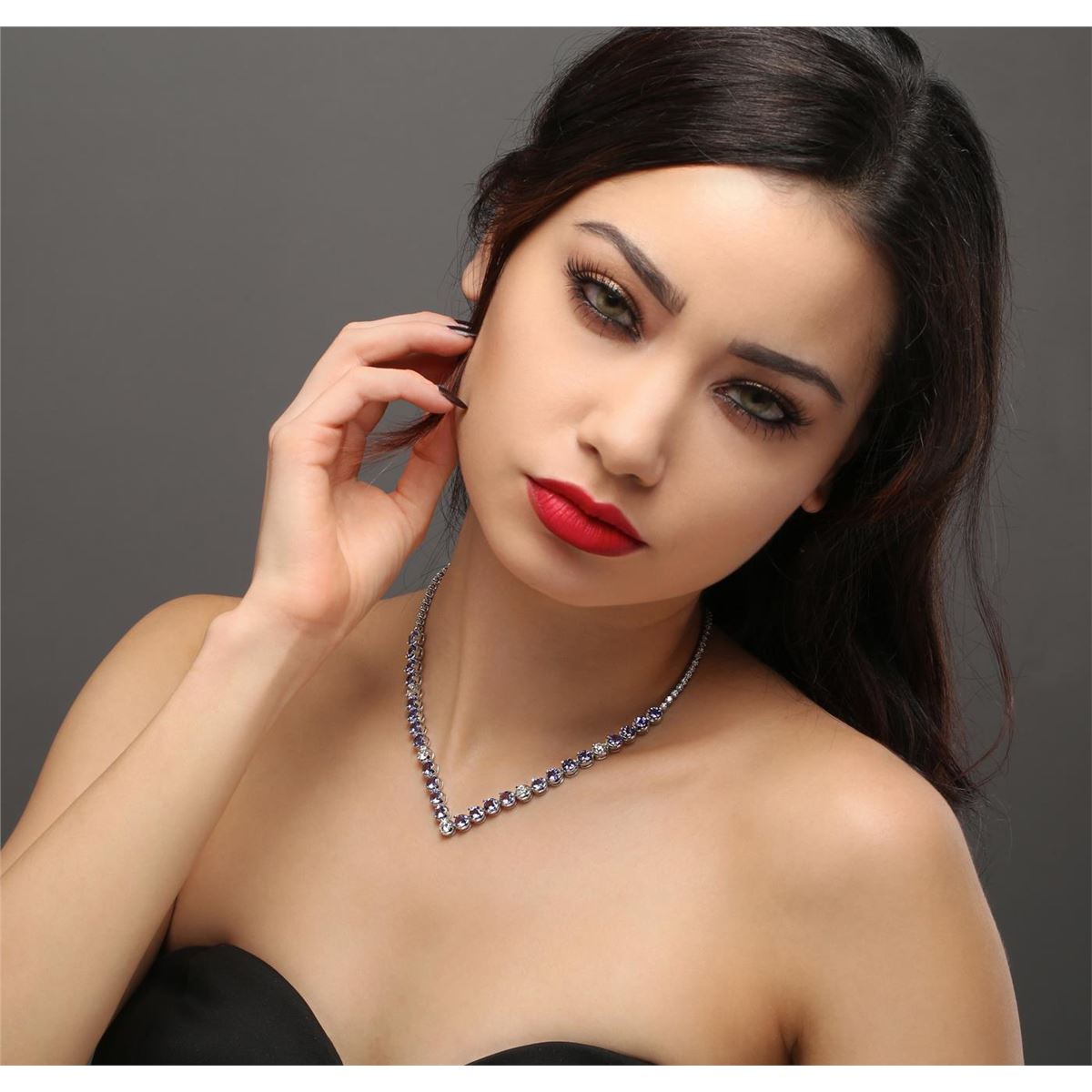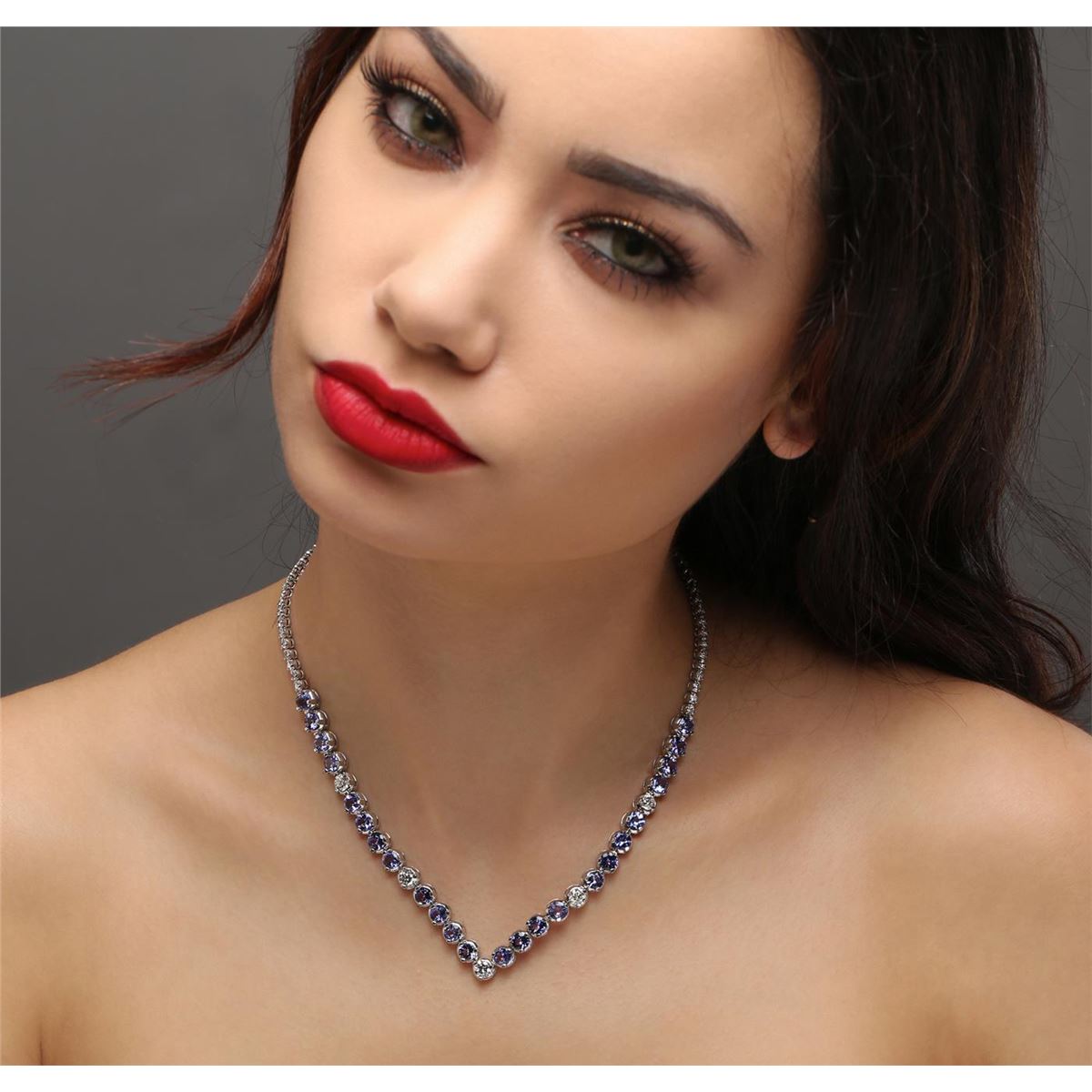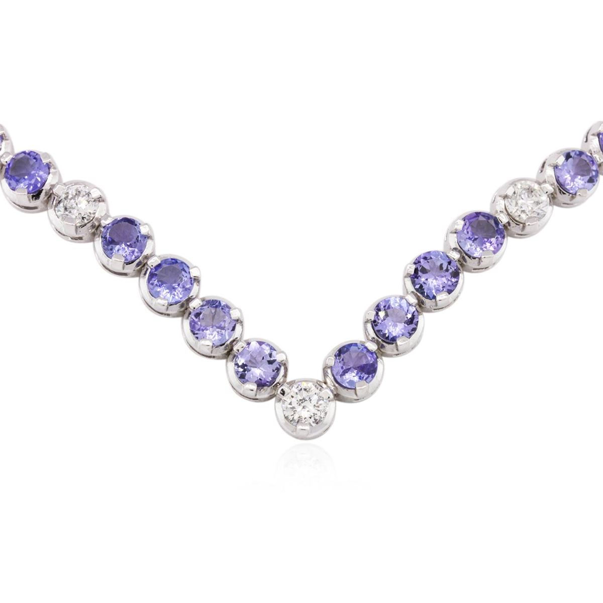 One electronically tested 14KT white gold ladies combination cast & assembled tanzanite and diamond necklace with a hidden box clasp with safety closer with a bright polish finish. Identified with markings of "14K". Condition is new. Containing: Twenty-four prong set round modified brilliant cut natural tanzanites, measuring 5.17 - 4.80 x 2.66 mm, approximate total weight of 11.52ct., clarity is eye clean, type I, medium light, very slightly grayish, violet color, (GIA V 4/3), cut is good. Five prong set round brilliant cut diamonds, measuring 4.79 - 4.30 x 2.95mm (depth est.) approximate total weight of 5 Stones = 1.86ct. Clarity: SI-2 to I-1. Color: I - J, Cut is Good. All diamonds and colored gemstones are graded in the mounting, unless otherwise stated. Colored gemstones are presumed to have been subjected to commonly used enhancement processes. Sixty-Six prong set round brilliant cut diamonds, measuring 2.00 - 2.00 x 1.20mm (depth est.) approximate total weight of 66 Stones = 1.93ct. Clarity: SI-2. Color: I - J, Cut is Good. All diamonds and colored gemstones are graded in the mounting, unless otherwise stated. Colored gemstones are presumed to have been subjected to commonly used enhancement processes. Total Weight of Colored Stones 11.52ct. Total Weight of Diamonds 3.79ct. Total Weight of Necklace 37.50 grams. GGL Appraised at $18,980.00.