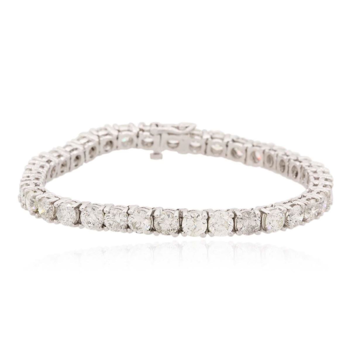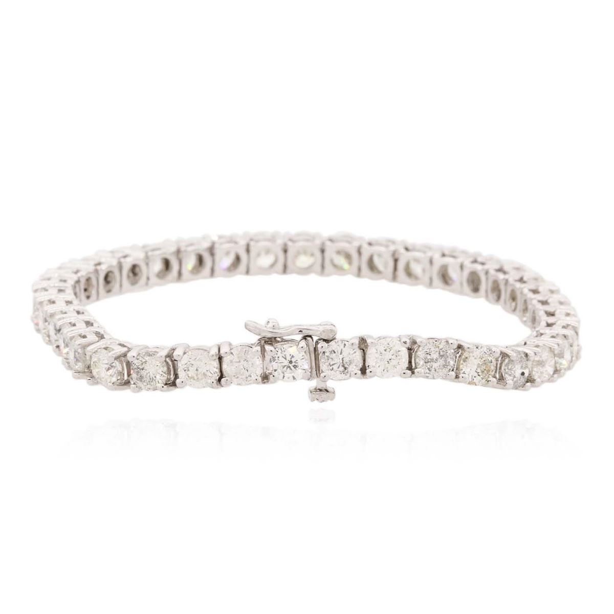 One electronically tested 14KT white gold ladies combination cast & assembled tennis bracelet with a hidden box clasp with a bright polish finish. Measurements: 7" in length. Identified with markings of "14K". Condition is new. Containing: Thirty-Seven prong set round brilliant cut diamonds, measuring 4.40 - 4.40 x 2.64mm (depth est.) approximate total weight of 37 Stones = 11.53ct. Clarity: I-1 to I-3. Color: I - K, Cut is Good. All diamonds are graded in the mounting, unless otherwise stated. Total Weight of Diamonds 11.53ct. Total Weight of Bracelet 19.30 grams. GGL Appraised at $34,570.00.