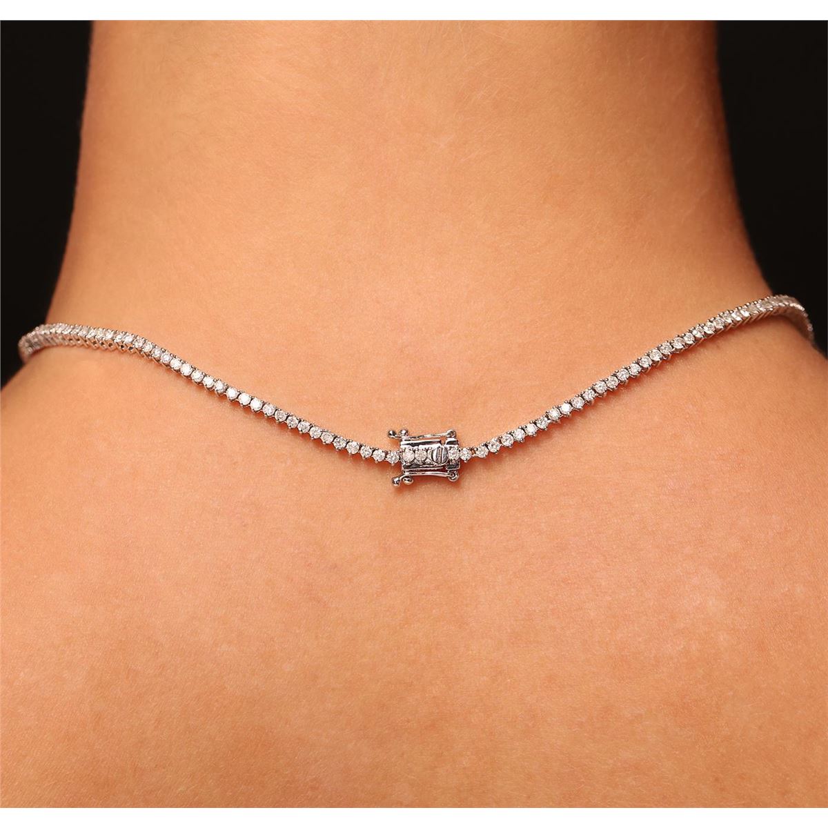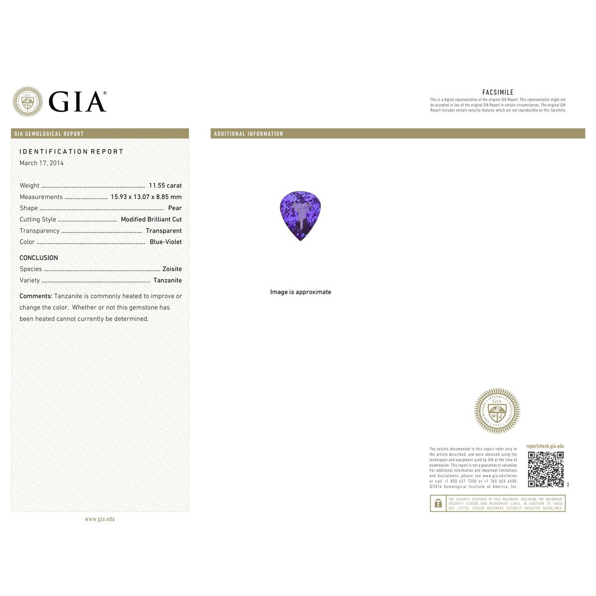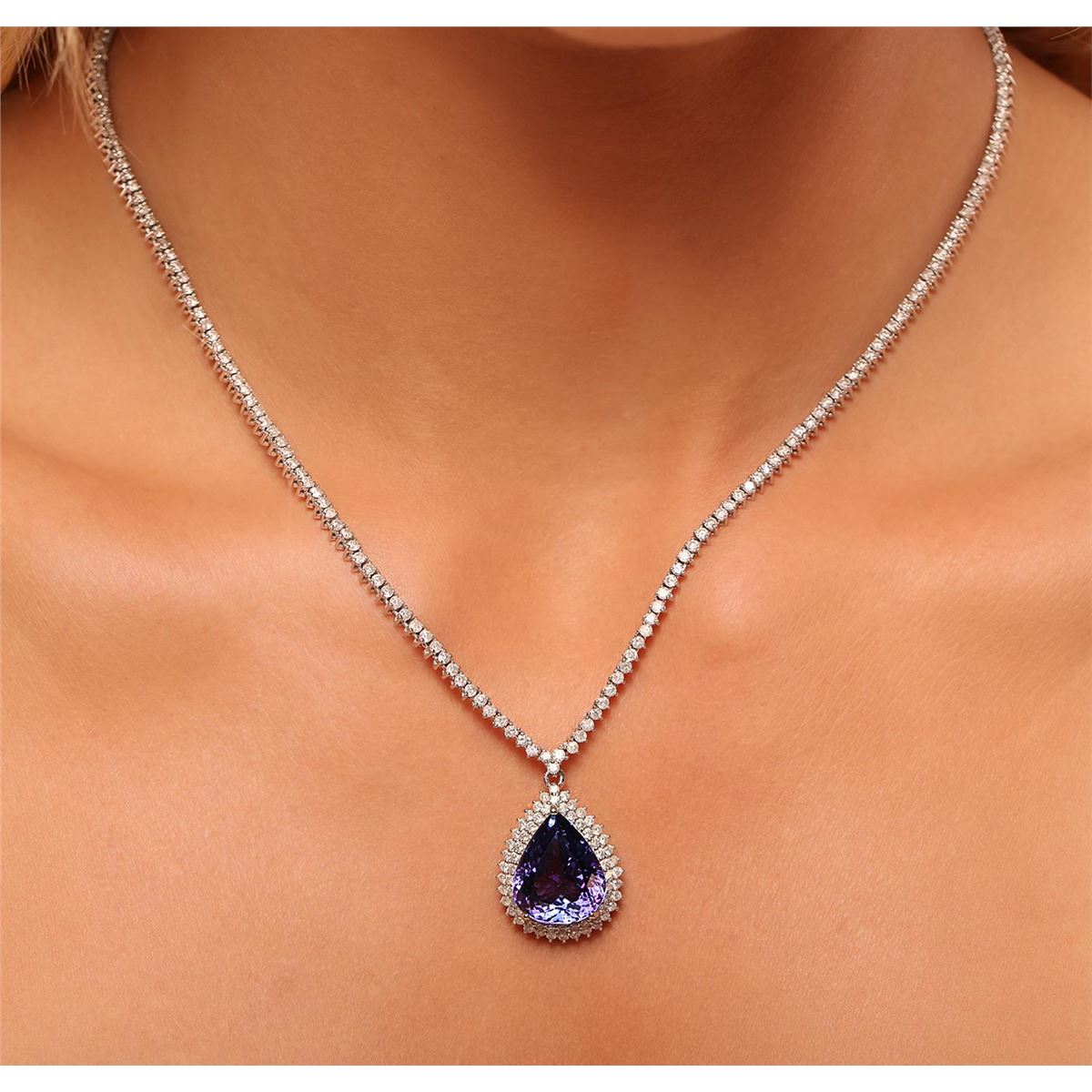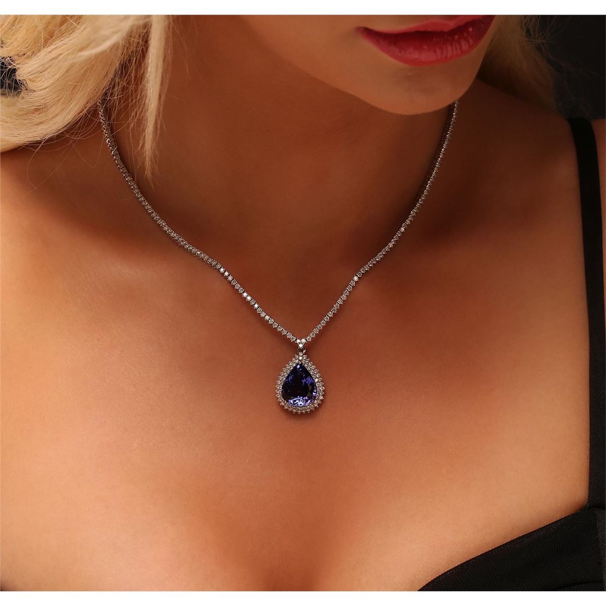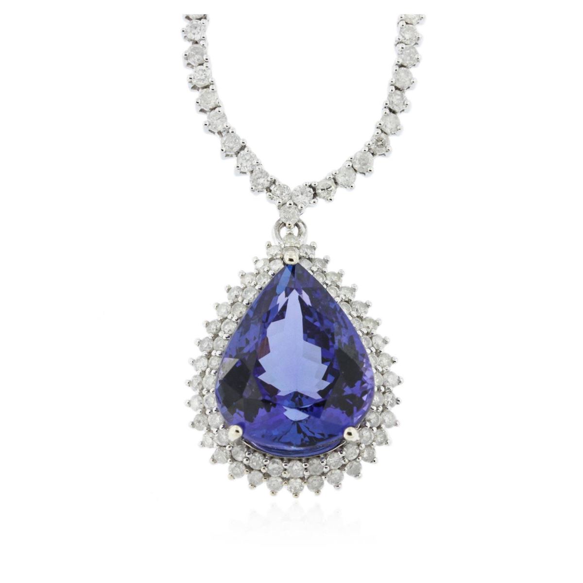 One electronically tested 14KT white gold Ladies combination cast & assembled necklace with a hidden box clasp with a bright polish finish. Condition is new. Measurements: 16" in length. Identified with markings of "14K". Containing: Two Hundred prong set round brilliant cut diamonds, measuring 1.80 - 1.80 x 1.08mm (depth est.) approximate. Total Weight of 200 Stones = 5.56ct. Clarity: I-1 to I-3. Color: G - H, Cut is Fair. Sixty-Five prong set round brilliant cut diamonds, measuring 1.30 - 1.30 x 0.78mm (depth est.) approximate. Total Weight of 65 Stones = 0.52ct. Clarity: I-2 to I-3. Color: G - H, Cut is Fair. One prong set pear modified brilliant cut natural tanzanite, measuring 15.93 x 13.07 x 8.85mm, approximate weight of 11.55ct., clarity is eye clean, type I, medium, moderately strong, bluish violet color, (GIA bV 5/4), cut is very good. GIA Report: 1156964525.Total Weight of Colored Stones 11.55ct. Total Weight of Diamonds 6.08ct. Total Weight of Necklace 22.50 grams. GGL Appraised at $33,870.00.