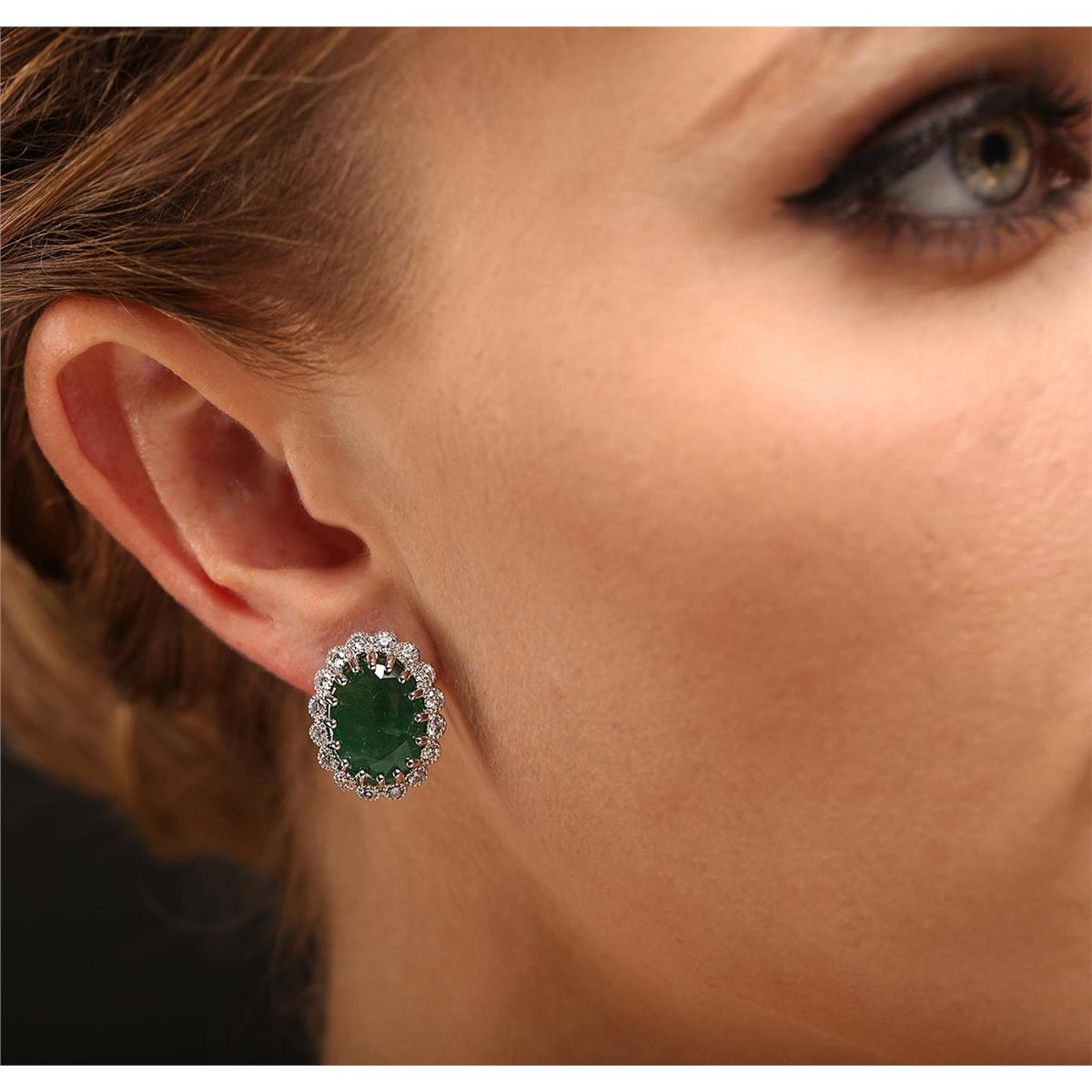 One pair electronically tested 14KT white gold Ladies combination cast & assembled earrings with Omega clip backs with a bright polish finish. Identified with markings of "14K". Condition is excellent. Containing: Two prong set oval modified brilliant cut natural emeralds, measuring 13.00 x 10.00 x 7.30mm, approximate total weight of 11.56ct., clarity is heavily included, type III, medium dark, moderately strong, green color, (GIA G 6/4), cut is fair. Colored gemstones are presumed to have been subjected to commonly used and possible undetectable color/clarity enhancement processes. Thirty-Two gypsy set round brilliant cut diamonds, measuring 2.20 - 2.20 x 1.32mm (depth est.) approximate total weight of 32 Stones = 1.25ct. Clarity of I-2 to I-3, Color of L - M, Cut is Good. Total Weight of Colored Stones 11.56ct. Total Weight of Diamonds 1.25ct. Total Weight of Earrings 10.20gm. GGL Appraised at $13,100.00.
