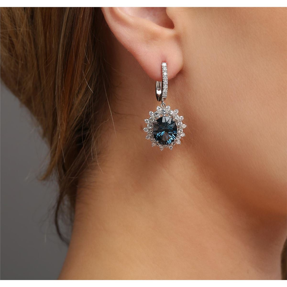 One pair electronically tested 14KT white gold ladies cast topaz and diamond earrings with hinged clip backs with a bright polish finish. Identified with markings of "14K". Condition is new. Containing: Two prong set oval modified mixed cut natural blue topazes, measuring 12.00 x 10.00 x 6.50mm, approximate total weight of 11.56ct., clarity is eye clean, type I, medium, moderately strong, greenish blue color, (GIA gB 5/4), cut is good. Seventy-Two prong set round brilliant cut diamonds, measuring 1.60 - 1.30 x 0.87mm (depth est.) approximate total weight of 72 Stones = 0.80ct. Clarity: SI-2 to I-1. Color: I - J, Cut is Good. Colored gemstones are presumed to have been subjected to commonly used enhancement processes. All diamonds and colored gemstones are graded in the mounting, unless otherwise stated. Total Weight of Colored Stones 11.56ct. Total Weight of Diamonds 0.80ct. Total Weight of Earrings 10.20 grams. GGL Appraised at $5,420.00.