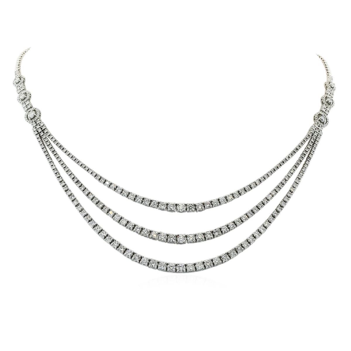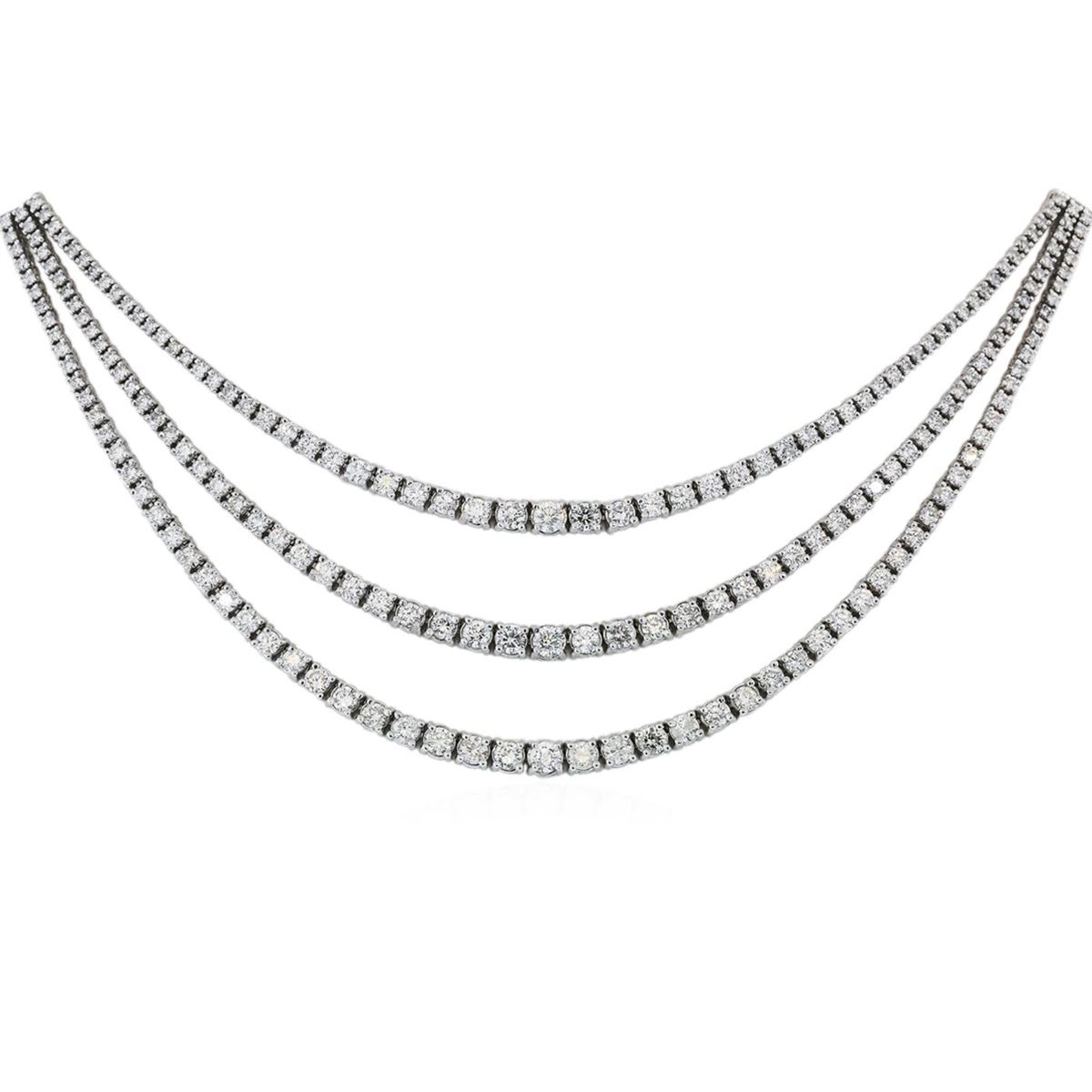 One electronically tested 14KT white gold ladies cast diamond necklace with a hidden box clasp with safety closer with a bright polish finish. Measurements: 16.85" in length Identified with markings of "14K". Condition is new. Containing: One Hundred Twenty prong set round brilliant cut diamonds, measuring 3.50 - 2.00 x 1.65mm (depth est.) approximate total weight of 120 Stones = 9.13ct. Clarity: SI-1 to I-1. Color: I - J, Cut is Good. Two Hundred One prong set round brilliant cut diamonds, measuring 1.50 - 1.50 x 0.90mm (depth est.) approximate total weight of 201 Stones = 2.47ct. Clarity: SI-2 to I-1. Color: I - J, Cut is Good. All diamonds are graded in the mounting, unless otherwise stated. Total Weight of Diamonds 11.60ct. Total Weight of Necklace 28.70 grams. GGL Appraised at $30,100.00.