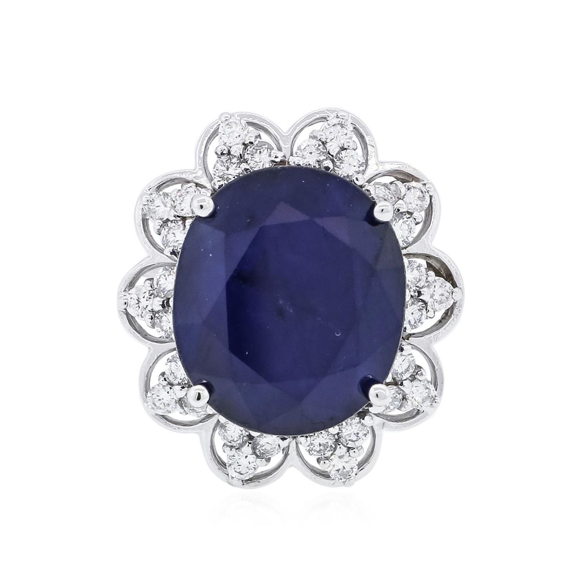 One electronically tested 14KT white gold ladies combination cast & assembled sapphire and diamond ring with a flat shank with a bright polish finish. Identified with markings of "K14". Condition is new. Containing: One prong set oval modified brilliant cut natural blue sapphire, measuring 15.15 x 13.03 x 7.31mm, approximate weight of 11.61ct., clarity is heavily included, type II, dark, strong, blue color, (GIA B 7/5), cut is good. Thirty prong set round brilliant cut diamonds, measuring 1.70 - 1.70 x 1.02mm (depth est.) approximate total weight of 30 Stones = 0.54ct. Clarity: SI-1 to I-1. Color: I - J, Cut is Good. Colored gemstones are presumed to have been subjected to commonly used enhancement processes. All diamonds and colored gemstones are graded in the mounting, unless otherwise stated. Total Weight of Colored Stones 11.61ct. Total Weight of Diamonds 0.54ct. Total Weight of Ring 8.50 grams. GGL Appraised at $6,410.00.