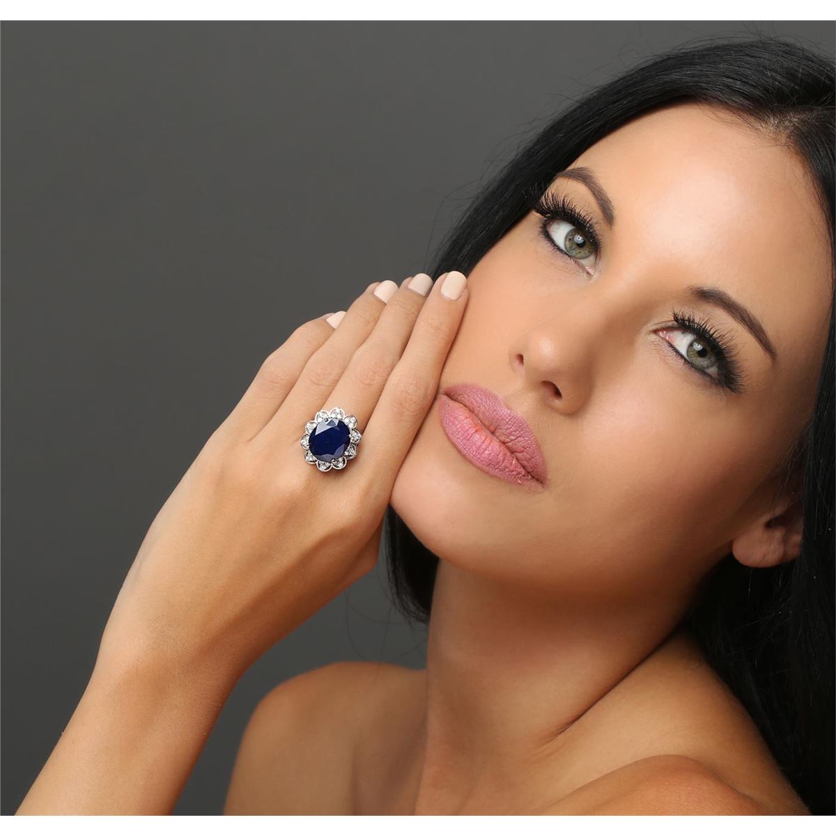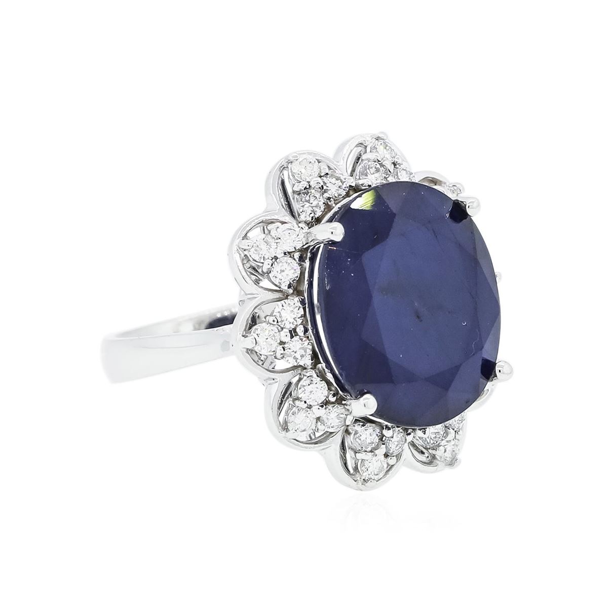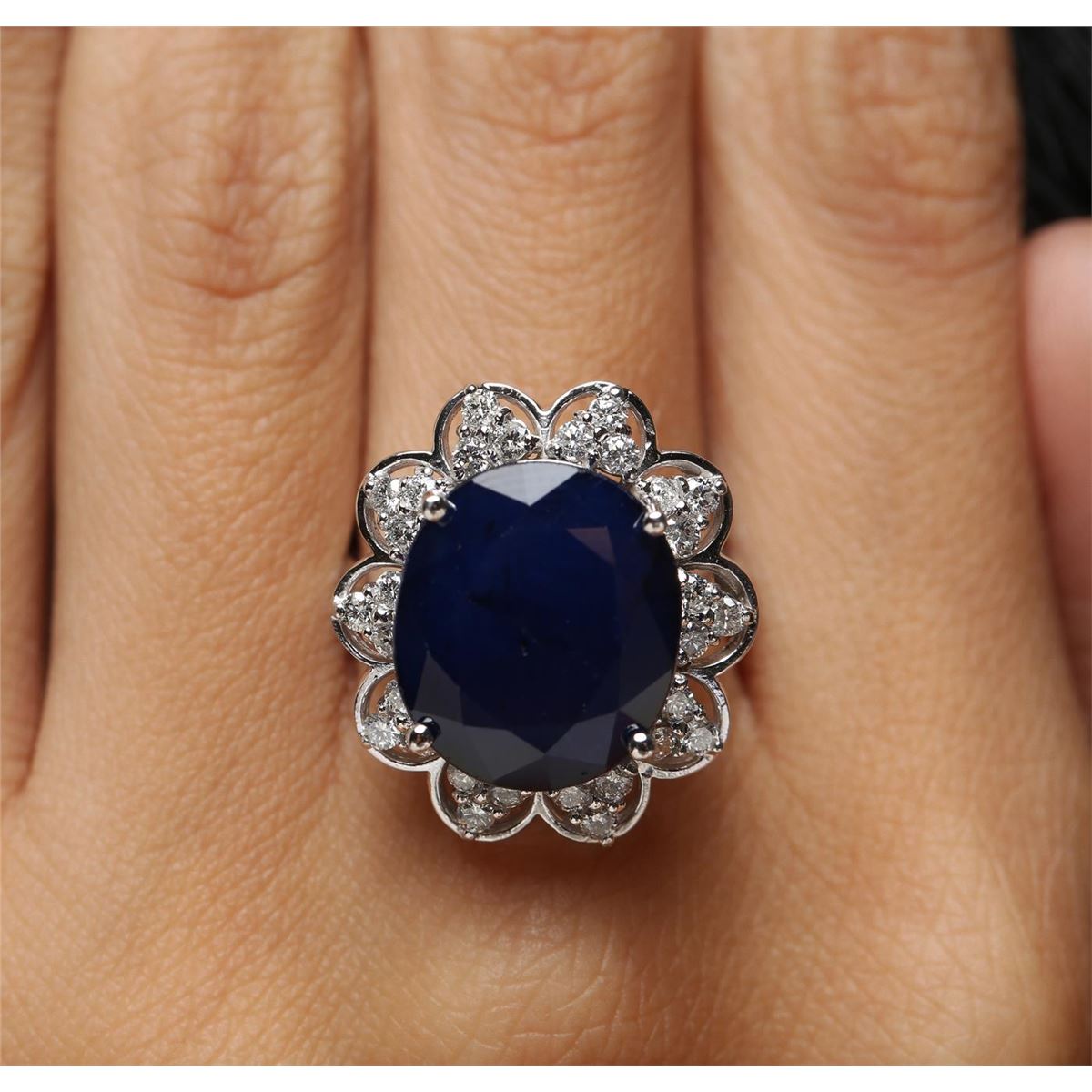 One electronically tested 14KT white gold ladies combination cast & assembled sapphire and diamond ring with a flat shank with a bright polish finish. Identified with markings of "K14". Condition is new. Containing: One prong set oval modified brilliant cut natural blue sapphire, measuring 15.15 x 13.03 x 7.31mm, approximate weight of 11.61ct., clarity is heavily included, type II, dark, strong, blue color, (GIA B 7/5), cut is good. Thirty prong set round brilliant cut diamonds, measuring 1.70 - 1.70 x 1.02mm (depth est.) approximate total weight of 30 Stones = 0.54ct. Clarity: SI-1 to I-1. Color: I - J, Cut is Good. Colored gemstones are presumed to have been subjected to commonly used enhancement processes. All diamonds and colored gemstones are graded in the mounting, unless otherwise stated. Total Weight of Colored Stones 11.61ct. Total Weight of Diamonds 0.54ct. Total Weight of Ring 8.50 grams. GGL Appraised at $6,410.00.