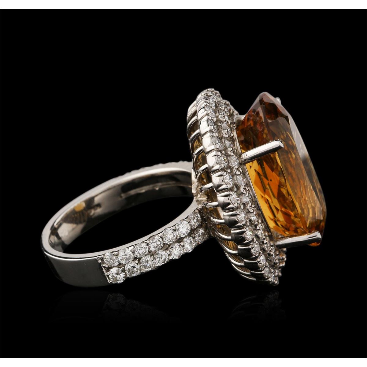 One electronically tested 14KT white gold ladies cast citrine and diamond ring with a bright polish finish. Identified with markings of "14K". Condition is new. Containing: One prong set oval modified brilliant cut natural citrine quartz, measuring 18.93 x 13.00 x 8.45mm, approximate weight of 11.62ct., clarity is eye clean, type I, medium light, brownish, orangy yellow color, (GIA oY 4/3), cut is good. Ninety-Five prong set round brilliant cut diamonds, measuring 1.50 - 1.50 x 0.90mm (depth est.) approximate total weight of 95 Stones = 1.17ct. Clarity: SI-2 to I-1. Color: I - J, Cut is Good. Colored gemstones are presumed to have been subjected to commonly used enhancement processes. All diamonds and colored gemstones are graded in the mounting, unless otherwise stated. Total Weight of Colored Stones 11.62ct. Total Weight of Diamonds 1.17ct. Total Weight of Ring 10.90 grams. GGL Appraised at $6,095.00.
