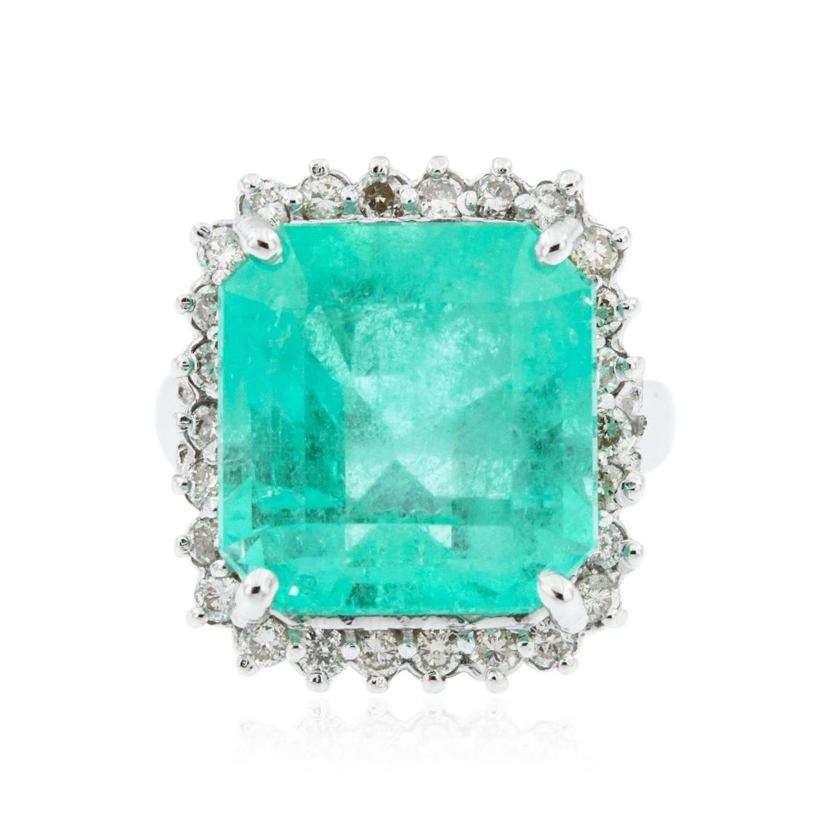One electronically tested 14KT white gold Ladies combination cast & assembled ring with a bright polish finish. Condition is new. Identified with markings of "14K". Containing: One prong set emerald standard step cut natural emerald, measuring 13.88 x 12.95 x 8.80mm, approximate weight of 11.62ct., clarity is moderately included, type III, medium light, very slightly grayish, very slightly bluish green color, (GIA vslbG 4/3), cut is good. Colored gemstones are presumed to have been subjected to commonly used color/clarity enhancement processes. Twenty-Six prong set round brilliant cut diamonds, measuring 1.90 - 1.90 x 1.14mm (depth est.) approximate. Total Weight of 26 Stones = 0.65ct. Clarity: I-1 to I-2. Color: K - L, Cut is Good. Total Weight of Colored Stones 11.62ct. Total Weight of Diamonds 0.65ct. Total Weight of Ring 8.60 grams. GGL Appraised at $20,385.00.