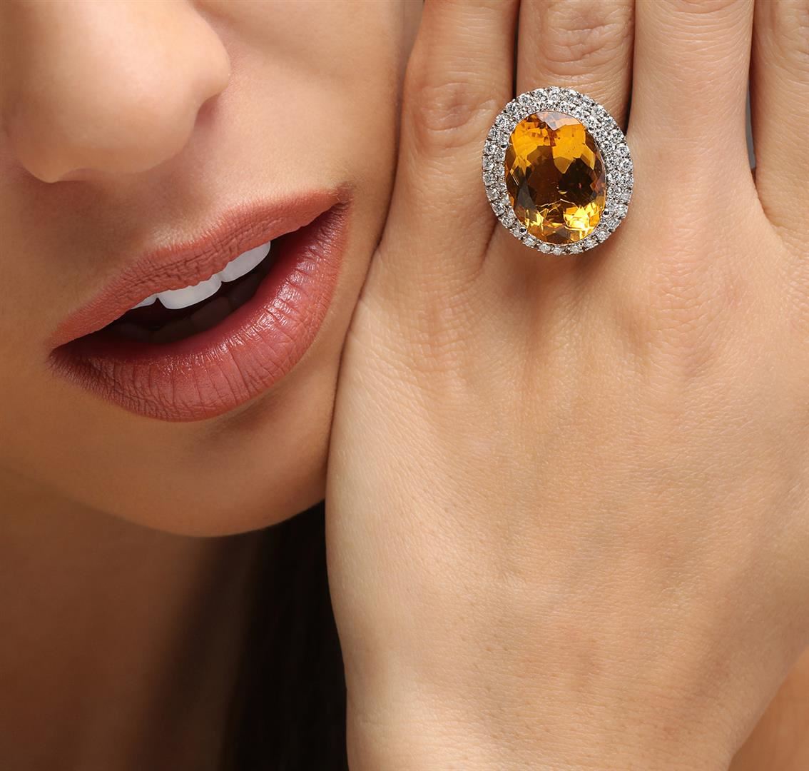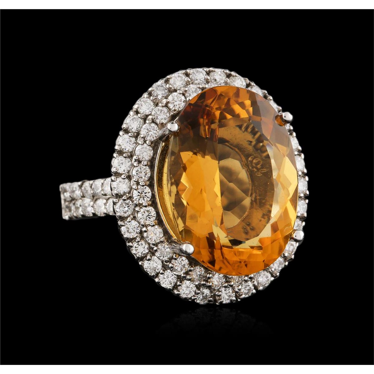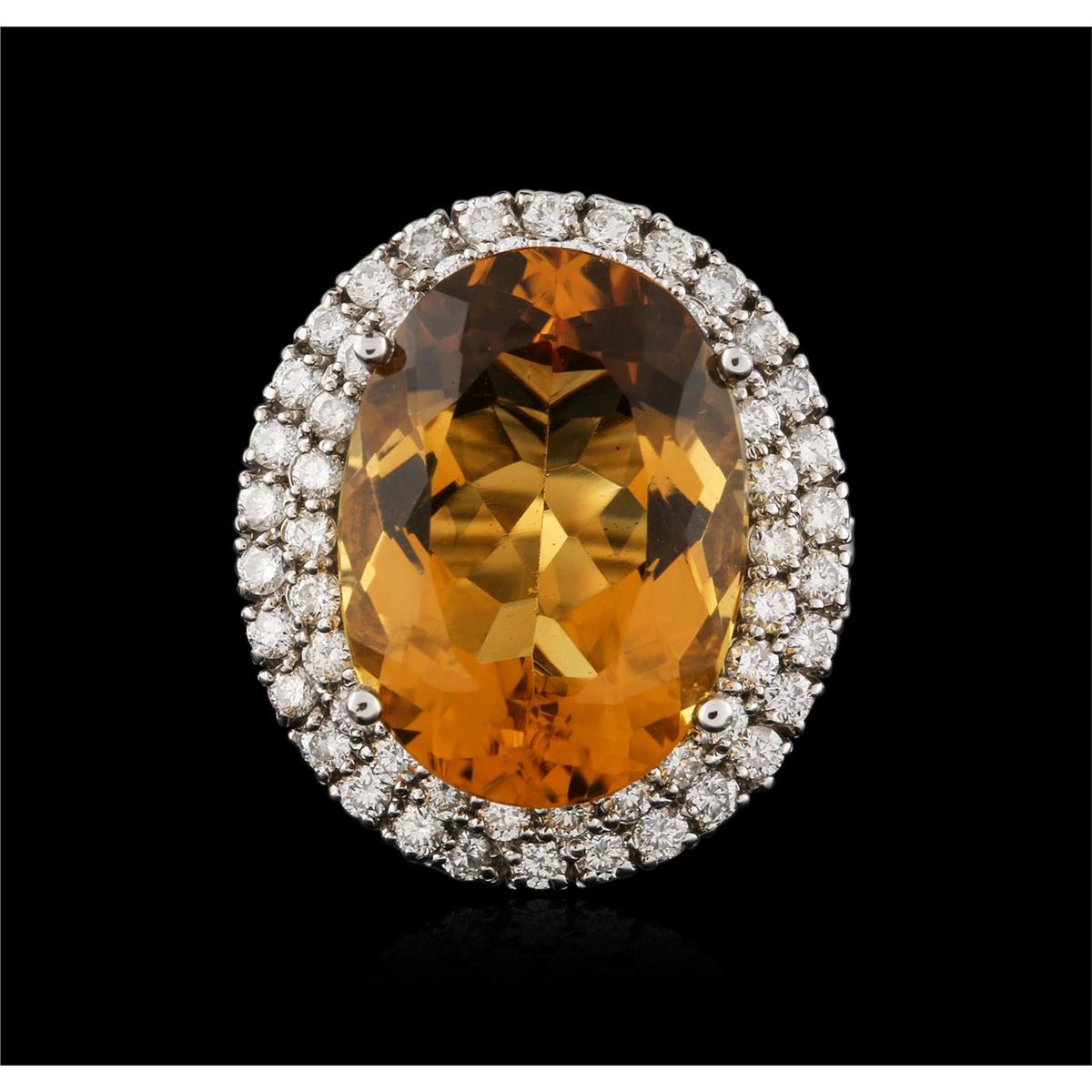 One electronically tested 14KT white gold ladies cast citrine and diamond ring with a bright polish finish. Identified with markings of "14K". Condition is new. Containing: One prong set oval modified brilliant cut natural citrine quartz, measuring 18.93 x 13.00 x 8.45mm, approximate weight of 11.62ct., clarity is eye clean, type I, medium light, brownish, orangy yellow color, (GIA oY 4/3), cut is good. Ninety-Five prong set round brilliant cut diamonds, measuring 1.50 - 1.50 x 0.90mm (depth est.) approximate total weight of 95 Stones = 1.17ct. Clarity: SI-2 to I-1. Color: I - J, Cut is Good. Colored gemstones are presumed to have been subjected to commonly used enhancement processes. All diamonds and colored gemstones are graded in the mounting, unless otherwise stated. Total Weight of Colored Stones 11.62ct. Total Weight of Diamonds 1.17ct. Total Weight of Ring 10.90 grams. GGL Appraised at $6,095.00.