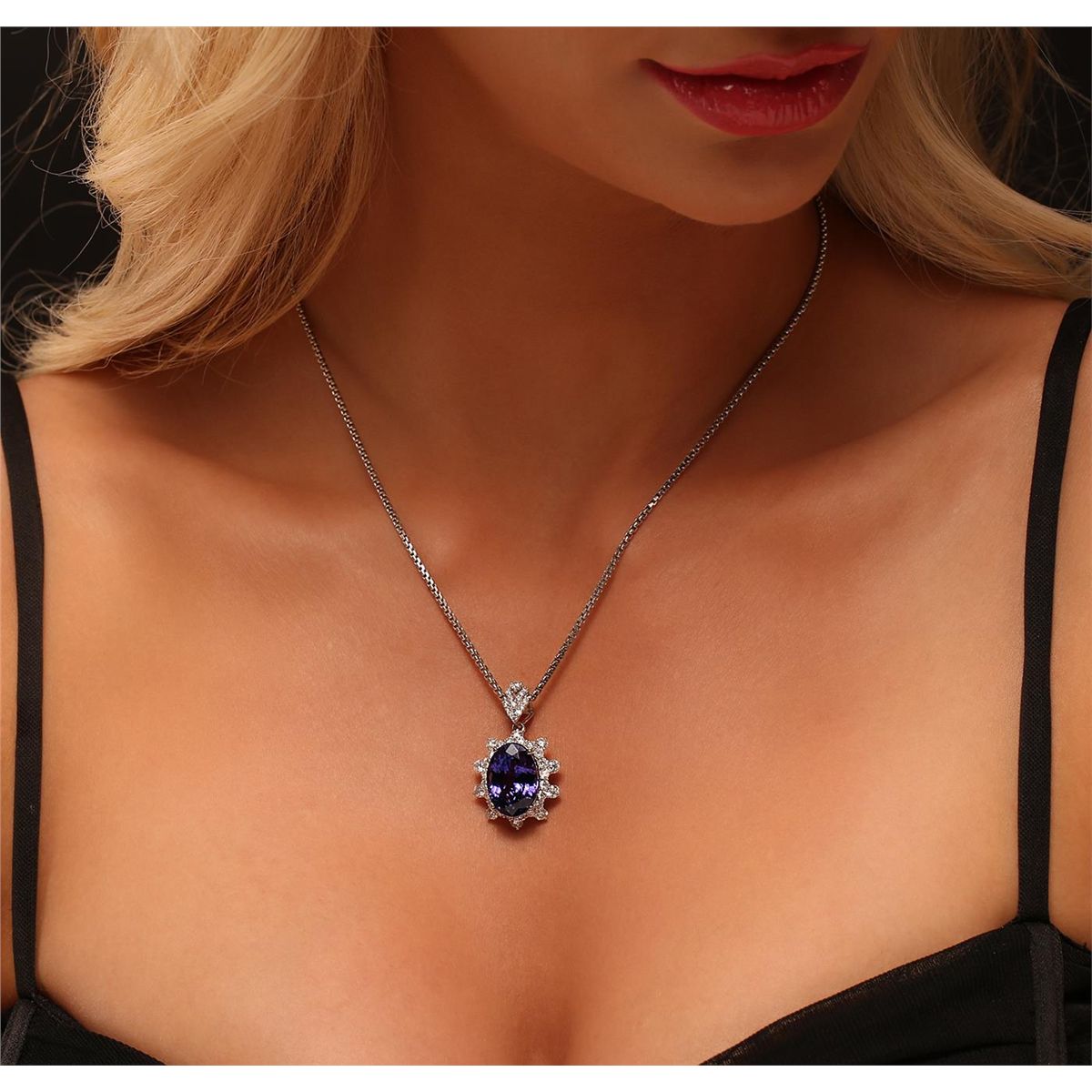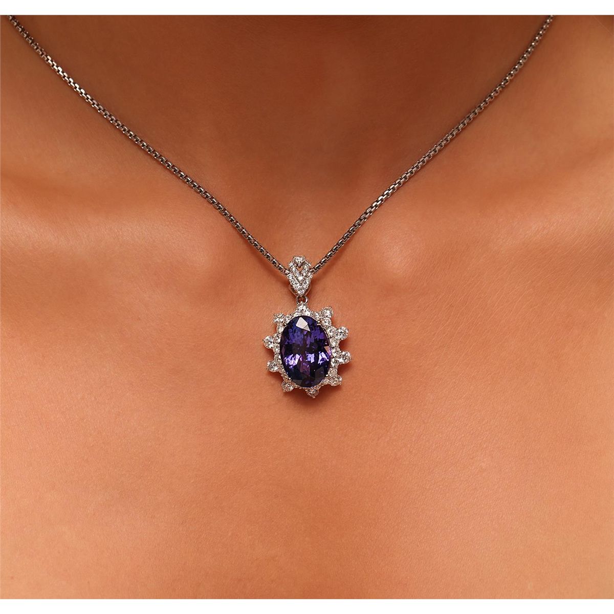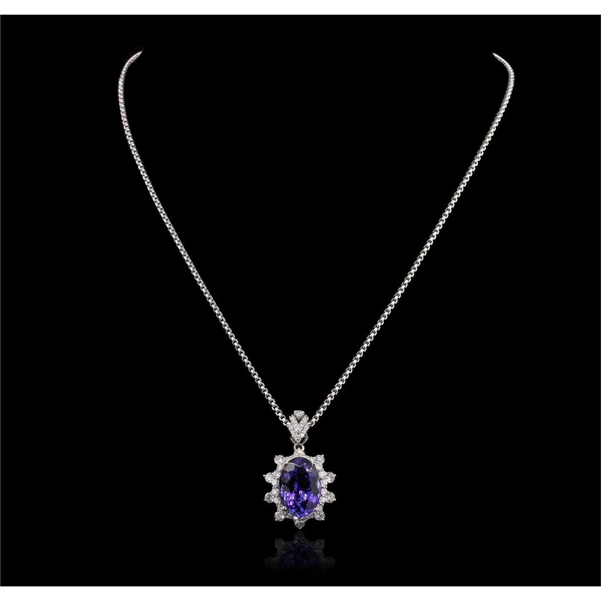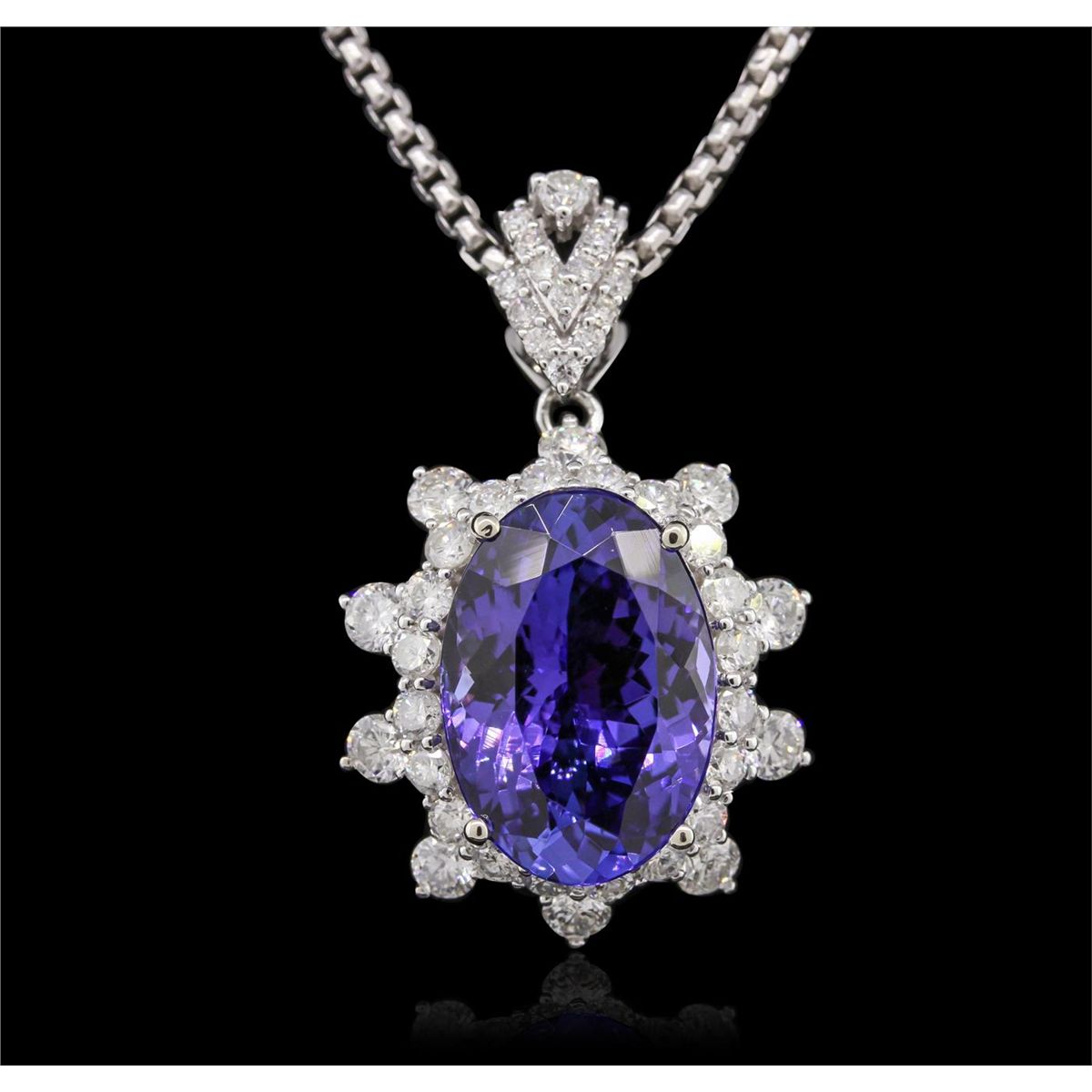 One electronically tested 14KT white gold Ladies combination cast & assembled pendant & chain 17.5" long, medium fancy box link with a lobster claw clasp with a high polish finish. Condition is new. Identified with markings of "14K". Containing: Thirteen prong set round brilliant cut diamonds, measuring 1.30 - 1.30 x 0.78mm (depth est.) approximate. Total Weight of 13 Stones = 0.10ct. Clarity: I-1 to I-2. Color: H - I, Cut is Good. One prong set oval modified brilliant cut natural tanzanite, measuring 16.86 x 11.75 x 8.47mm, exact weight 11.66ct., clarity is eye clean, type I, medium, moderately strong, bluish violet color, (GIA bV 5/4), cut is very good. GIA Report: 6157964614.Ten prong set round brilliant cut diamonds, measuring 3.00 - 3.00 x 1.80mm (depth est.) approximate. Total Weight of 10 Stones = 0.99ct. Clarity: I-1 to I-2. Color: H - I, Cut is Good. Twenty-Four prong set round brilliant cut diamonds, measuring 2.10 - 2.10 x 1.26mm (depth est.) approximate. Total Weight of 24 Stones = 1.13ct. Clarity: SI-2 to I-1. Color: J - K, Cut is Good. Total Weight of Colored Stones 11.66ct. Total Weight of Diamonds 2.22ct. Total Weight of Pendant & Chain 9.20 grams. GGLAppraised at $22,610.00.