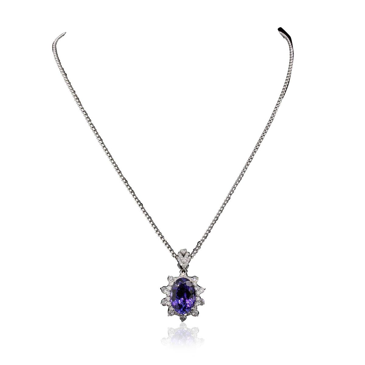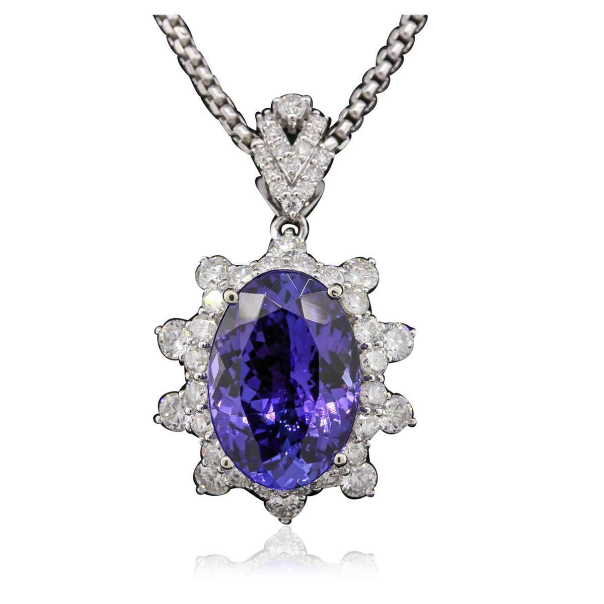 One electronically tested 14KT white gold Ladies combination cast & assembled pendant & chain 17.5" long, medium fancy box link with a lobster claw clasp with a high polish finish. Condition is new. Identified with markings of "14K". Containing: Thirteen prong set round brilliant cut diamonds, measuring 1.30 - 1.30 x 0.78mm (depth est.) approximate. Total Weight of 13 Stones = 0.10ct. Clarity: I-1 to I-2. Color: H - I, Cut is Good. One prong set oval modified brilliant cut natural tanzanite, measuring 16.86 x 11.75 x 8.47mm, exact weight 11.66ct., clarity is eye clean, type I, medium, moderately strong, bluish violet color, (GIA bV 5/4), cut is very good. GIA Report: 6157964614.Ten prong set round brilliant cut diamonds, measuring 3.00 - 3.00 x 1.80mm (depth est.) approximate. Total Weight of 10 Stones = 0.99ct. Clarity: I-1 to I-2. Color: H - I, Cut is Good. Twenty-Four prong set round brilliant cut diamonds, measuring 2.10 - 2.10 x 1.26mm (depth est.) approximate. Total Weight of 24 Stones = 1.13ct. Clarity: SI-2 to I-1. Color: J - K, Cut is Good. Total Weight of Colored Stones 11.66ct. Total Weight of Diamonds 2.22ct. Total Weight of Pendant & Chain 9.20 grams. GGL Appraised at $22,610.00.