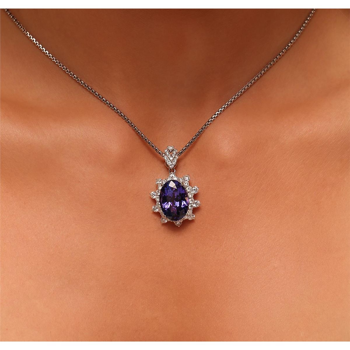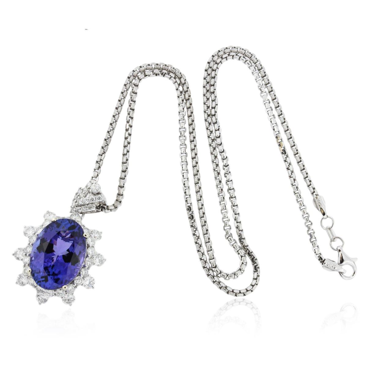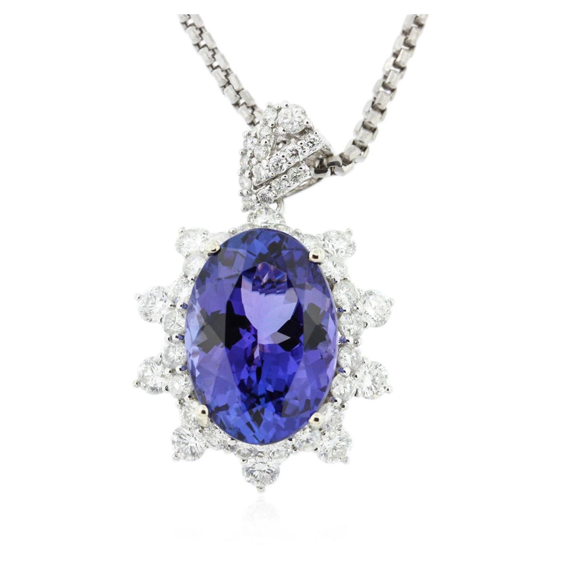 One electronically tested 14KT white gold Ladies combination cast & assembled pendant & chain 17.5" long, medium fancy box link with a lobster claw clasp with a high polish finish. Condition is new. Identified with markings of "14K". Containing: Thirteen prong set round brilliant cut diamonds, measuring 1.30 - 1.30 x 0.78mm (depth est.) approximate. Total Weight of 13 Stones = 0.10ct. Clarity: I-1 to I-2. Color: H - I, Cut is Good. One prong set oval modified brilliant cut natural tanzanite, measuring 16.86 x 11.75 x 8.47mm, exact weight 11.66ct., clarity is eye clean, type I, medium, moderately strong, bluish violet color, (GIA bV 5/4), cut is very good. GIA Report: 6157964614.Ten prong set round brilliant cut diamonds, measuring 3.00 - 3.00 x 1.80mm (depth est.) approximate. Total Weight of 10 Stones = 0.99ct. Clarity: I-1 to I-2. Color: H - I, Cut is Good. Twenty-Four prong set round brilliant cut diamonds, measuring 2.10 - 2.10 x 1.26mm (depth est.) approximate. Total Weight of 24 Stones = 1.13ct. Clarity: SI-2 to I-1. Color: J - K, Cut is Good. Total Weight of Colored Stones 11.66ct. Total Weight of Diamonds 2.22ct. Total Weight of Pendant & Chain 9.20 grams. GGL Appraised at $22,610.00.