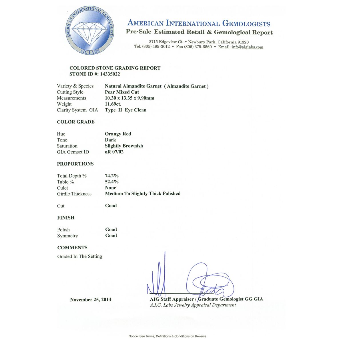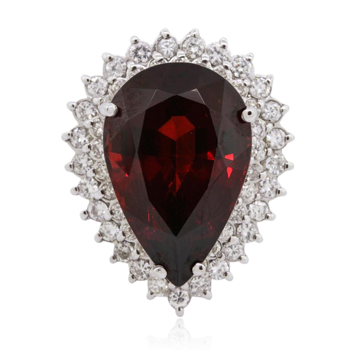One electronically tested 14KT white gold ladies cast garnet and diamond ring with a bright polish finish. The featured garnet is set within two tiered diamond bezels, completed by a two and one-half millimeter wide band. Identified with markings of "14K". Condition is new, good workmanship. Containing: One prong set pear mixed cut natural almandite garnet, measuring 10.30 x 13.35 x 9.90mm, 6%. bulge factor, approximate weight of 11.69ct., clarity is eye clean, type II, dark, slightly brownish, orangy red color, (GIA oR 7/2), cut is good. Transmitting light with no distortion, transparent. Colored Stone Grading Report attached. Refractive index testing results of 1.80. This is a conclusive result for almandite garnet. Graded in the setting. Twenty-Seven prong set round brilliant cut diamonds, measuring 2.10 - 2.00 x 1.23mm (depth est.) approximate total weight of 27 Stones = 0.95ct. Graded in the setting. Clarity: SI-1 to I-1. Color: G - I Twenty-Six prong set round brilliant cut diamonds, measuring 1.70 - 1.60 x 0.99mm (depth est.) approximate total weight of 26 Stones = 0.52ct. Graded in the setting. Clarity: SI-1 to I-1. Color: H - J. Total Weight of Colored Stones 11.69ct. Total Weight of Diamonds 1.47ct. Total Weight of Ring 12.55 grams. AIG Appraised at $6,510.00.