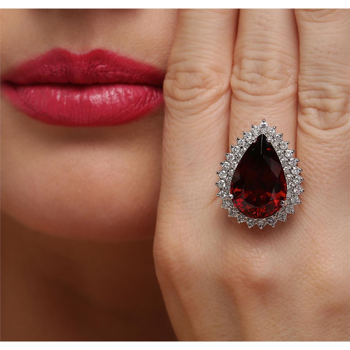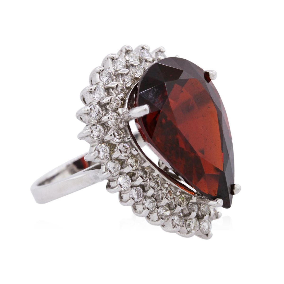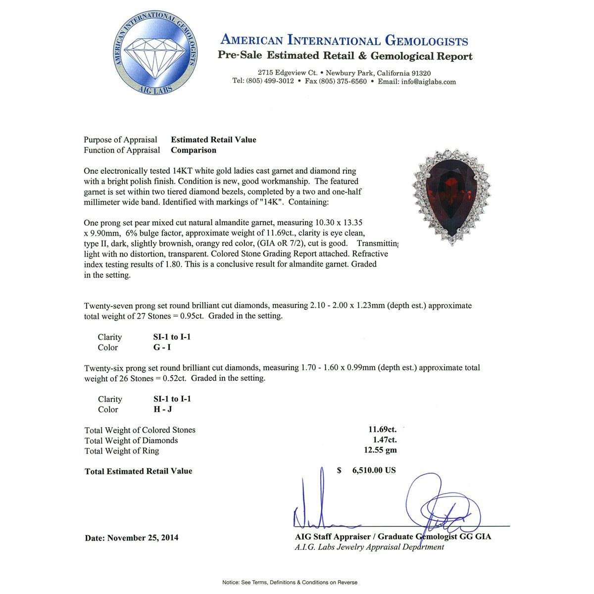 One electronically tested 14KT white gold ladies cast garnet and diamond ring with a bright polish finish. The featured garnet is set within two tiered diamond bezels, completed by a two and one-half millimeter wide band. Identified with markings of "14K". Condition is new, good workmanship. Containing: One prong set pear mixed cut natural almandite garnet, measuring 10.30 x 13.35 x 9.90mm, 6%. bulge factor, approximate weight of 11.69ct., clarity is eye clean, type II, dark, slightly brownish, orangy red color, (GIA oR 7/2), cut is good. Transmitting light with no distortion, transparent. Colored Stone Grading Report attached. Refractive index testing results of 1.80. This is a conclusive result for almandite garnet. Graded in the setting. Twenty-Seven prong set round brilliant cut diamonds, measuring 2.10 - 2.00 x 1.23mm (depth est.) approximate total weight of 27 Stones = 0.95ct. Graded in the setting. Clarity: SI-1 to I-1. Color: G - I Twenty-Six prong set round brilliant cut diamonds, measuring 1.70 - 1.60 x 0.99mm (depth est.) approximate total weight of 26 Stones = 0.52ct. Graded in the setting. Clarity: SI-1 to I-1. Color: H - J. Total Weight of Colored Stones 11.69ct. Total Weight of Diamonds 1.47ct. Total Weight of Ring 12.55 grams. AIG Appraised at $6,510.00.