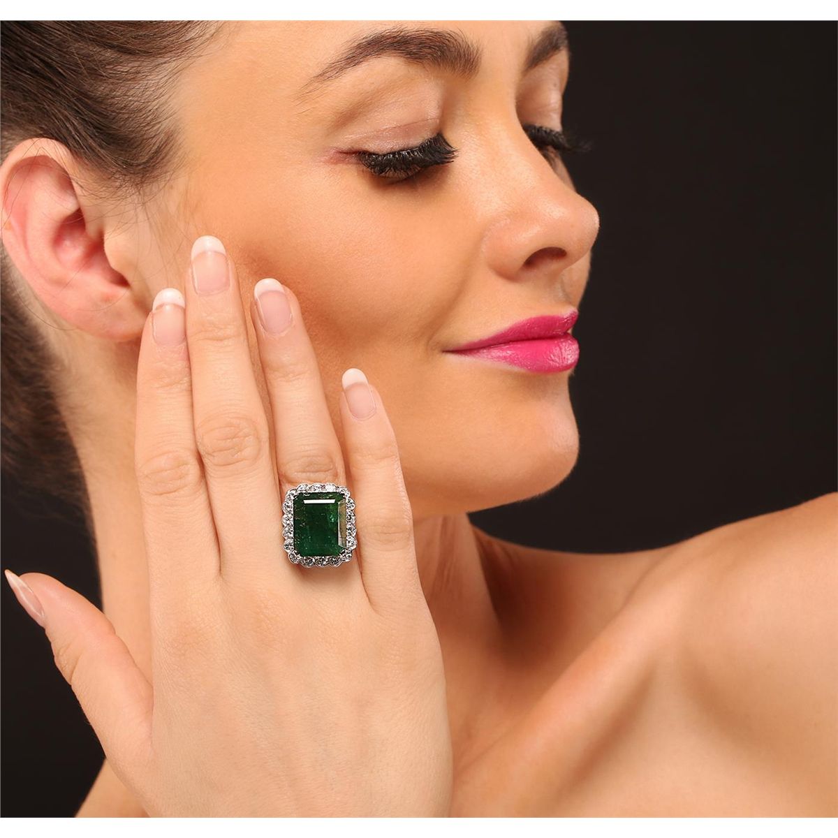 One electronically tested 14KT white gold Ladies combination cast & assembled ring with a bright polish finish. Condition is new. Identified with markings of "14K". Containing: One prong set emerald standard step cut natural emerald, measuring 16.00 x 13.50 x 7.40mm, approximate weight of 11.74ct., clarity is heavily included, type III, dark, moderately strong, green color, (GIA G 7/4), cut is good. Colored gemstones are presumed to have been subjected to commonly used and possible undetectable color/clarity enhancement processes. Twenty-Four prong set round brilliant cut diamonds, measuring 3.00 - 3.00 x 1.80mm (depth est.) approximate total weight of 24 Stones = 2.37ct. Clarity of SI-1 to SI-2, Color of I - J, Cut is Good. Total Weight of Colored Stones 11.74ct. Total Weight of Diamonds 2.37ct. Total Weight of Ring 12.80gm. GGL Appraised at $29,455.00.