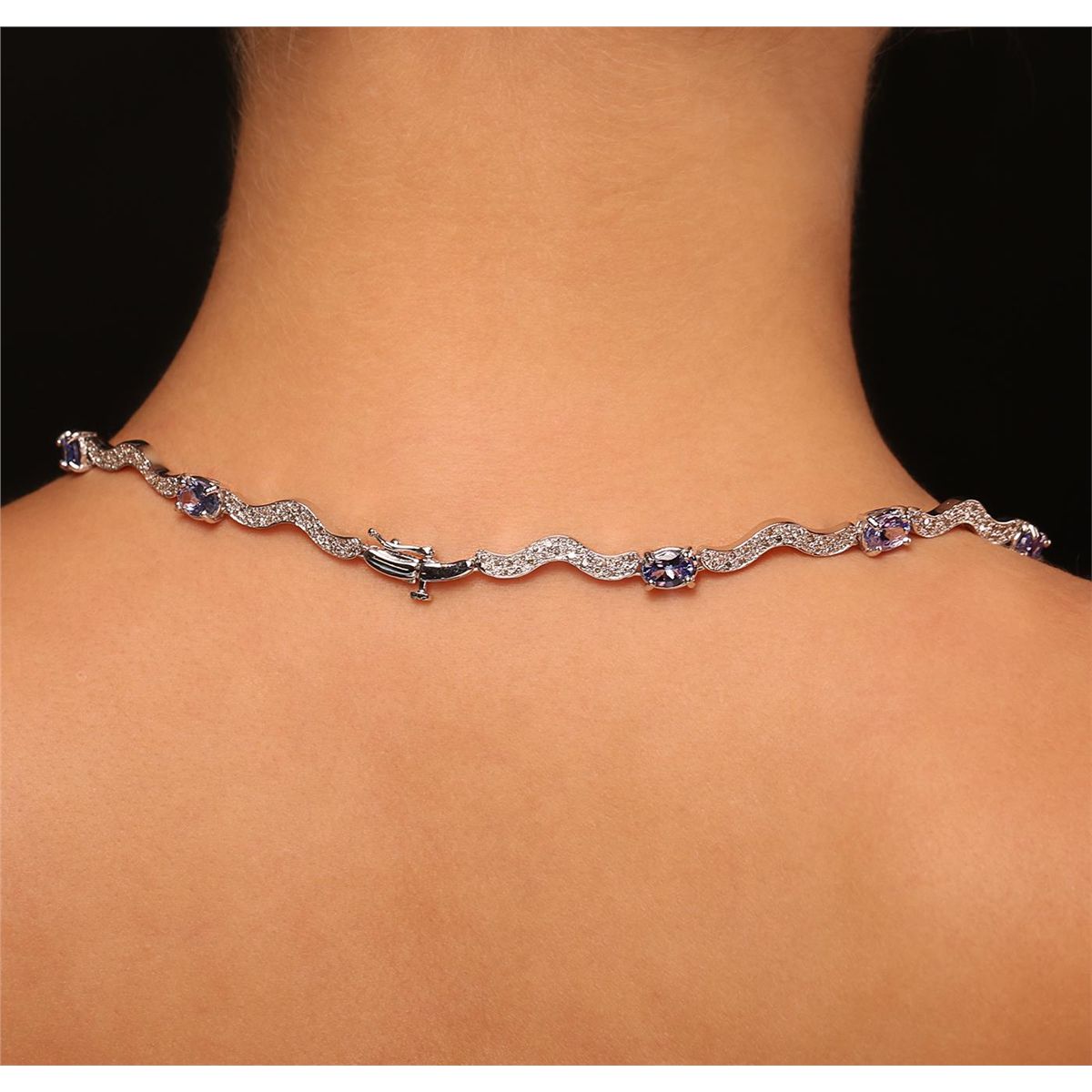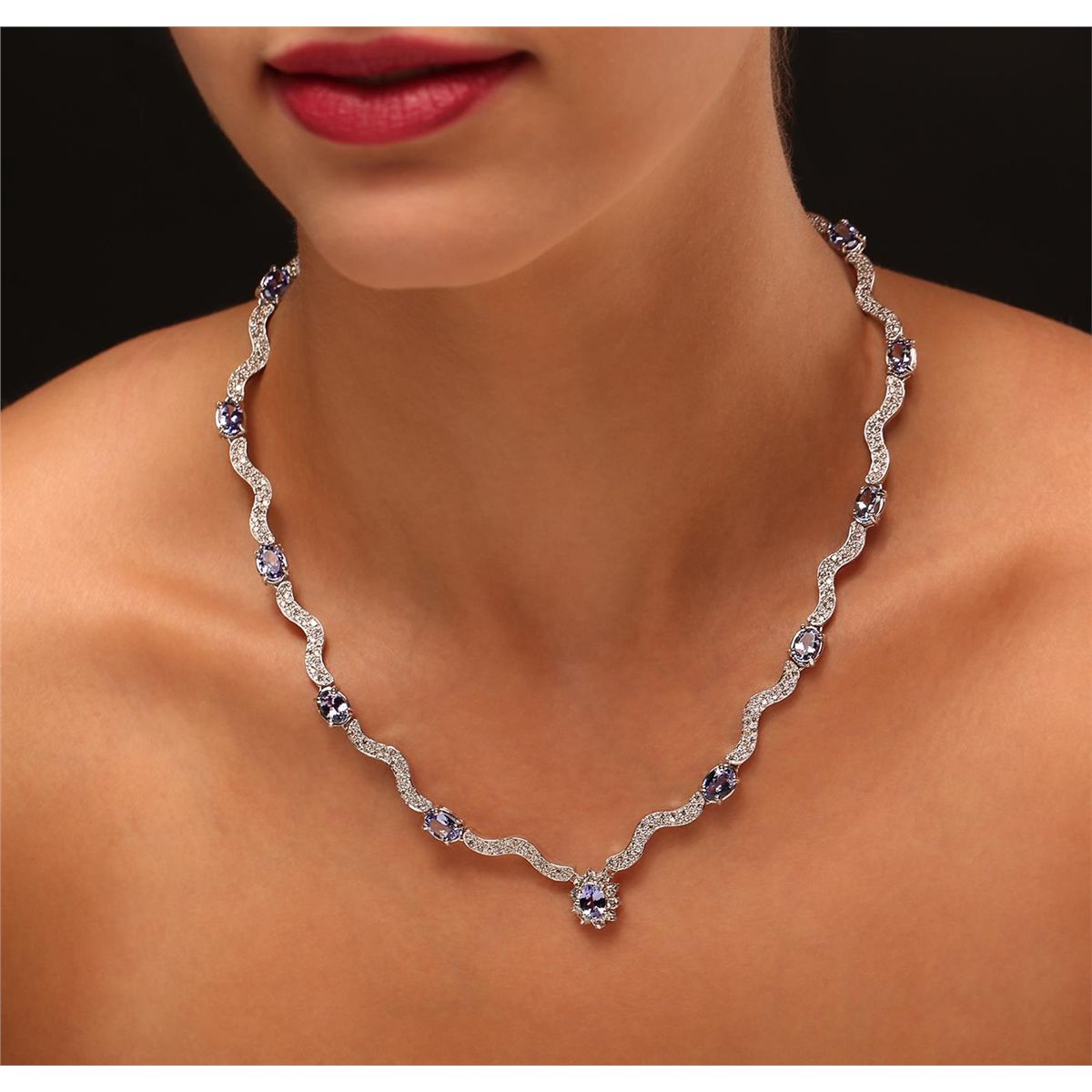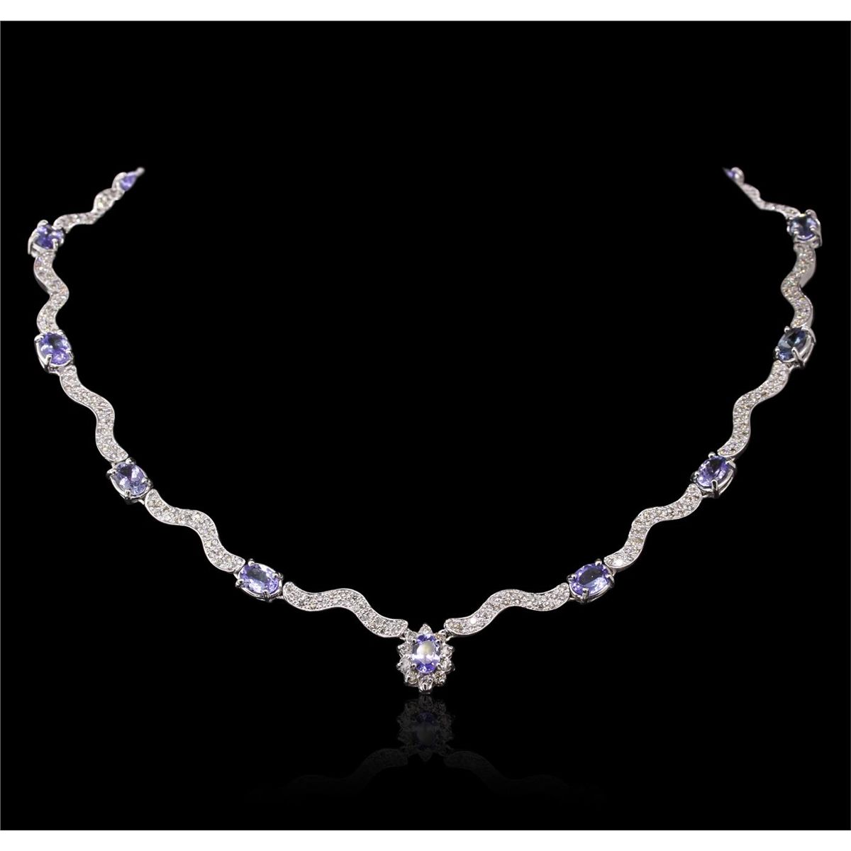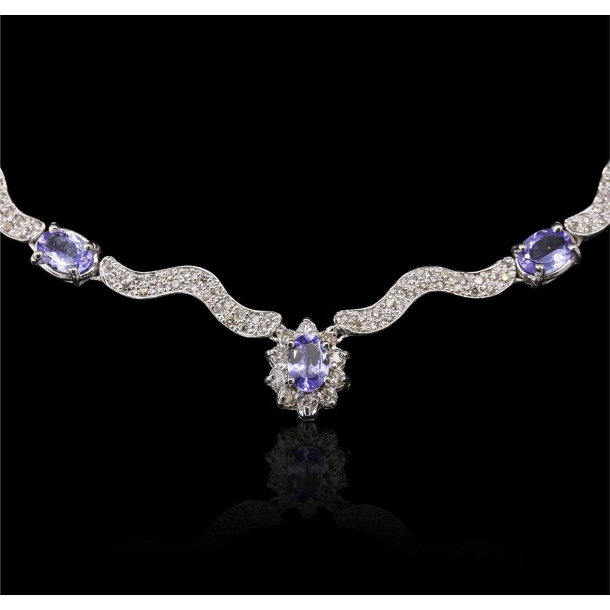 One electronically tested 14KT white gold Ladies combination cast & assembled necklace with a hidden box clasp with a bright polish finish. Condition is new. Measurements: 18" in length. Identified with markings of "14K". Containing: Thirteen prong set oval modified brilliant cut natural tanzanites, measuring 7.07 x 5.25 x 3.41mm, approximate. Total Weight of 11.76ct., clarity is eye clean, type I, medium light, moderately strong, violet color, (GIA V 4/4), cut is good. Colored gemstones are presumed to have been subjected to commonly used color/clarity enhancement processes. Ten prong set round brilliant cut diamonds, measuring 2.50 - 2.50 x 1.50mm (depth est.) approximate. Total Weight of 10 Stones = 0.57ct. Clarity: I-1 to I-2. Color: K - L, Cut is Good. Three Hundred Twenty-Two prong set round brilliant cut diamonds, measuring 1.50 - 1.50 x 0.90mm (depth est.) approximate. Total Weight of 322 Stones = 4.30ct. Clarity: I-1 to I-2. Color: K - L, Cut is Good. Total Weight of Colored Stones 11.76ct. Total Weight of Diamonds 4.87ct. Total Weight of Necklace 33.70 grams. GGL Appraised at $33,795.00.