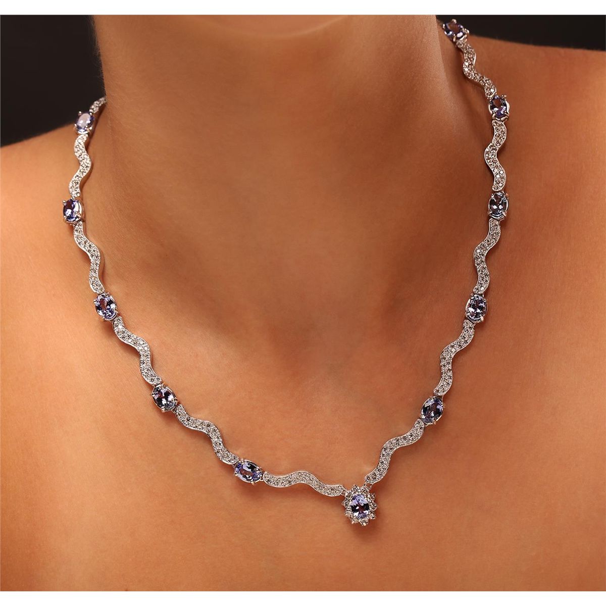 One electronically tested 14KT white gold Ladies combination cast & assembled necklace with a hidden box clasp with a bright polish finish. Condition is new. Measurements: 18" in length. Identified with markings of "14K". Containing: Thirteen prong set oval modified brilliant cut natural tanzanites, measuring 7.07 x 5.25 x 3.41mm, approximate. Total Weight of 11.76ct., clarity is eye clean, type I, medium light, moderately strong, violet color, (GIA V 4/4), cut is good. Colored gemstones are presumed to have been subjected to commonly used color/clarity enhancement processes. Ten prong set round brilliant cut diamonds, measuring 2.50 - 2.50 x 1.50mm (depth est.) approximate. Total Weight of 10 Stones = 0.57ct. Clarity: I-1 to I-2. Color: K - L, Cut is Good. Three Hundred Twenty-Two prong set round brilliant cut diamonds, measuring 1.50 - 1.50 x 0.90mm (depth est.) approximate. Total Weight of 322 Stones = 4.30ct. Clarity: I-1 to I-2. Color: K - L, Cut is Good. Total Weight of Colored Stones 11.76ct. Total Weight of Diamonds 4.87ct. Total Weight of Necklace 33.70 grams. GGL Appraised at $33,795.00.