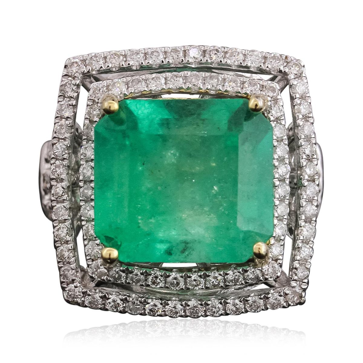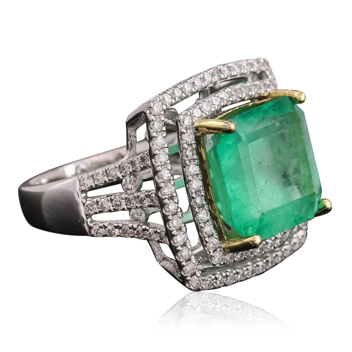 One electronically tested 14KT white gold ladies cast emerald and diamond ring. The featured emerald is set within two tiered diamond bezels supported by diamond set three-way split shoulders, completed by a three millimeter wide band. Bright polish finish with yellow gold accents. Identified with markings of "14K". Condition is new, good workmanship. Containing: One prong set rectangular step cut natural emerald, measuring 12.75 x 11.65 x 9.00mm, 8% bulge factor, approximate weight of 11.78ct., clarity is heavily included, type III, medium dark, very slightly grayish, very slightly bluish green color, (GIA vslbG 6/3), cut is good. Transmitting light with a minimum of distortion, transparent. Naturally occurring internal & external characteristics are present. Indications of oil residue. Colored Stone Grading Report attached. Graded in the setting. One Hundred Twenty prong set round brilliant cut diamonds, measuring 1.40 - 1.30 x 0.81mm (depth est.) approximate total weight of 120 Stones = 1.02ct. Graded in the setting. Clarity: SI-1 to I-1. Color: G - I. Total Weight of Colored Stones 11.78ct. Total Weight of Diamonds 1.02ct. Total Weight of Ring 9.14 grams. AIG Appraised at $30,975.00.