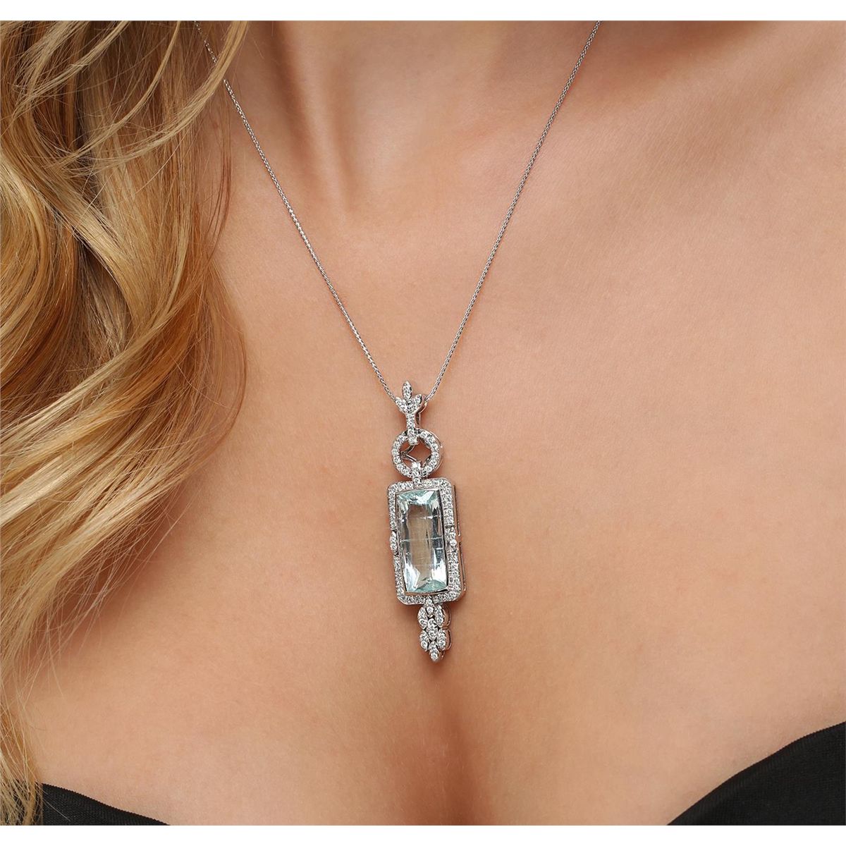 One electronically tested 14KT white gold ladies cast & assembled aquamarine and diamond pendant with chain. Condition is new, good workmanship. The pendant features an aquamarine is set within a diamond bezel, completed by a diamond set bail. The pendant is supported by an eighteen inch length 14KT white gold designer style chain terminating in a lobster claw clasp. Bright polish finish. Identified with markings of "14K". Containing: One bezel set rectangular cushion mixed cut natural aquamarine, measuring 21.50 x 10.00 x 7.00mm, 8%. bulge factor, approximate weight of 11.80ct., clarity is slightly included, type I, medium light, very slightly grayish, greenish blue color, (GIA gB 4/3), cut is good. Transmitting light with a minimum of distortion, transparent. Naturally occurring internal & external characteristics are present. Colored Stone Grading Report attached. Graded in the setting. Seventy-Four prong set round brilliant cut diamonds, measuring 1.50 - 1.40 x 0.87mm (depth est.) approximate. Total Weight of 74 Stones = 0.90ct. Graded in the setting. Clarity: SI-2 to I-2. Color: G - I. Total Weight of Colored Stones 11.80ct. Total Weight of Diamonds 0.90ct. Total Weight of Pendant With Chain 13.80 grams. AIG Appraised at $9,375.00.