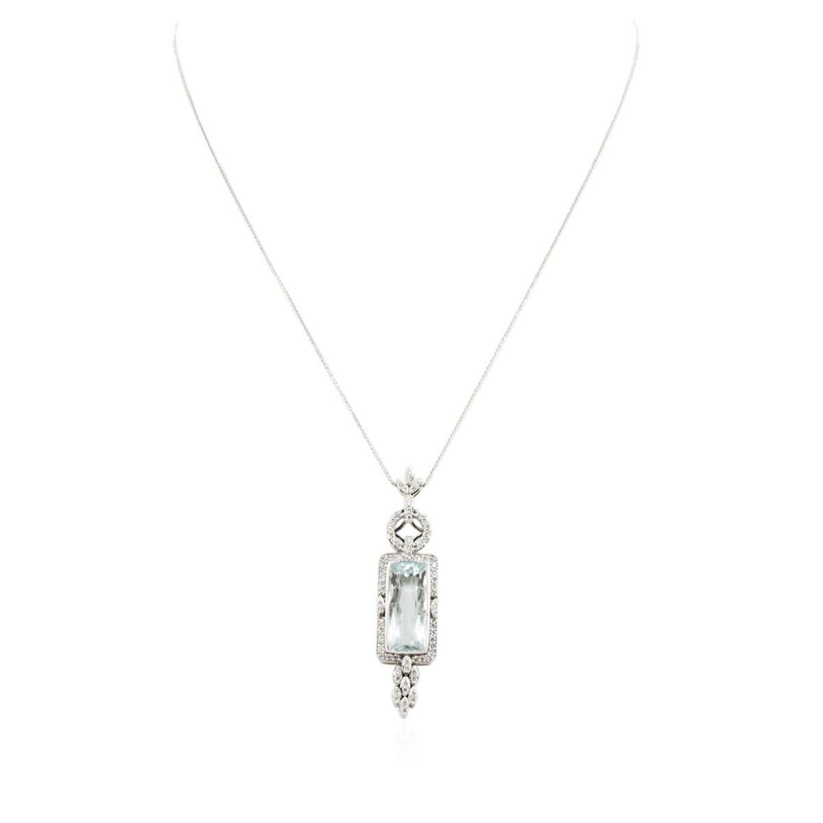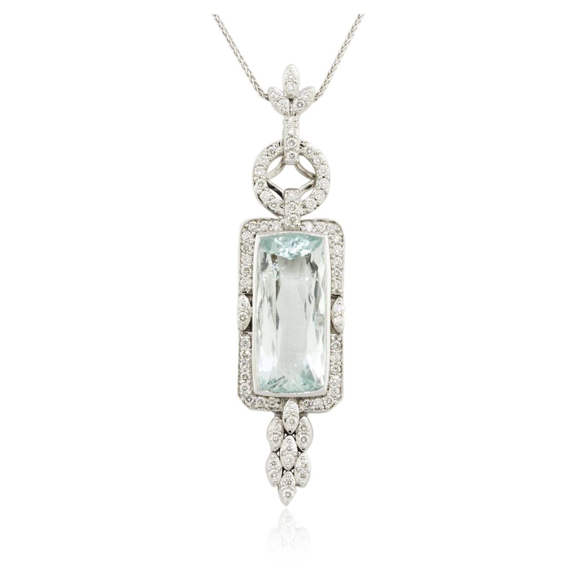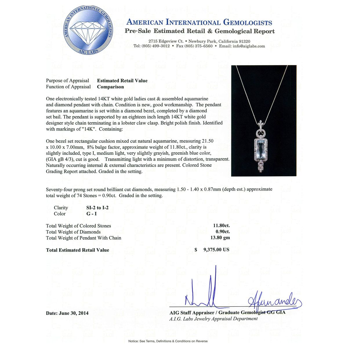 One electronically tested 14KT white gold ladies cast & assembled aquamarine and diamond pendant with chain. Condition is new, good workmanship. The pendant features an aquamarine is set within a diamond bezel, completed by a diamond set bail. The pendant is supported by an eighteen inch length 14KT white gold designer style chain terminating in a lobster claw clasp. Bright polish finish. Identified with markings of "14K". Containing: One bezel set rectangular cushion mixed cut natural aquamarine, measuring 21.50 x 10.00 x 7.00mm, 8%. bulge factor, approximate weight of 11.80ct., clarity is slightly included, type I, medium light, very slightly grayish, greenish blue color, (GIA gB 4/3), cut is good. Transmitting light with a minimum of distortion, transparent. Naturally occurring internal & external characteristics are present. Colored Stone Grading Report attached. Graded in the setting. Seventy-Four prong set round brilliant cut diamonds, measuring 1.50 - 1.40 x 0.87mm (depth est.) approximate. Total Weight of 74 Stones = 0.90ct. Graded in the setting. Clarity: SI-2 to I-2. Color: G - I. Total Weight of Colored Stones 11.80ct. Total Weight of Diamonds 0.90ct. Total Weight of Pendant With Chain 13.80 grams. AIG Appraised at $9,375.00.