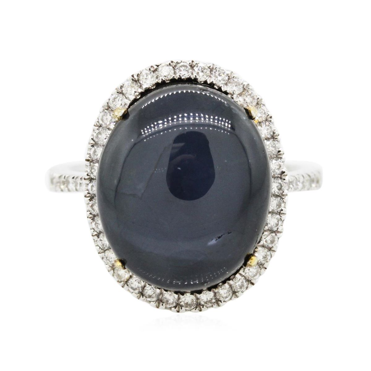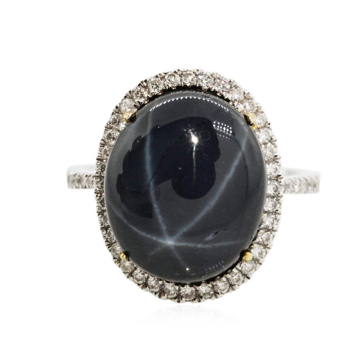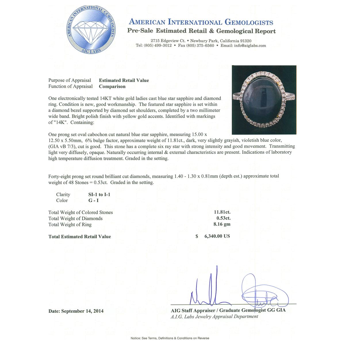 One electronically tested 14KT white gold ladies cast blue star sapphire and diamond ring. The featured star sapphire is set within a diamond bezel supported by diamond set shoulders, completed by a two millimeter wide band. Bright polish finish with yellow gold accents. Identified with markings of "14K". Condition is new, good workmanship. Containing: One prong set oval cabochon cut natural blue star sapphire, measuring 15.00 x 12.50 x 5.50mm, 6% bulge factor, approximate weight of 11.81ct., dark, very slightly grayish, violetish blue color, (GIA vB 7/3), cut is good. This stone has a complete six ray star with strong intensity and good movement. Transmitting light very diffusely, opaque. Naturally occurring internal & external characteristics are present. Indications of laboratory high temperature diffusion treatment. Graded in the setting. Forty-Eight prong set round brilliant cut diamonds, measuring 1.40 - 1.30 x 0.81mm (depth est.) approximate total weight of 48 Stones = 0.53ct. Graded in the setting. Clarity: SI-1 to I-1. Color: G - I. Total Weight of Colored Stones 11.81ct. Total Weight of Diamonds 0.53ct. Total Weight of Ring 8.16 grams. AIG Appraised at $6,340.00.