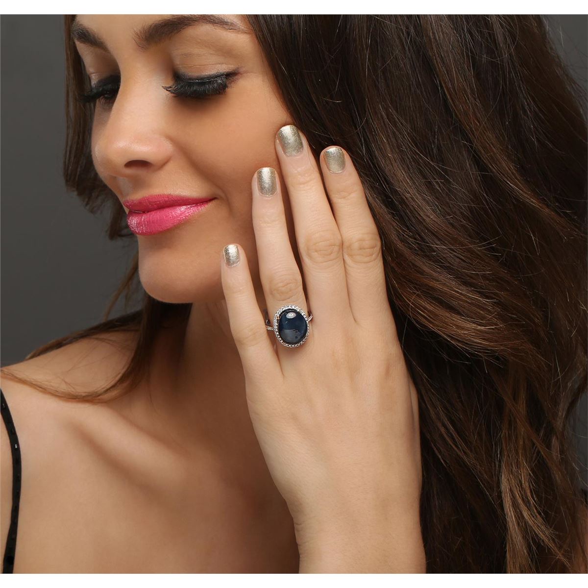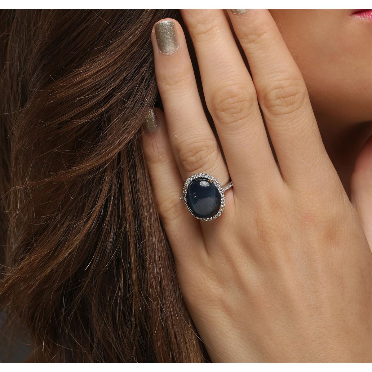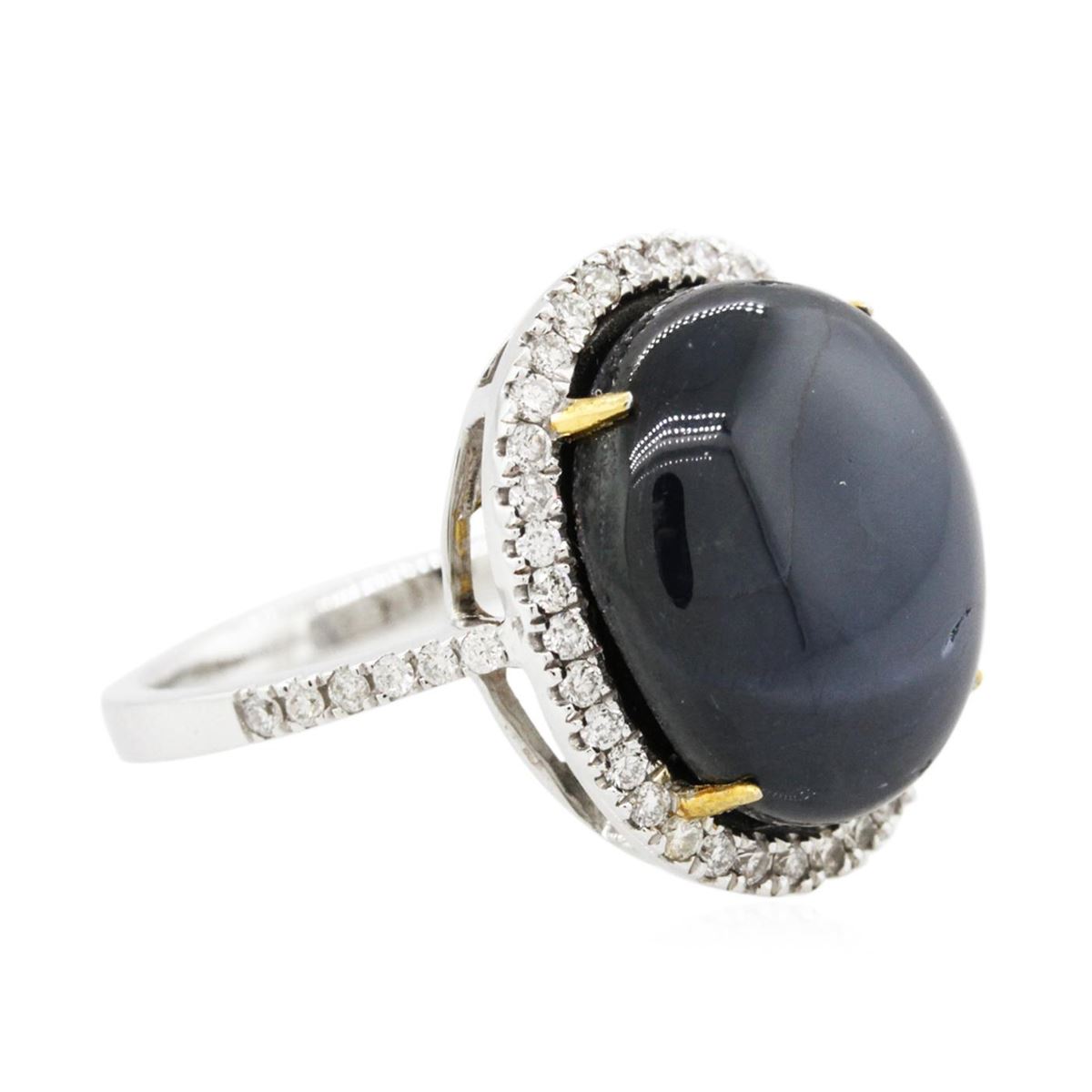 One electronically tested 14KT white gold ladies cast blue star sapphire and diamond ring. The featured star sapphire is set within a diamond bezel supported by diamond set shoulders, completed by a two millimeter wide band. Bright polish finish with yellow gold accents. Identified with markings of "14K". Condition is new, good workmanship. Containing: One prong set oval cabochon cut natural blue star sapphire, measuring 15.00 x 12.50 x 5.50mm, 6% bulge factor, approximate weight of 11.81ct., dark, very slightly grayish, violetish blue color, (GIA vB 7/3), cut is good. This stone has a complete six ray star with strong intensity and good movement. Transmitting light very diffusely, opaque. Naturally occurring internal & external characteristics are present. Indications of laboratory high temperature diffusion treatment. Graded in the setting. Forty-Eight prong set round brilliant cut diamonds, measuring 1.40 - 1.30 x 0.81mm (depth est.) approximate total weight of 48 Stones = 0.53ct. Graded in the setting. Clarity: SI-1 to I-1. Color: G - I. Total Weight of Colored Stones 11.81ct. Total Weight of Diamonds 0.53ct. Total Weight of Ring 8.16 grams. AIG Appraised at $6,340.00.