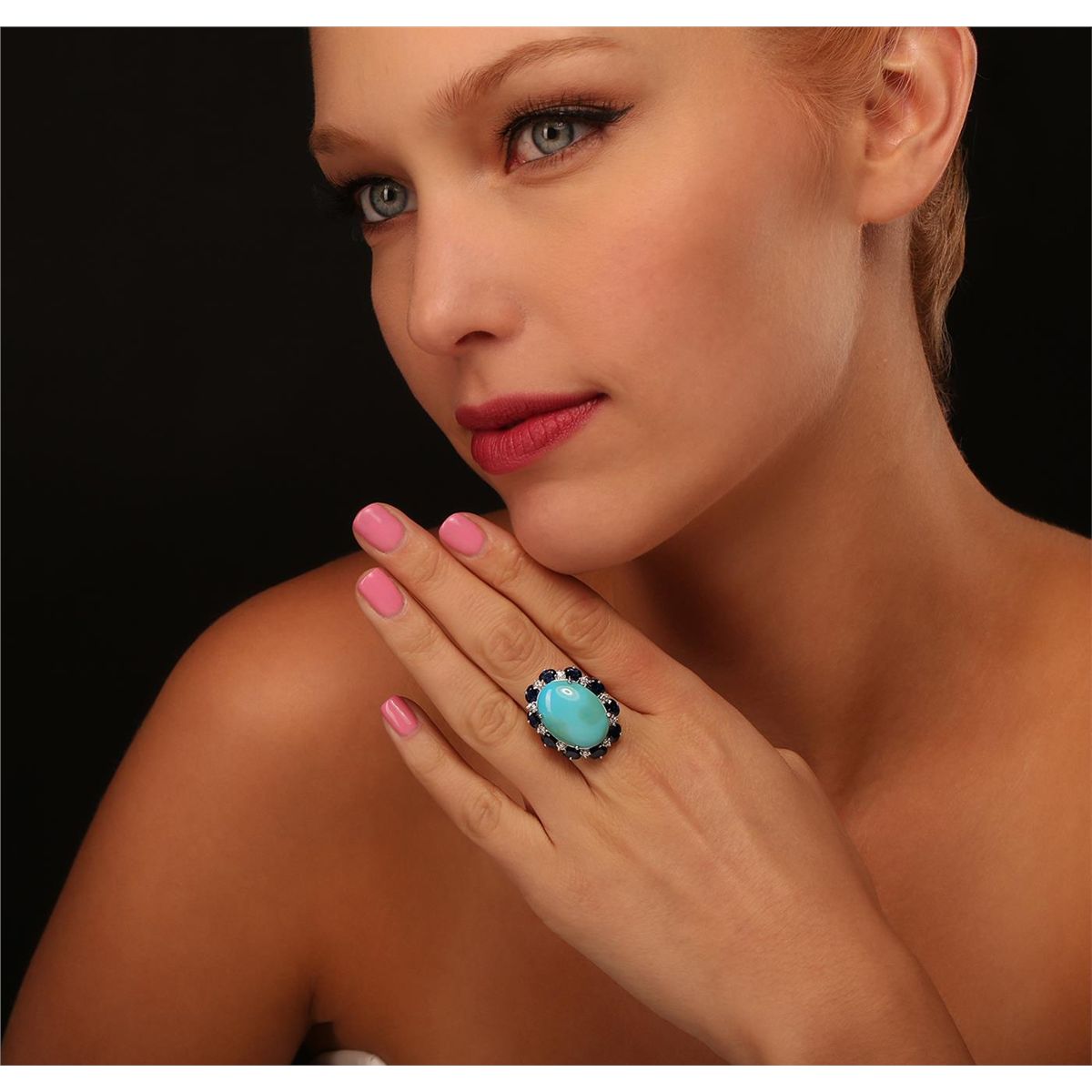 One electronically tested 14KT white gold Ladies combination cast & assembled ring with a bright polish finish. Condition is new. Identified with markings of "14K". Containing: One prong set oval cabochon cut natural turquoise, measuring 20.89 x 15.19 x 5.00mm, approximate weight of 11.82ct., clarity is heavily included, light, moderately strong, blue color, (GIA B 3/4), cut is good. Ten prong set oval modified brilliant cut natural blue sapphires, measuring 4.80 x 3.50 x 2.28mm, approximate. Total Weight of 4.00ct., clarity is eye clean, medium dark, moderately strong, blue color, (GIA B 6/4), cut is very good. Colored gemstones are presumed to have been subjected to commonly used color/clarity enhancement processes. Ten prong set round brilliant cut diamonds, measuring 1.50 - 1.50 x 0.90mm (depth est.) approximate. Total Weight of 10 Stones = 0.12ct. Clarity: SI-1 to SI-2. Color: H - I, Cut is Good. Total Weight of Colored Stones 15.82ct. Total Weight of Diamonds 0.12ct. Total Weight of Ring 10.40 grams. GGL Appraised at $5,300.00.