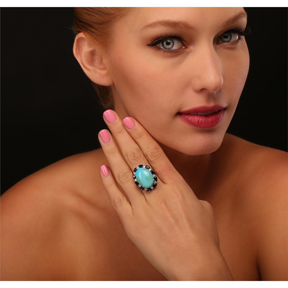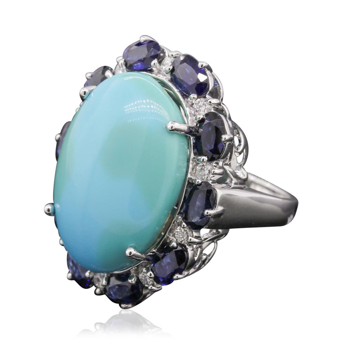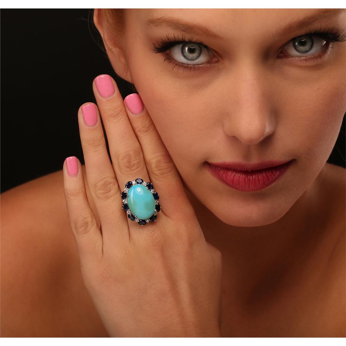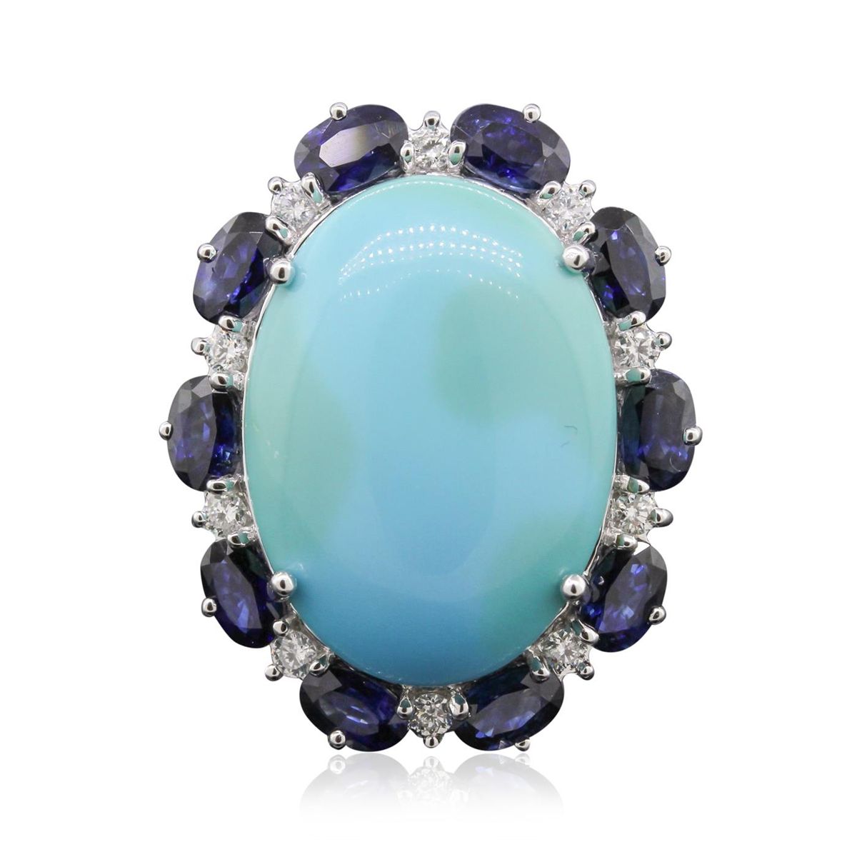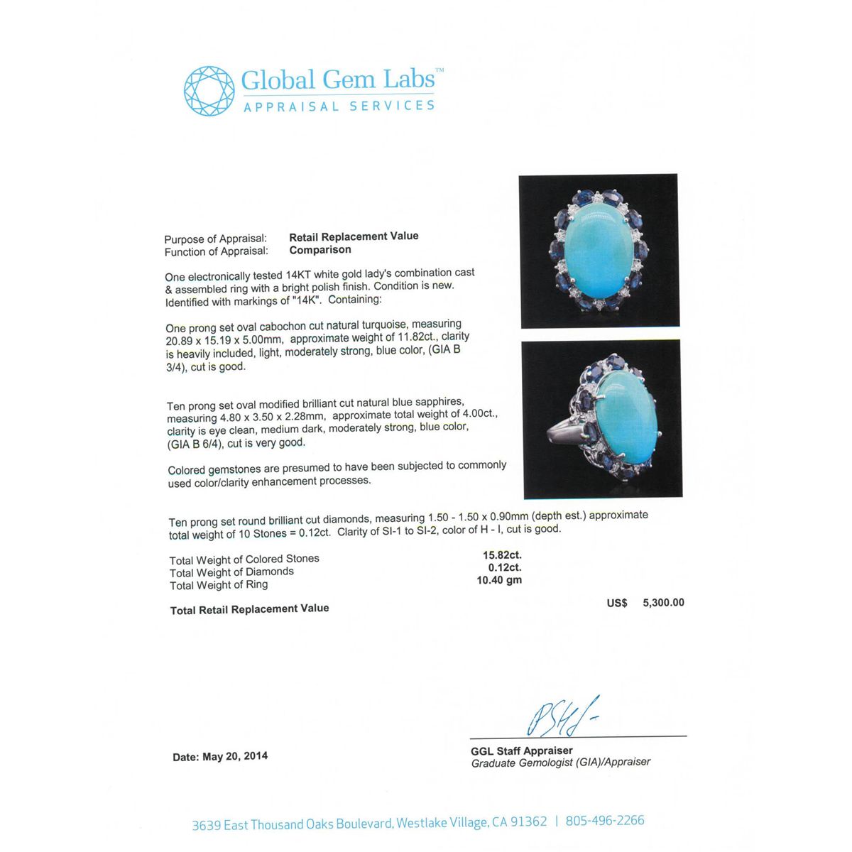 One electronically tested 14KT white gold Ladies combination cast & assembled ring with a bright polish finish. Condition is new. Identified with markings of "14K". Containing: One prong set oval cabochon cut natural turquoise, measuring 20.89 x 15.19 x 5.00mm, approximate weight of 11.82ct., clarity is heavily included, light, moderately strong, blue color, (GIA B 3/4), cut is good. Ten prong set oval modified brilliant cut natural blue sapphires, measuring 4.80 x 3.50 x 2.28mm, approximate. Total Weight of 4.00ct., clarity is eye clean, medium dark, moderately strong, blue color, (GIA B 6/4), cut is very good. Colored gemstones are presumed to have been subjected to commonly used color/clarity enhancement processes. Ten prong set round brilliant cut diamonds, measuring 1.50 - 1.50 x 0.90mm (depth est.) approximate. Total Weight of 10 Stones = 0.12ct. Clarity: SI-1 to SI-2. Color: H - I, Cut is Good. Total Weight of Colored Stones 15.82ct. Total Weight of Diamonds 0.12ct. Total Weight of Ring 10.40 grams. GGL Appraised at $5,300.00.