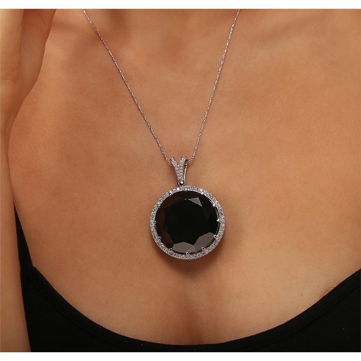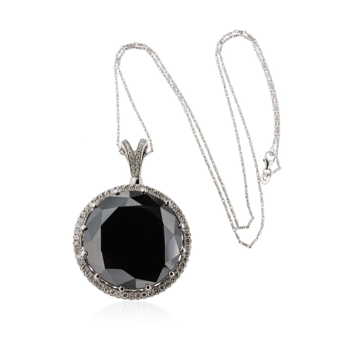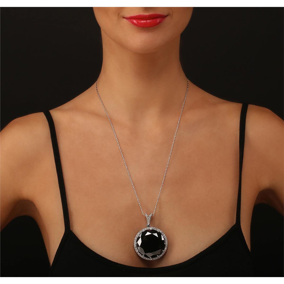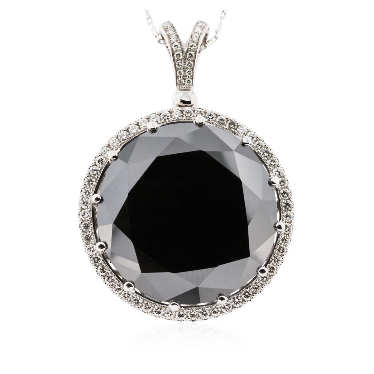 One electronically tested 14KT white gold ladies cast & assembled black and white diamond pendant with chain. Condition is new, good workmanship. The pendant features a black diamond set within a white diamond bezel, completed by a diamond set split bail. The pendant is supported by a twenty-two inch length designer style chain, terminating in a lobster claw clasp. Area measurements 2.25 x 1.50 inch. Bright polish finish. Identified with markings of "14K". Containing: One prong set round brilliant cut diamond, measuring 33.00 - 33.00 x 16.00mm (depth est.), 8.00.%. GTCF approximate weight of 114.88ct. Indications of multiple laboratory enhancements. The specific gravity of black diamond is 3.120 to 3.165. Diamond tester results are non reactive. Graded in the setting. Clarity Déclassé‚. Color: Fancy Black; Irradiated. Depth: 48.5%. Table: 66.7%. Fifty-Five prong set round brilliant cut diamonds, measuring 2.10 - 2.00 x 1.23mm (depth est.) approximate. Total Weight of 55 Stones = 1.83ct. Graded in the setting. Clarity: VS-1 to SI-1. Color: G - I Sixteen bead set round brilliant cut diamonds, measuring 1.60 - 1.40 x 0.90mm (depth est.) approximate. Total Weight of 16 Stones = 0.26ct. Graded in the setting. Clarity: VS-2 to SI-2. Color: G - I. Total Weight of Diamonds116.97ct. Total Weight of Pendant With Chain 55.30 grams. AIG Appraised at $26,815.00.