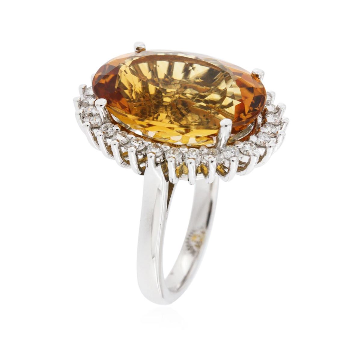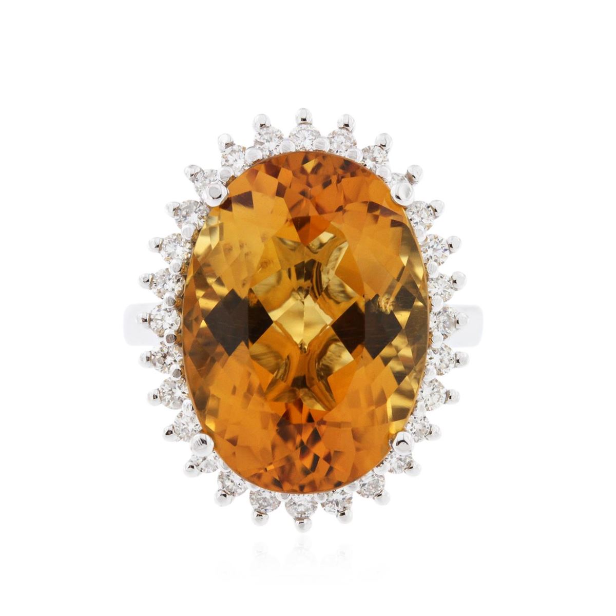 One electronically tested 14KT white gold ladies combination cast & assembled citrine and diamond ring with a bright polish finish. Identified with markings of "14K". Condition is new. Containing: One prong set oval modified brilliant cut natural citrine GGL Appraised at $3,870.00.